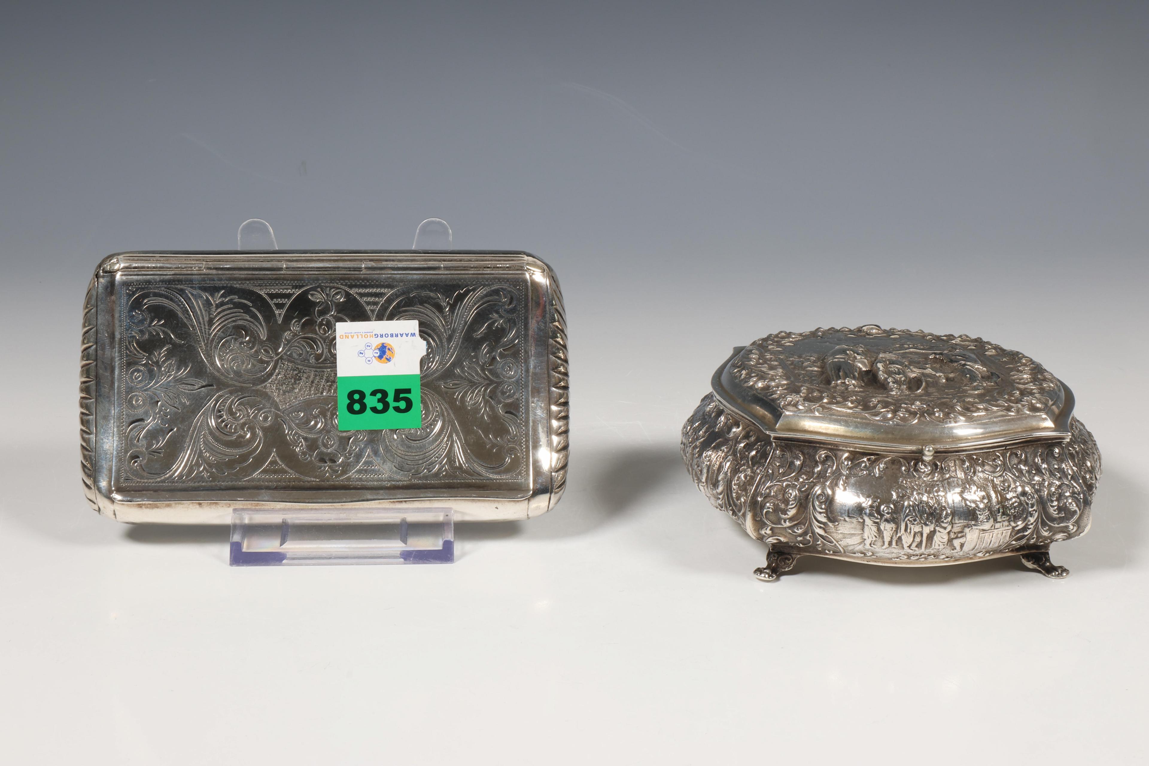 langwerpig ligt gebogen zaktabaksdoos met decoratieve graveringen, mt. Wed. H.J.