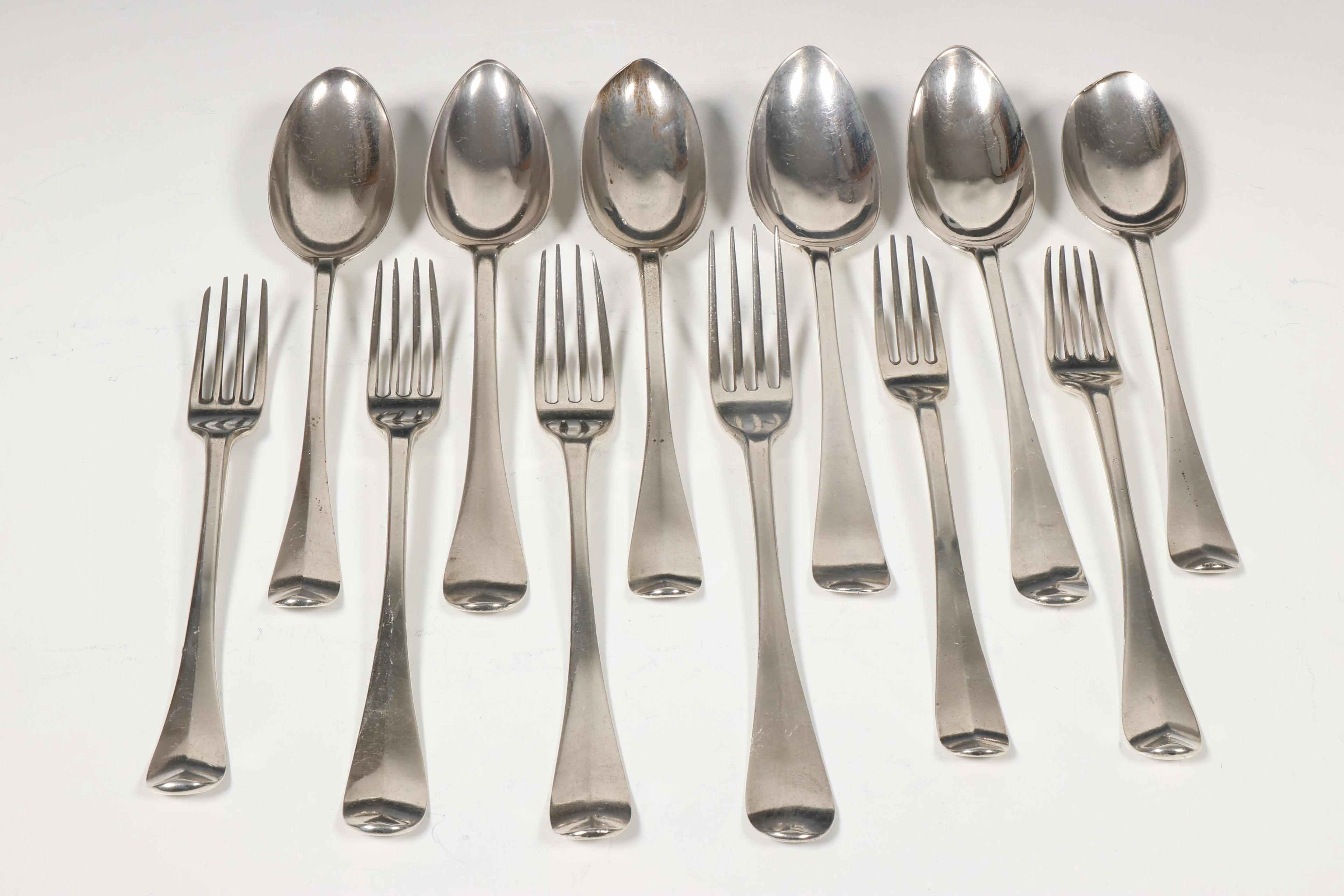 model Hollands glad met kam diverse meestertekens, waarbij R. Helweg, Amsterdam, provinciale leeuw, verschillende jaarletters o.a. 1780/1794/1795, een vork met lettergravure, mt. Dirk van Goorberg Delft 1774, 1e gehalte,