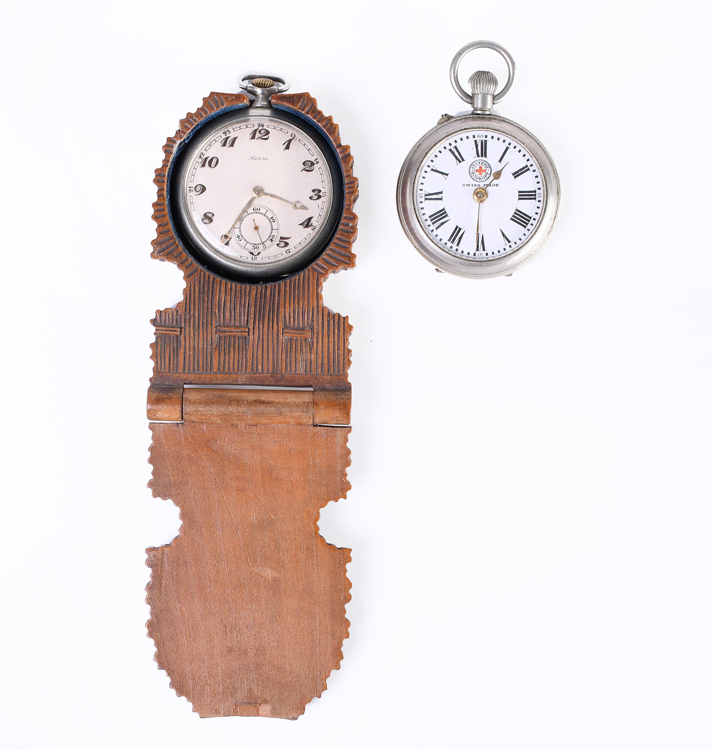 Two silver remontoir watches. One Systeme Roskopf and one Alpina in wooden box with wreath