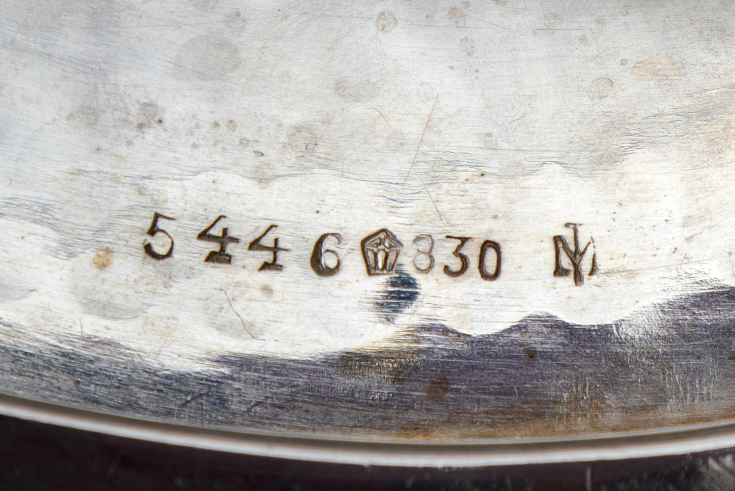 gehamerd bloemvormig model met zes gebogen kaarsenhouders met bobeches verbonden aan middenstuk bekroond met bol, mt. Adolf Mogler Heilbronn ca. 1920- ca. 1930, genummerd 5446 en gemerkt gehalte 830, 2e gehalte, getekend Kleine buitenlandse werken, 1906-1953,