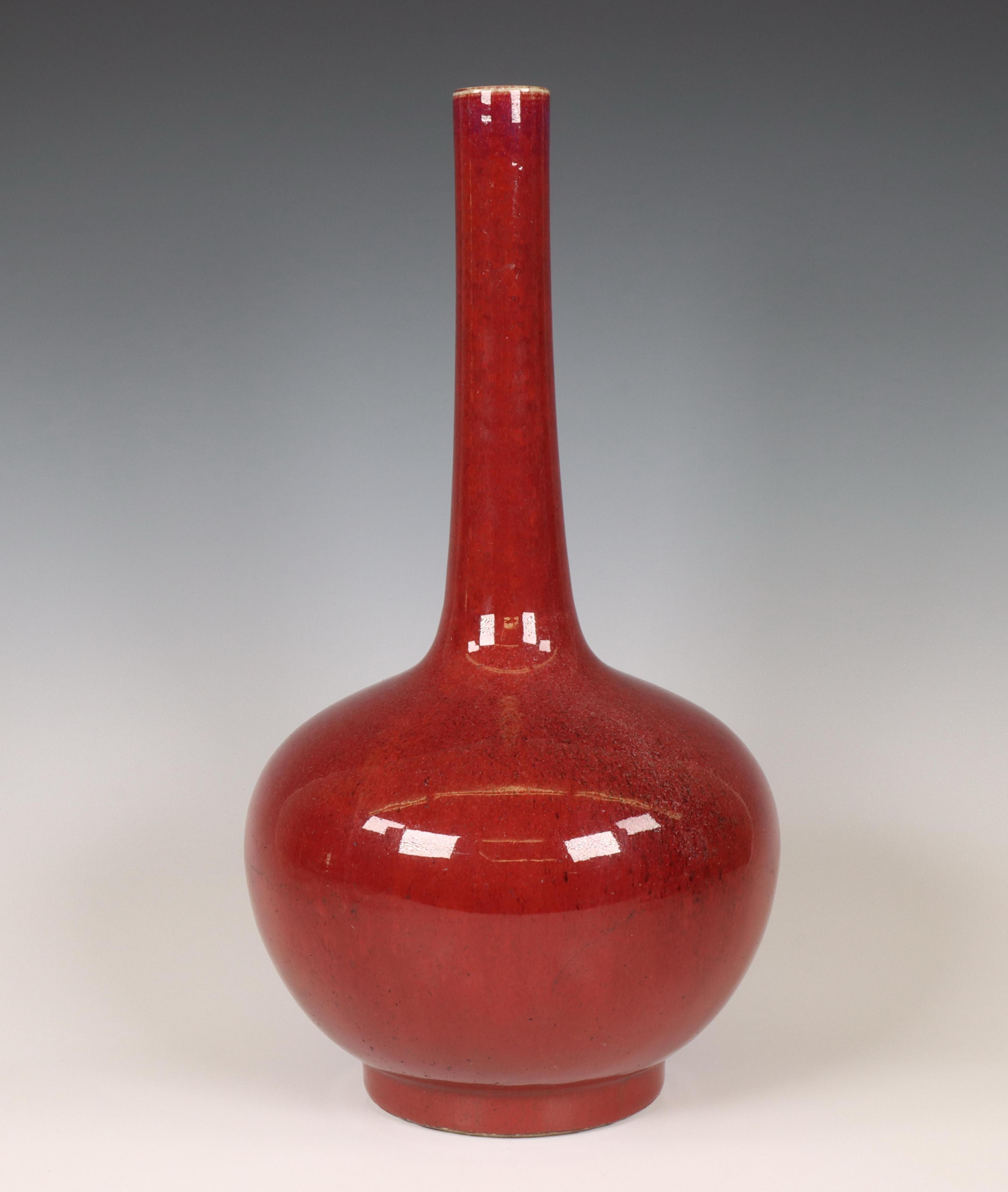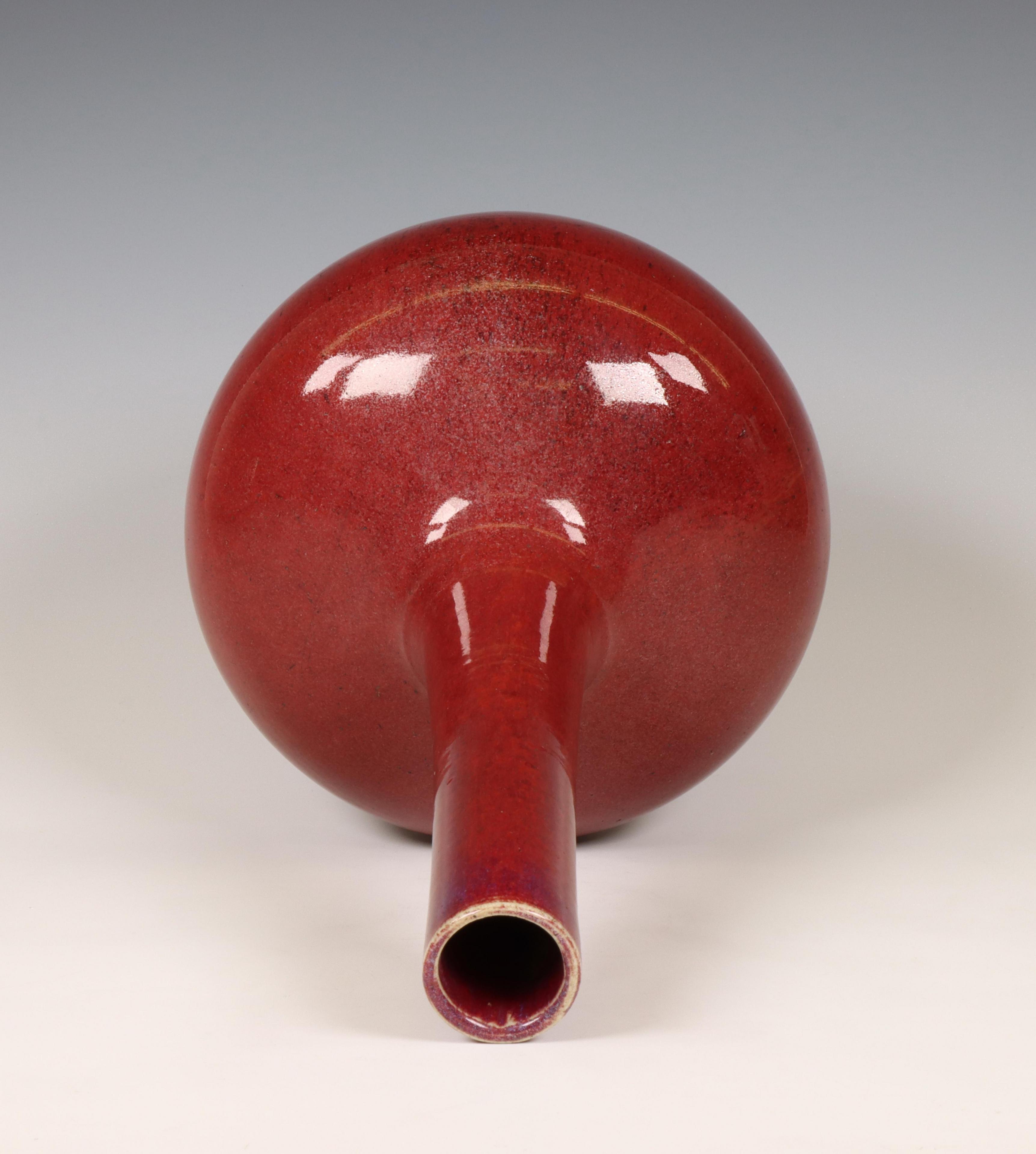 the bulbous body and tall neck covered in a strawberry-red glaze thinning to mushroom to the neck
