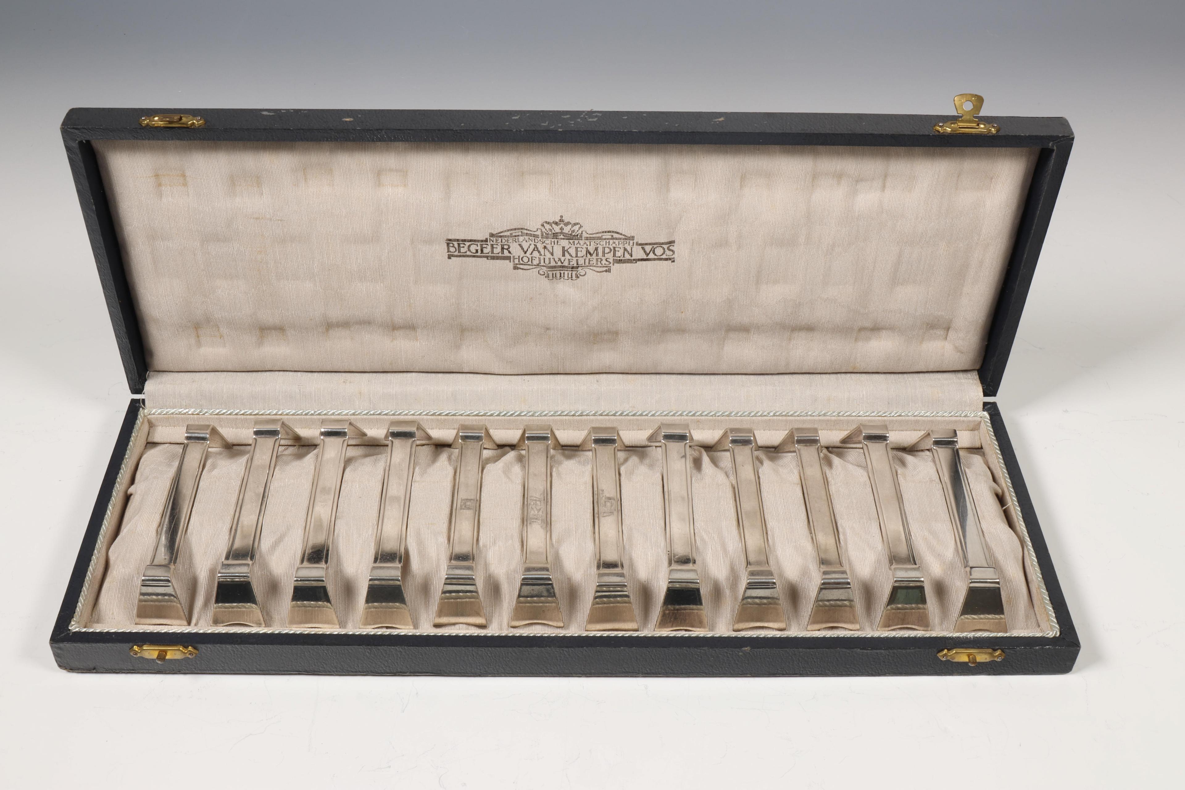 rond model met filetrand, mt. Fa. Van Kempen, Begeer & Vos Zeist 1931, 2e gehalte, messenleggers idem meesterteken en getekend gehaltemerk zwaardje, beide in cassettes,
