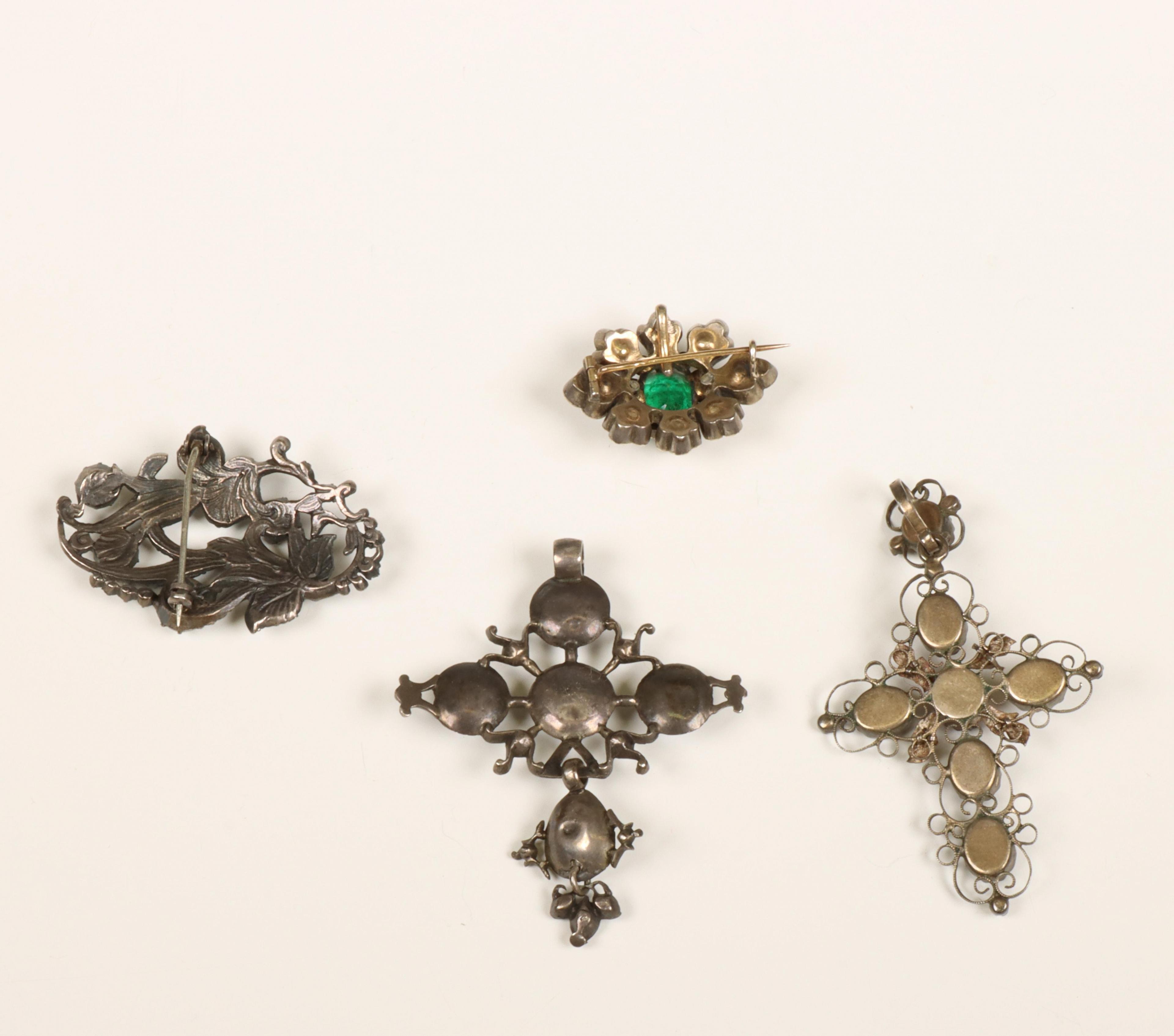Twee broches en twee kruisvormige hangers. Allen bezet met paste.