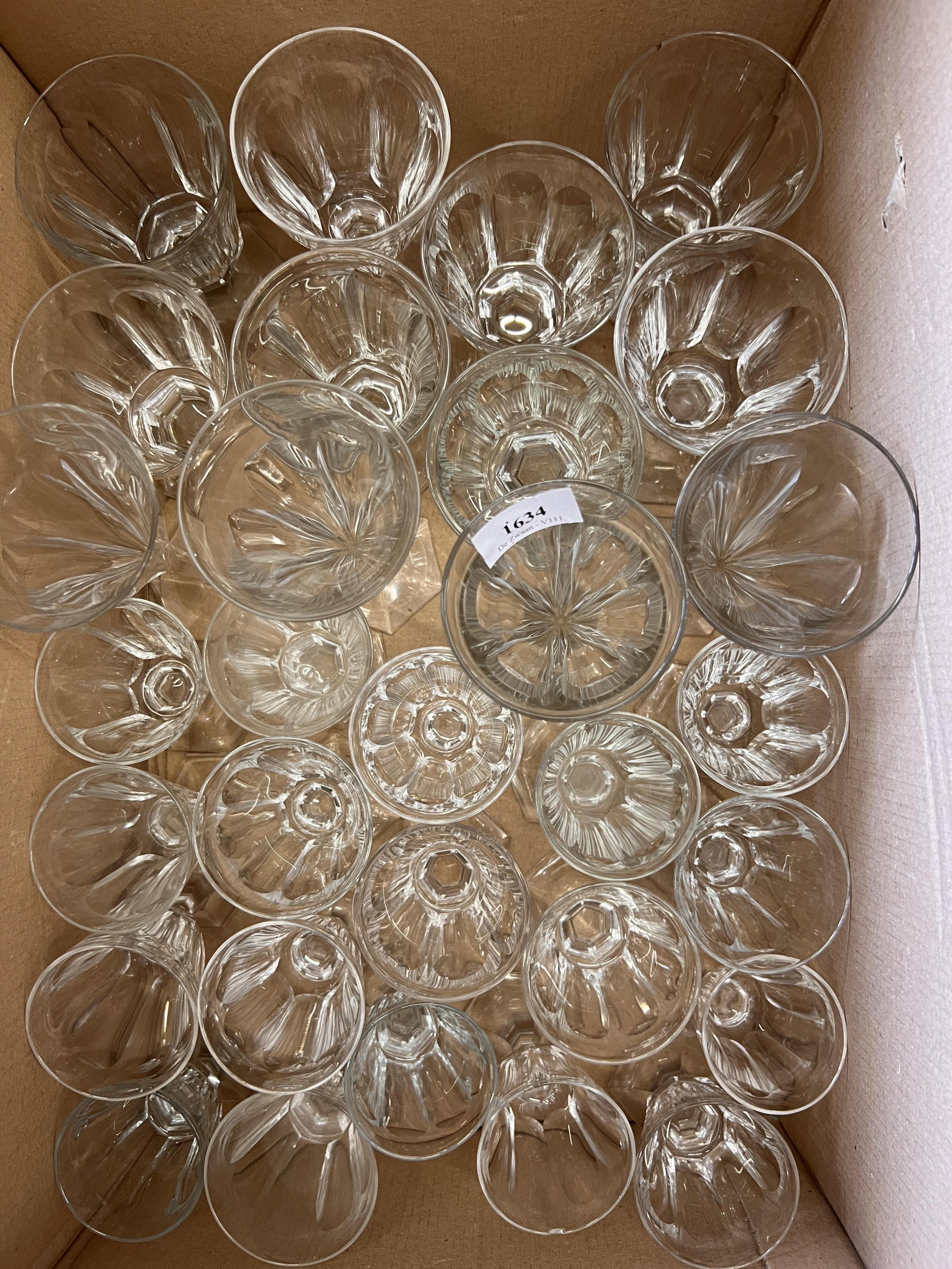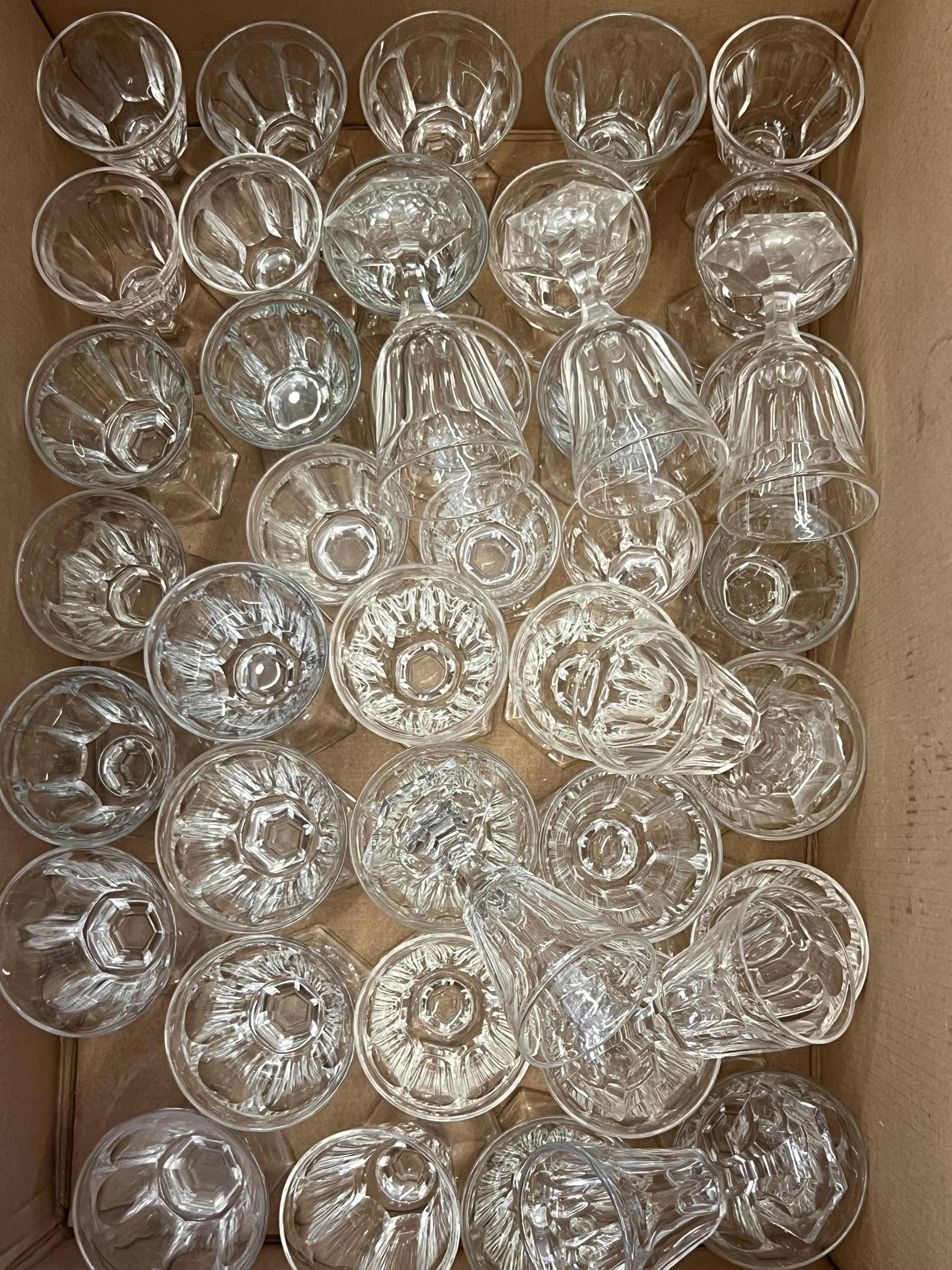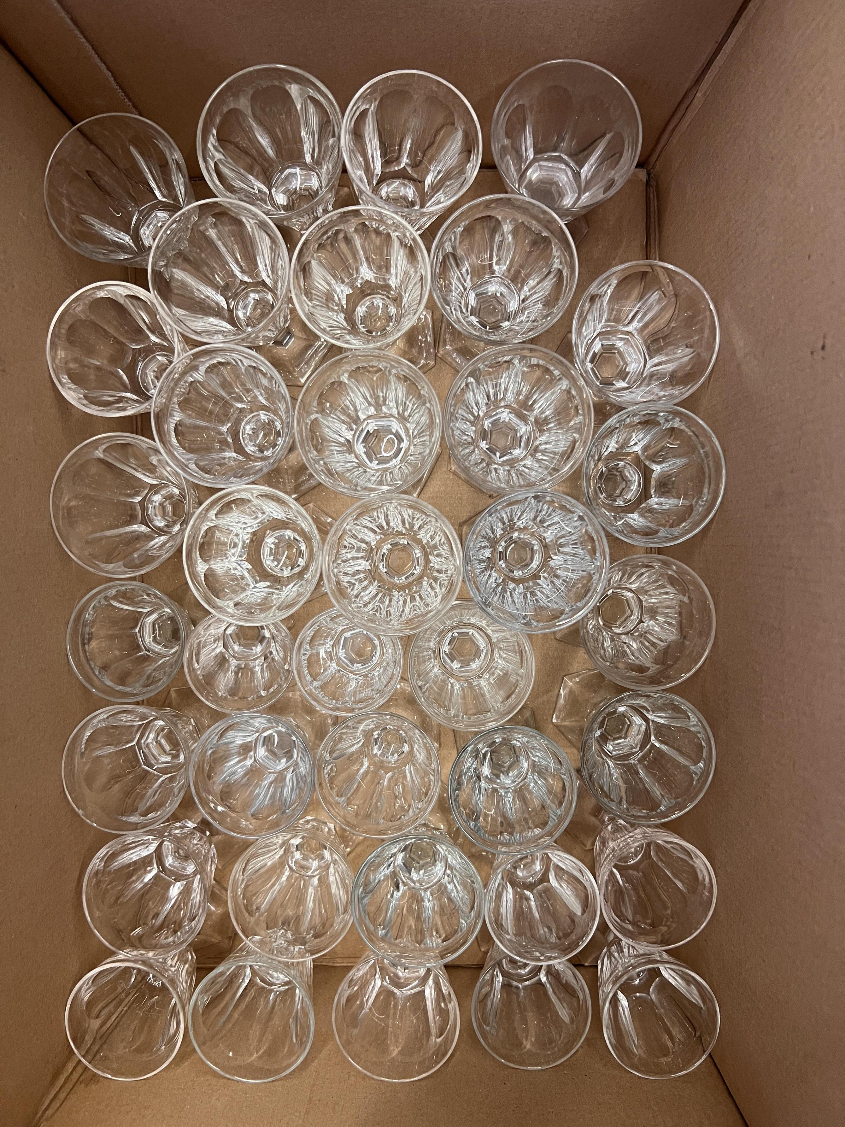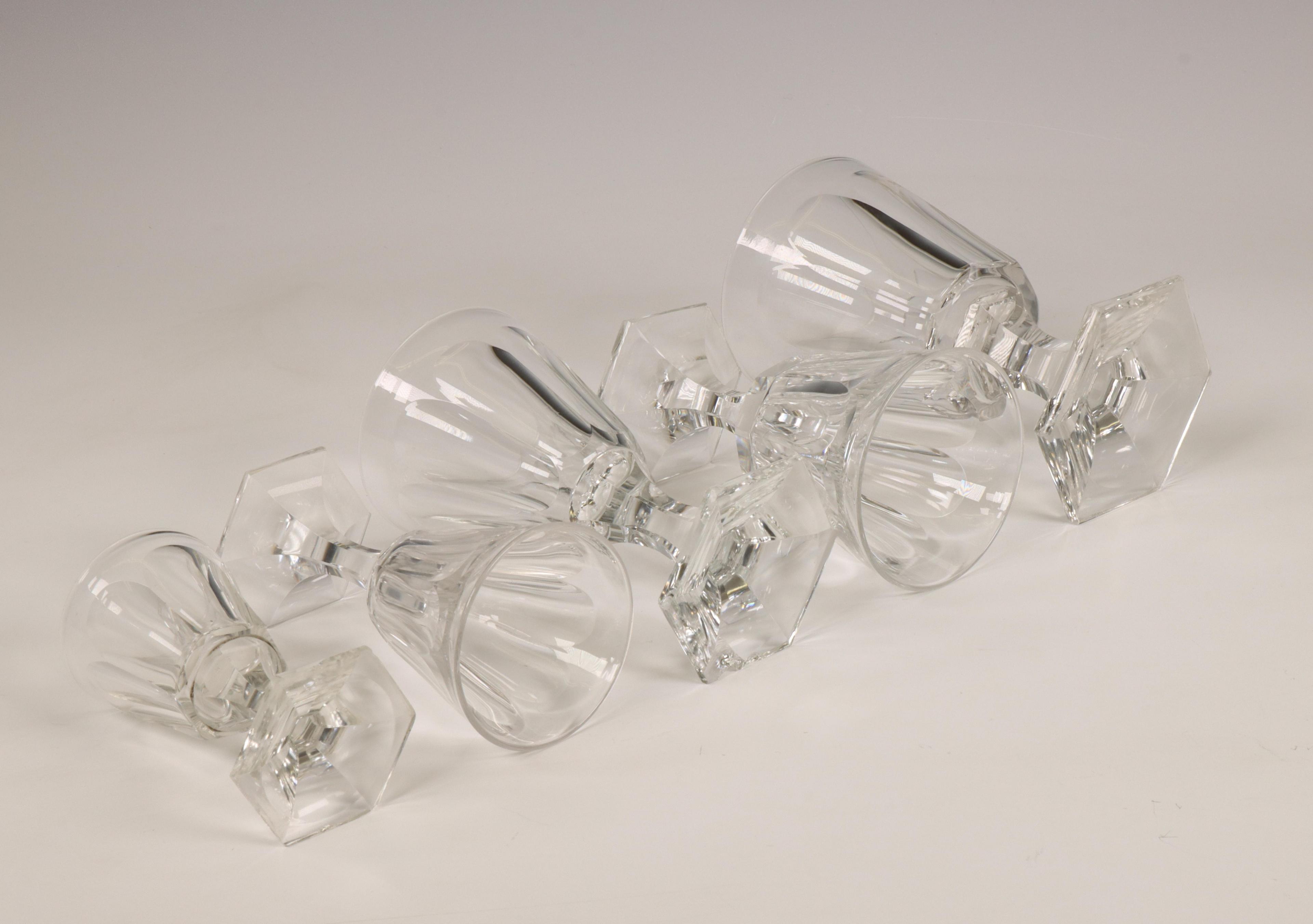 Allen uitgevoerd met kantige voet. Bestaand uit negen rode wijn glazen, zevenendertig witte wijn glazen, eenenveertig port glazen, veertien likeur glazen en vier champagne glazen. (enige chips).
