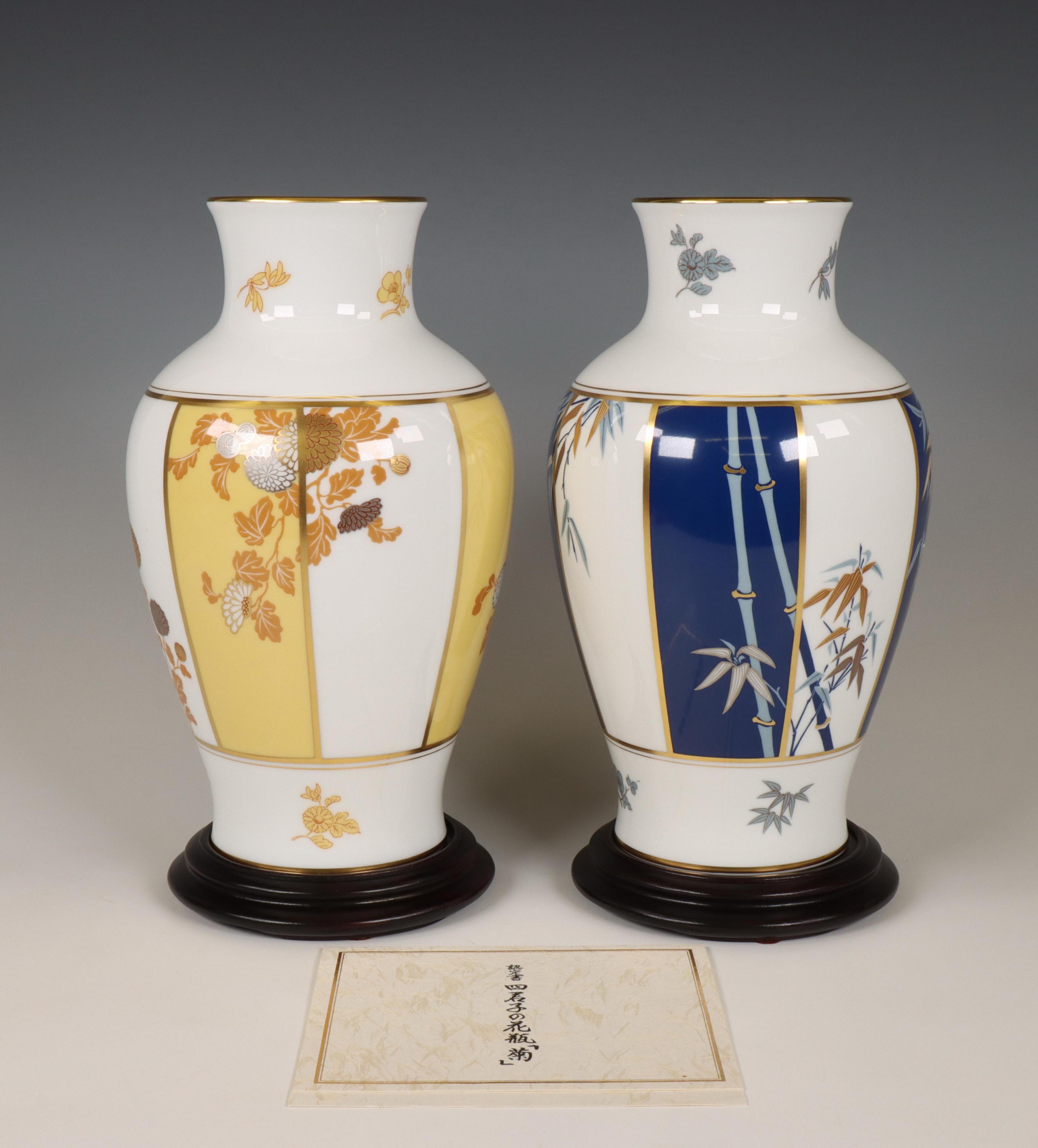 een vaas gedecoreerd met chrysanten en de andere met bamboe', beide in originele doos en een met certificaat