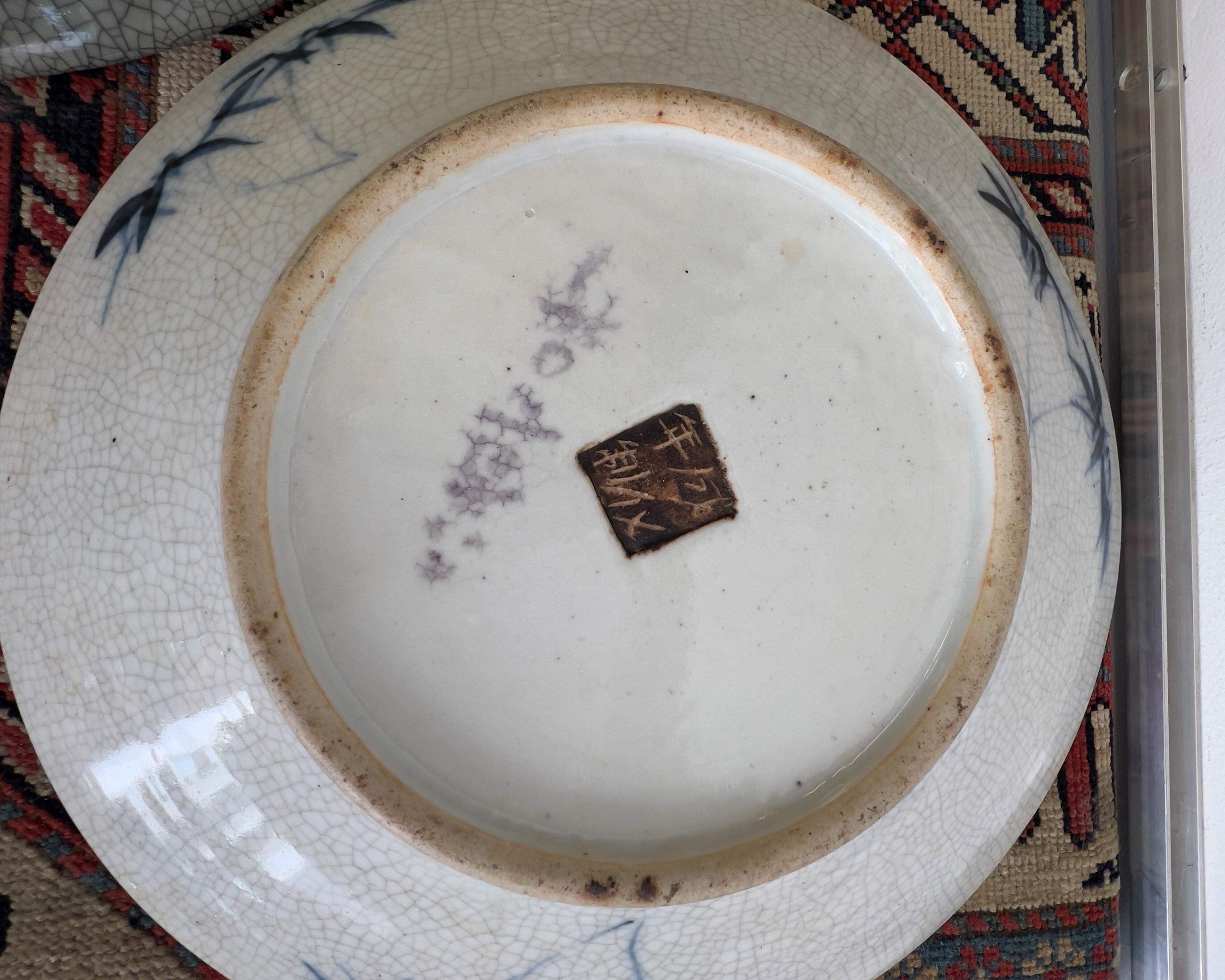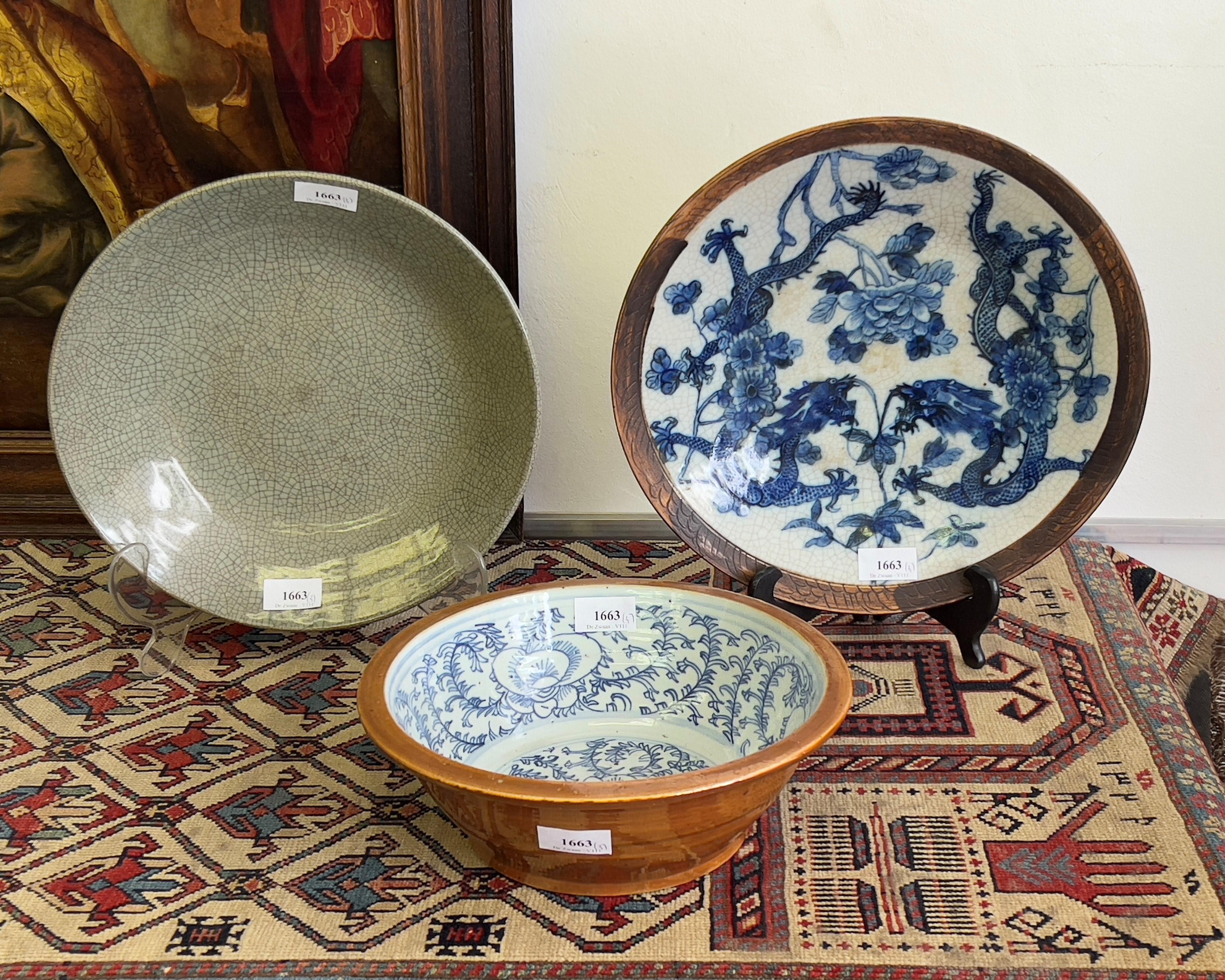 een blauw-wit en gedecoreerd met ene draak, een blauw-wit en café-au-lait geglazuurde kom en een gecracqueleerde celadon schaal