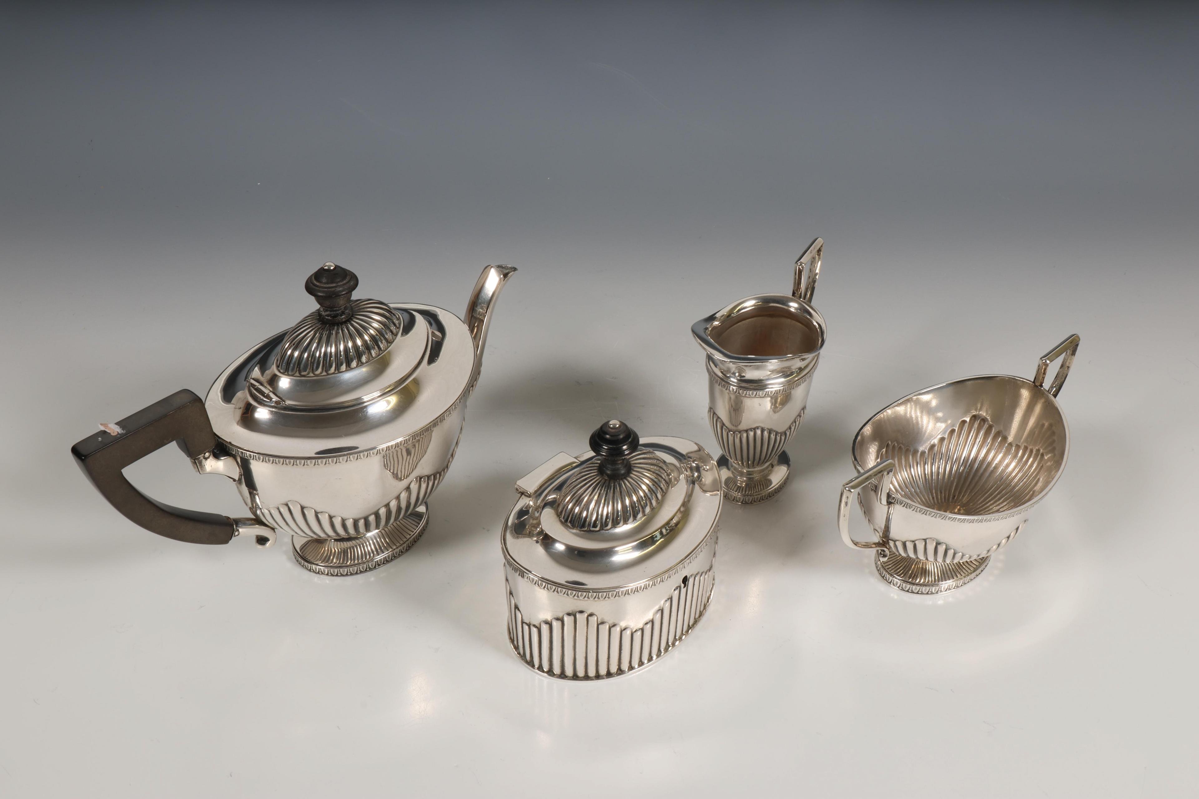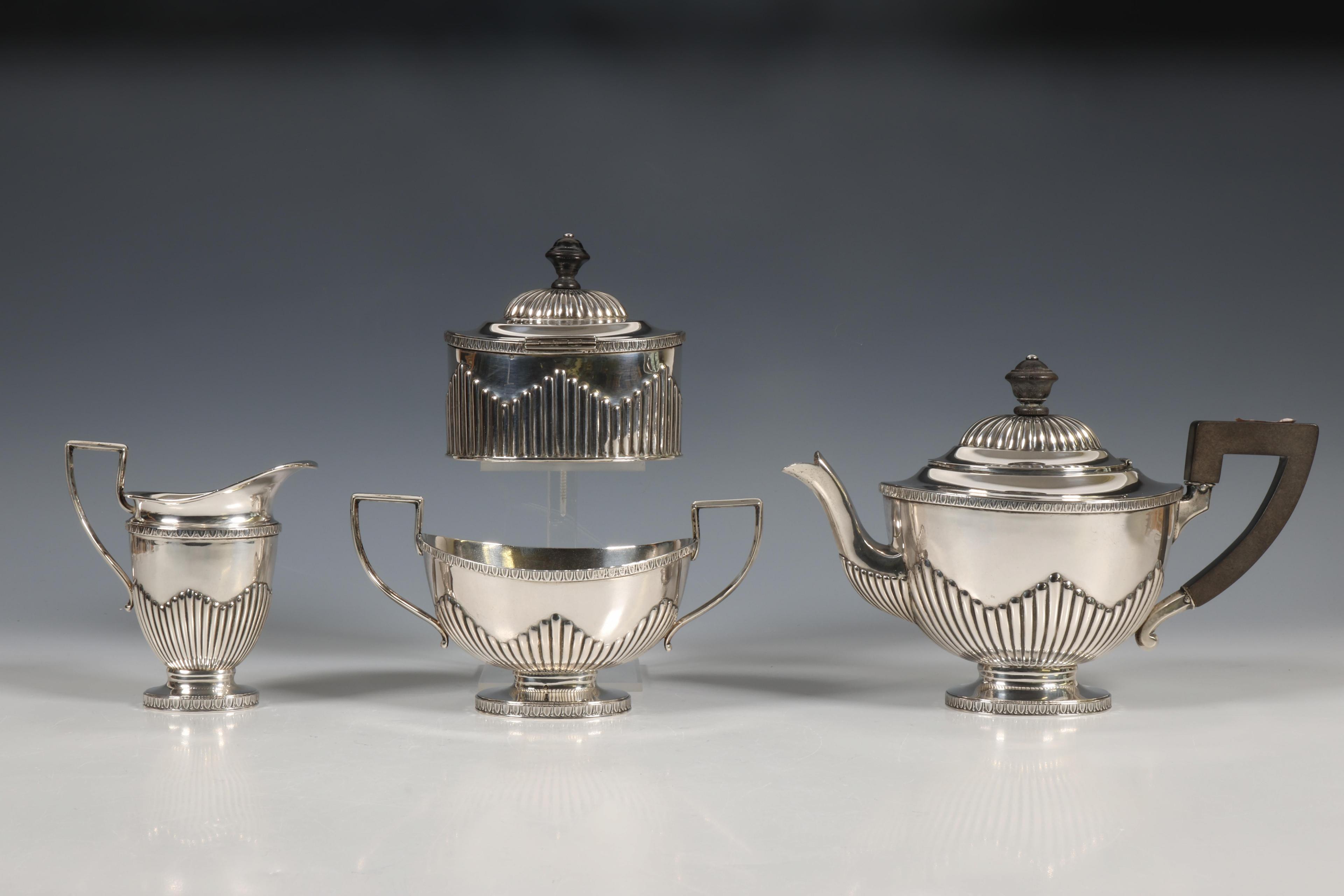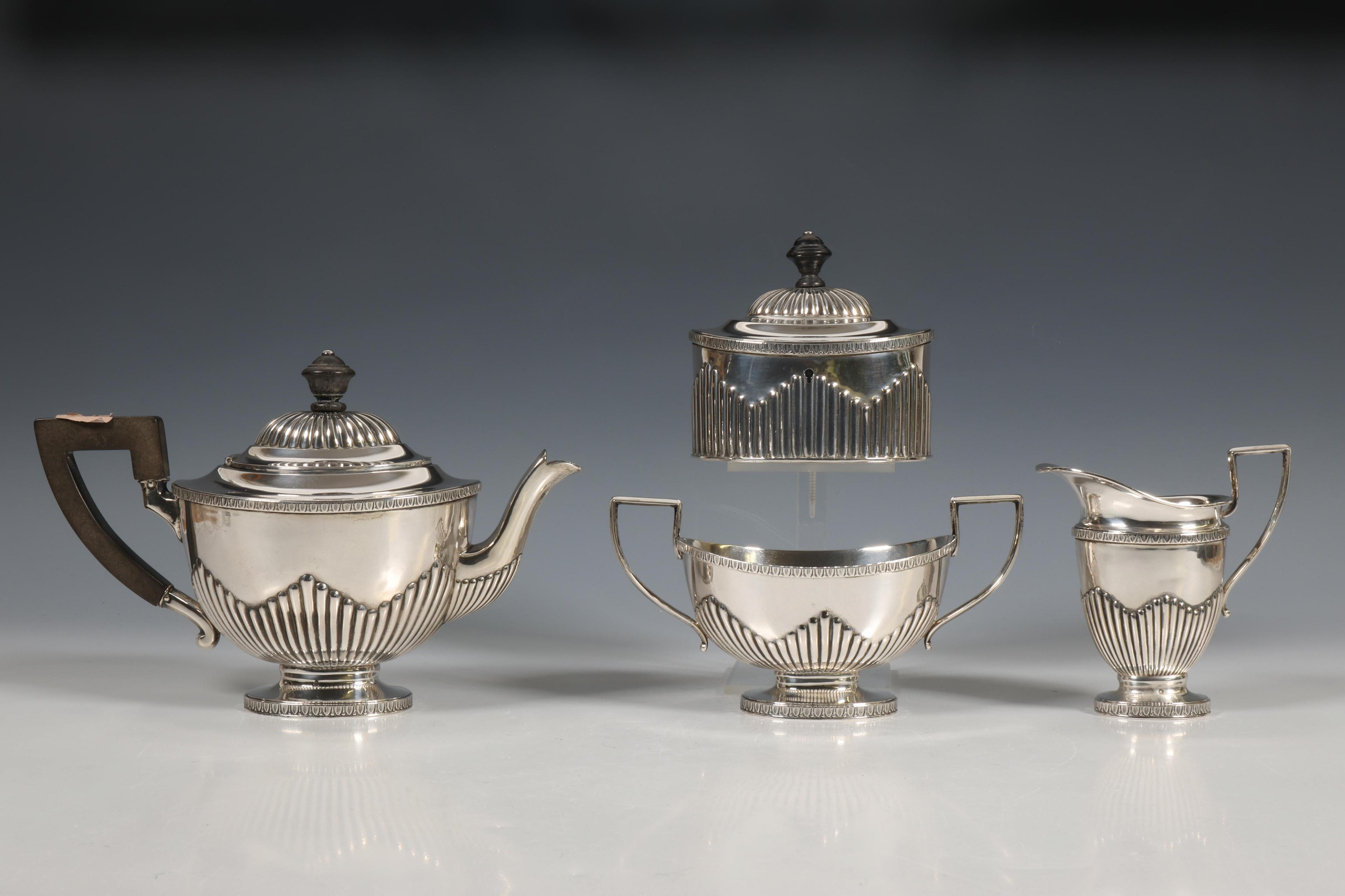 ovaal geribd model, bestaande uit, theepot met hoornen greep, scharnierende deksel, theekistje met scharnierden deksel en houten knop, roomkannetje en suikercoupe, mt. Fa. J.M. van Kempen Voorschoten 1901, 2e gehalte,