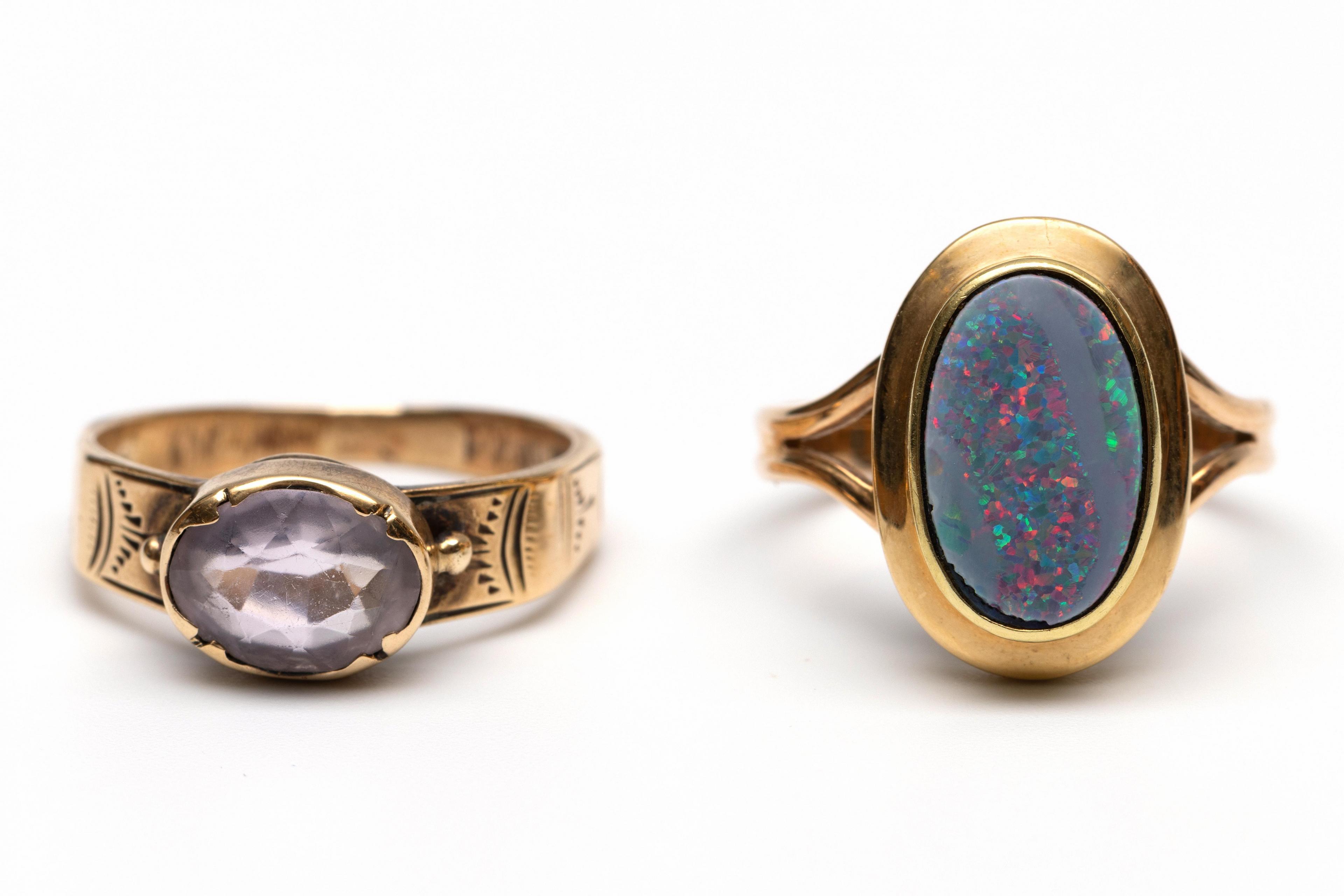 Two 14 k. gold rings, one set with a faceted amethyst, the shoulders decorated with engraving, the other set with an opal doublet