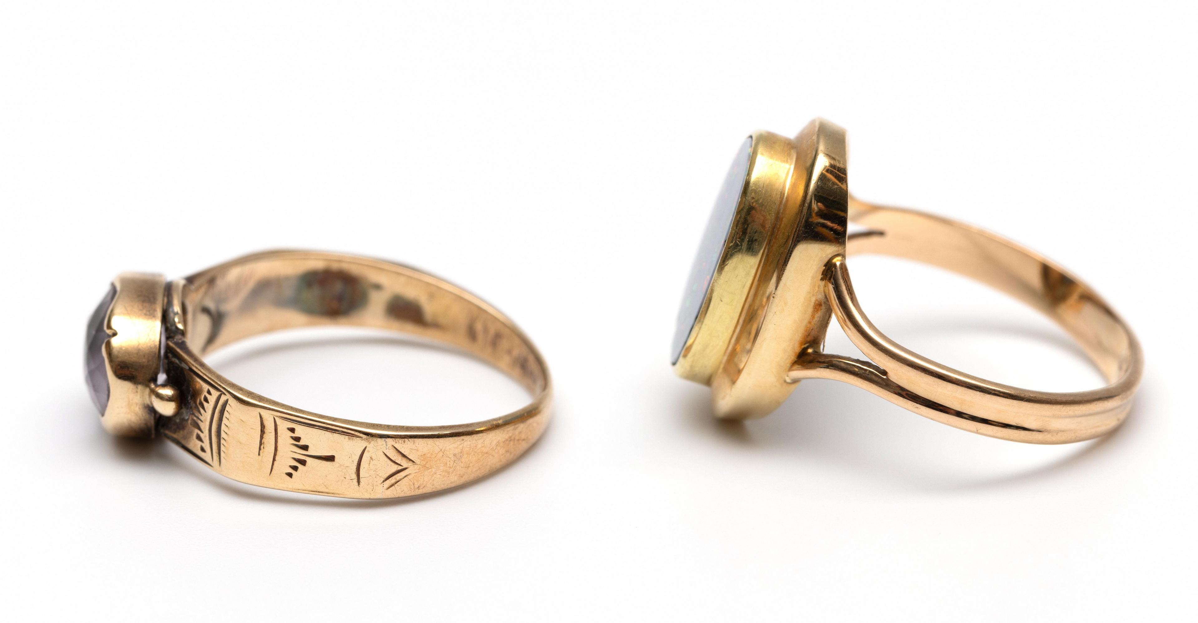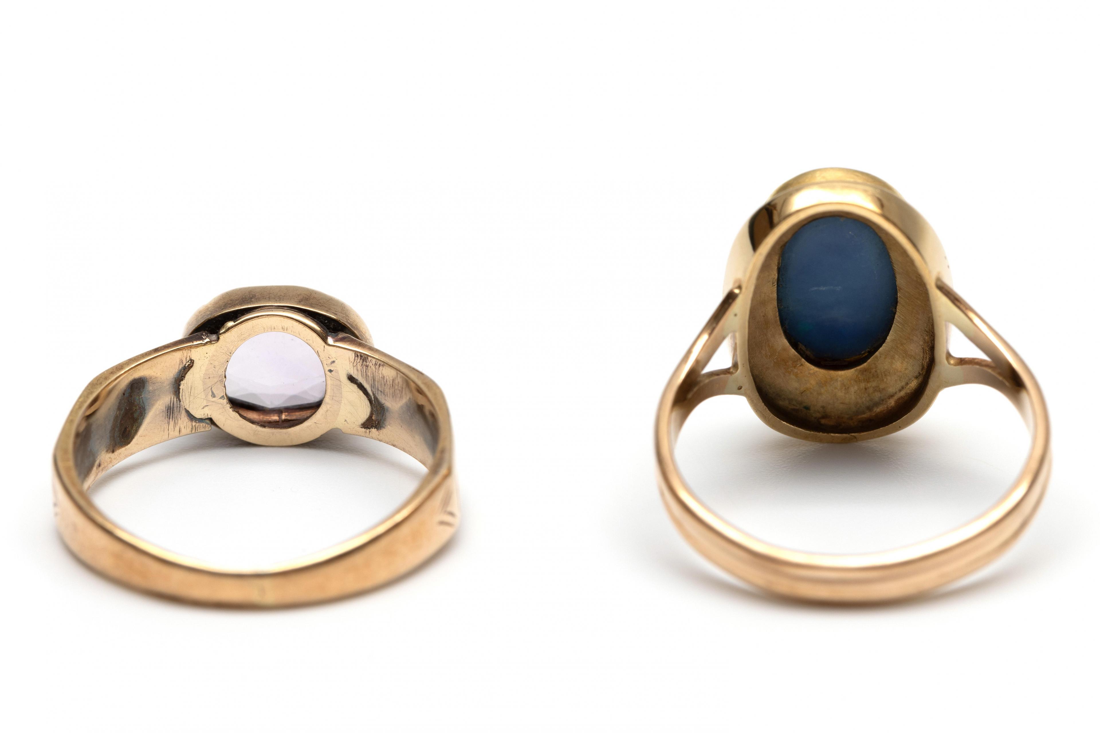 één bezet met een gefacetteerde amethist, de schouders gedecoreerd met gravé, de ander bezet met een opaal doublet