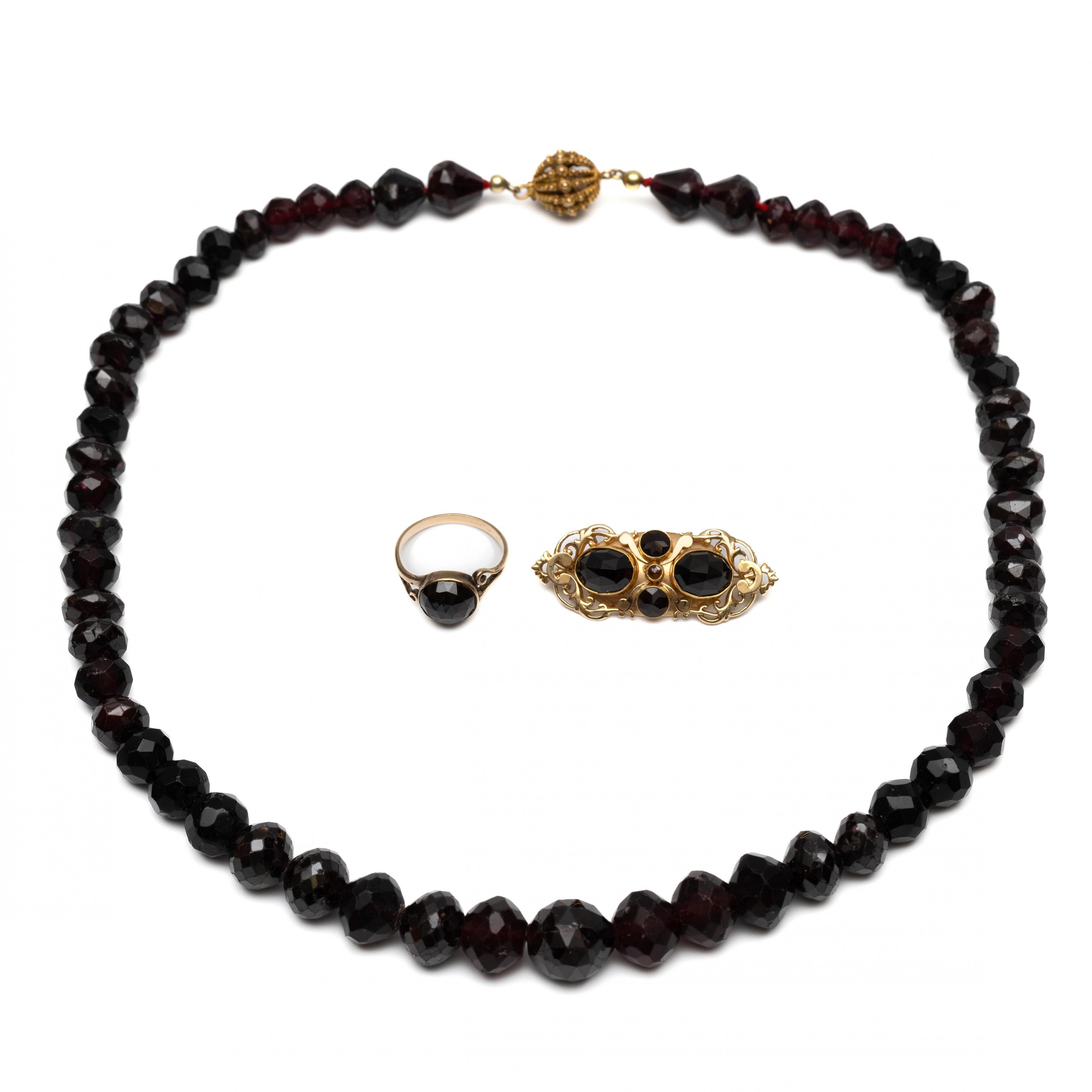 14 k. gold ring, brooch and necklace, all set with garnet (necklace partly with glass beads)