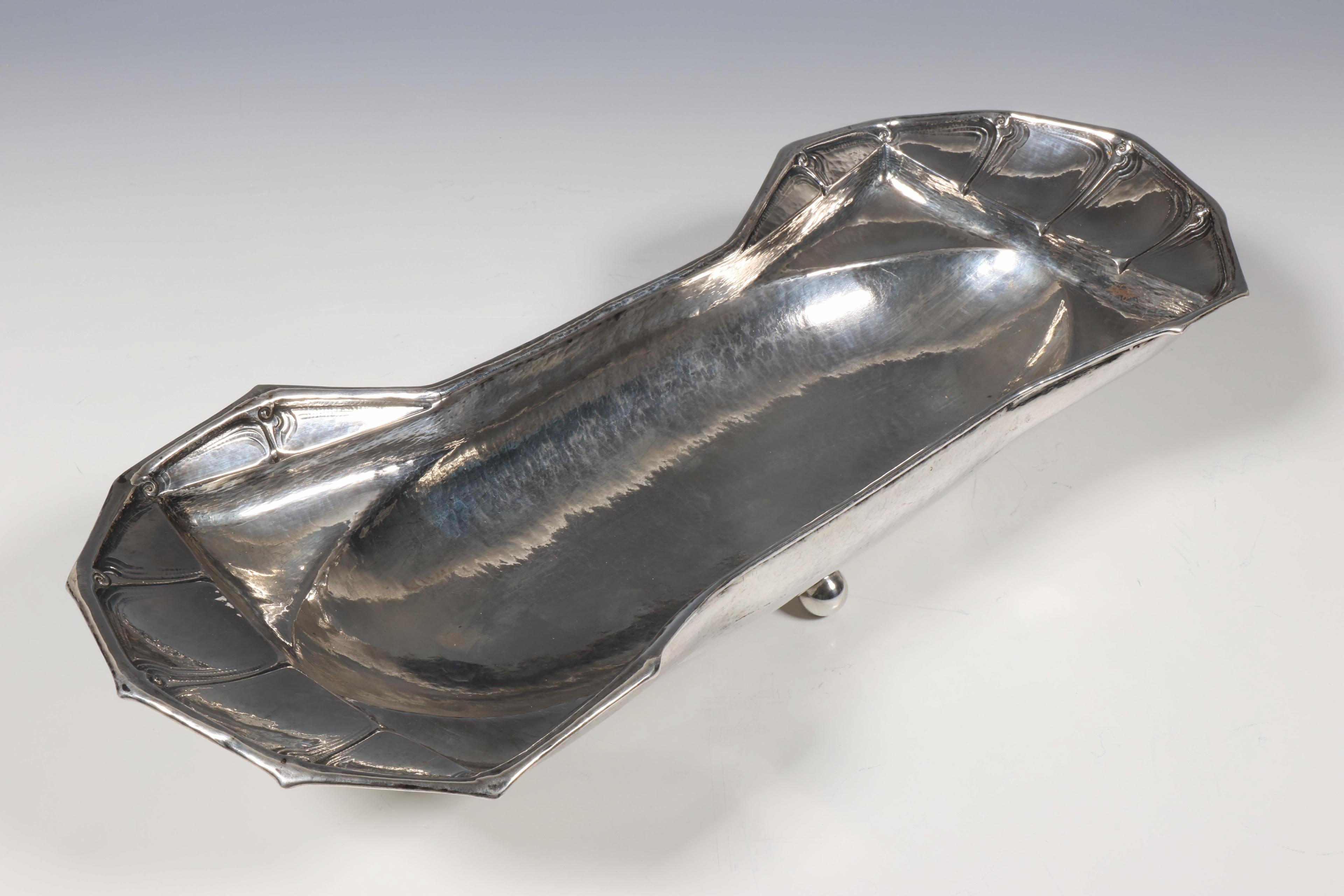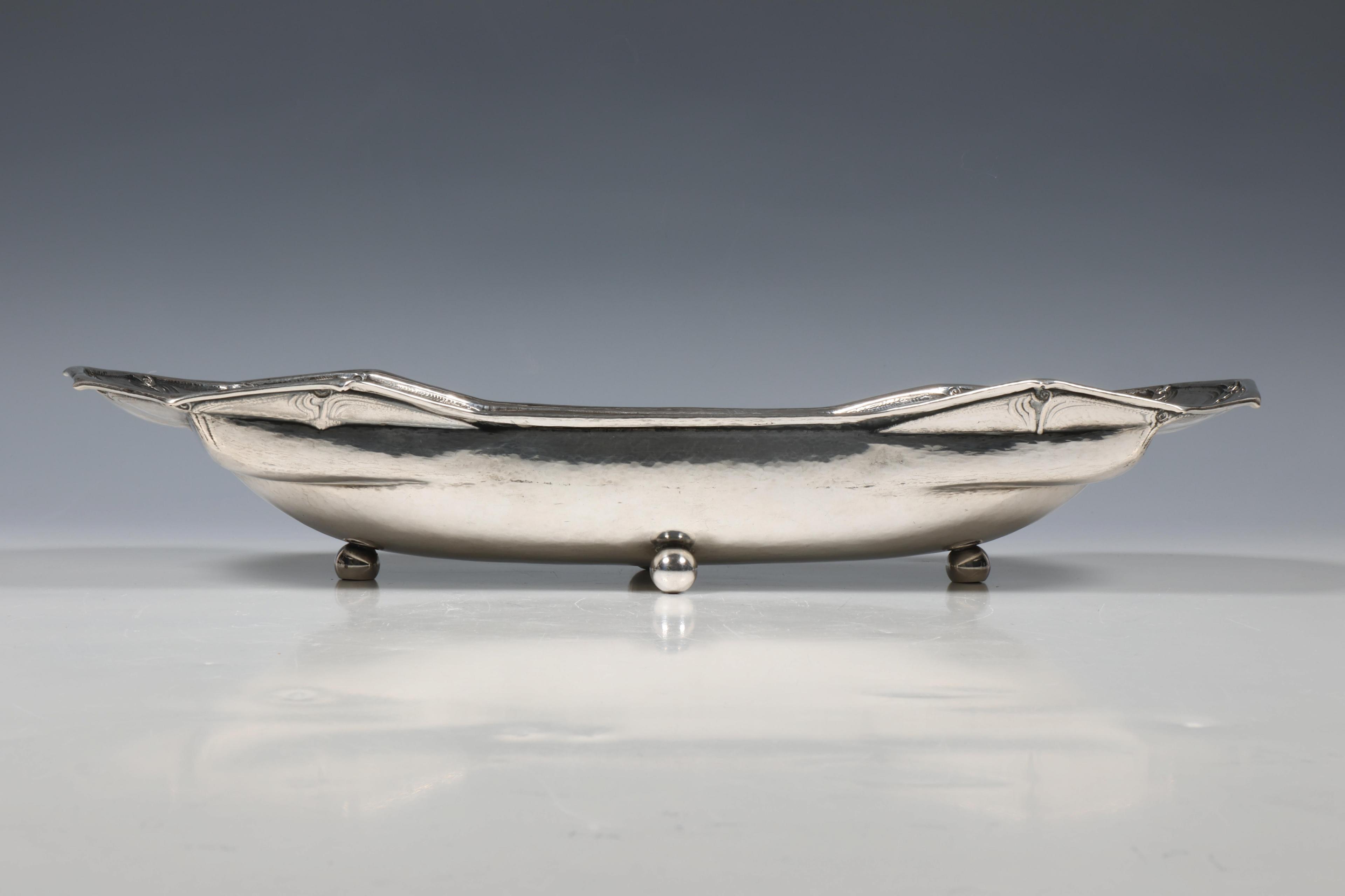langwerpig diep model met bewerkte afgeronde zijkanten, staand op vier pootjes, mt. W.C. Weier 1913-1930 Amsterdam, winkelier Fa. Gebr. Reggers Amsterdam , jaarletter 1927, 2e gehalte,