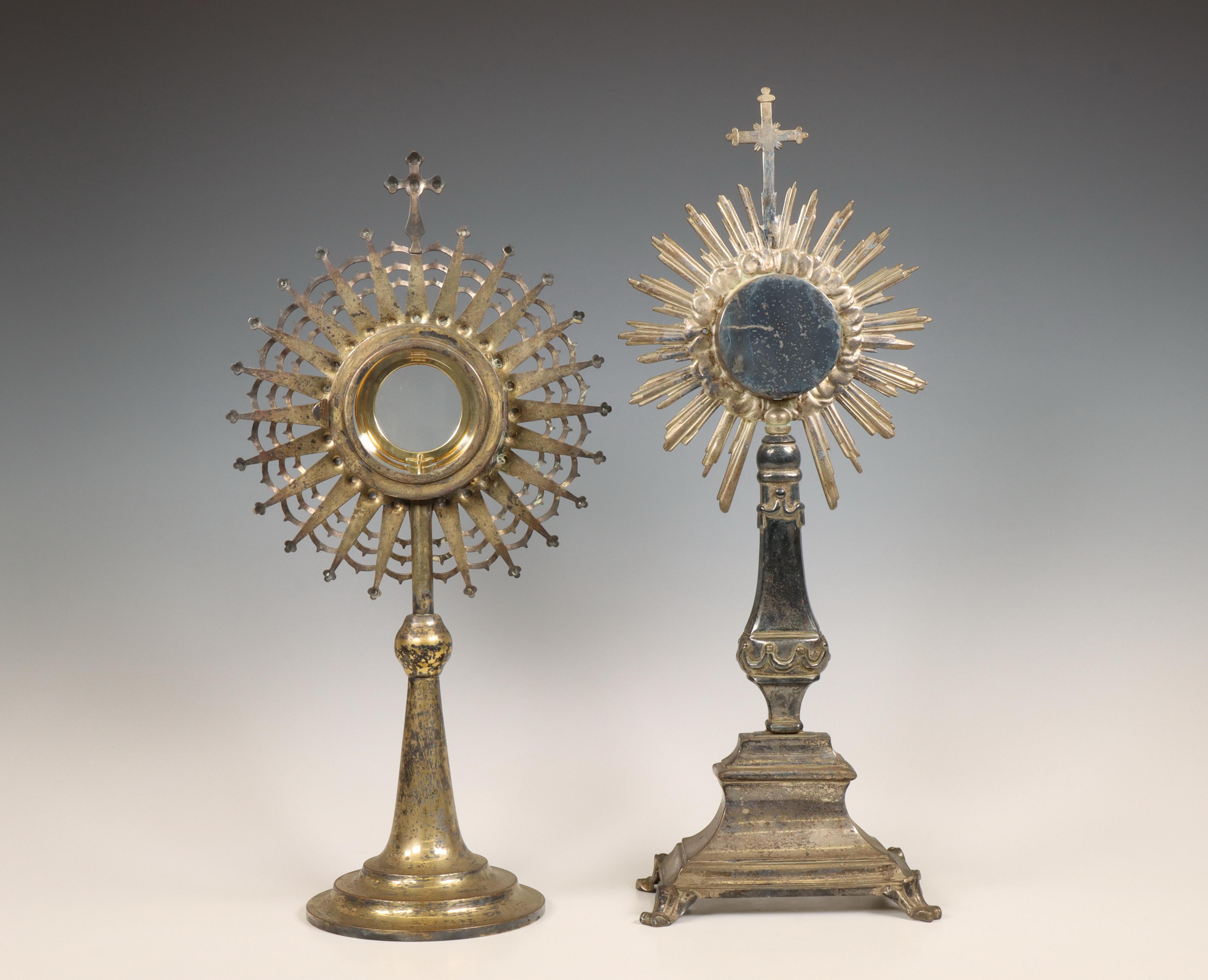 Frankrijk, twee verzilverde metalen monstransen, circa 1900