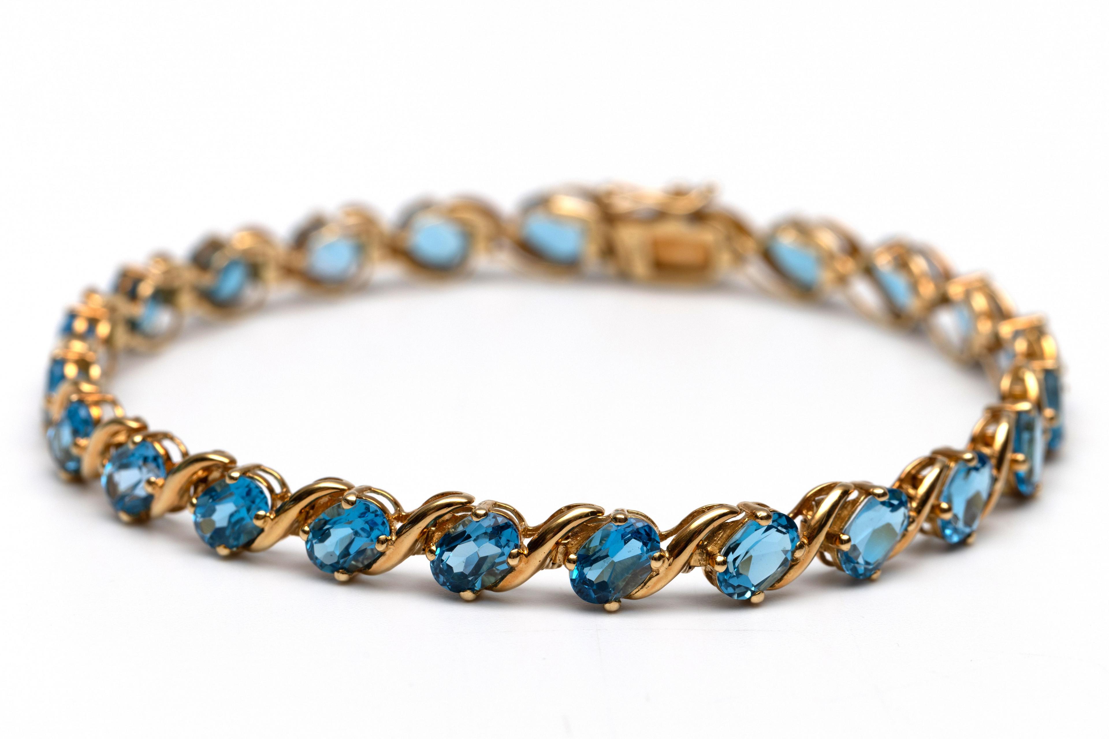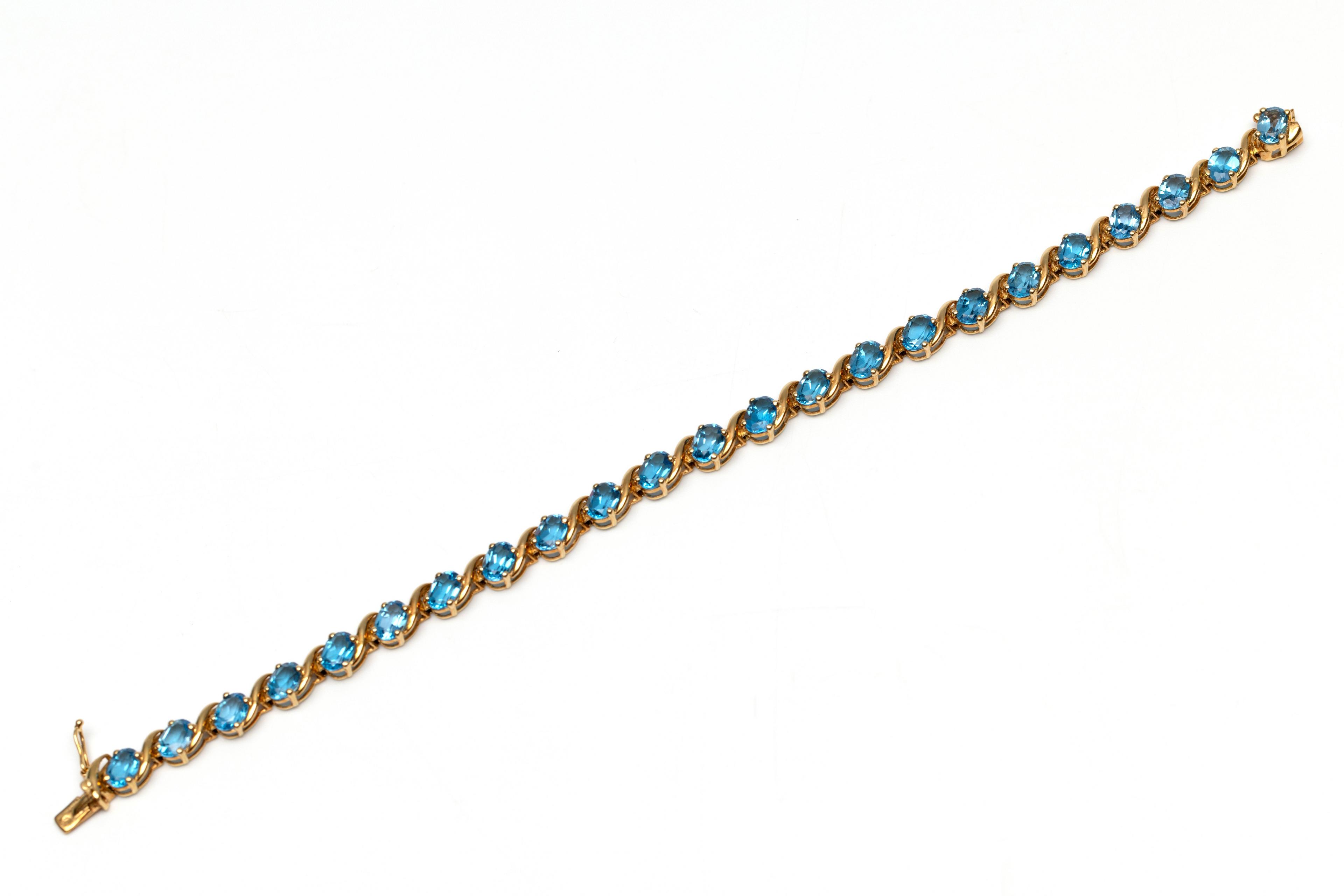 H. Stern, 18 k. gold tennis bracelet, set with oval faceted topazes (6 x 4 mm), in the colour Swiss blue, between which are wavy lines of gold. In box