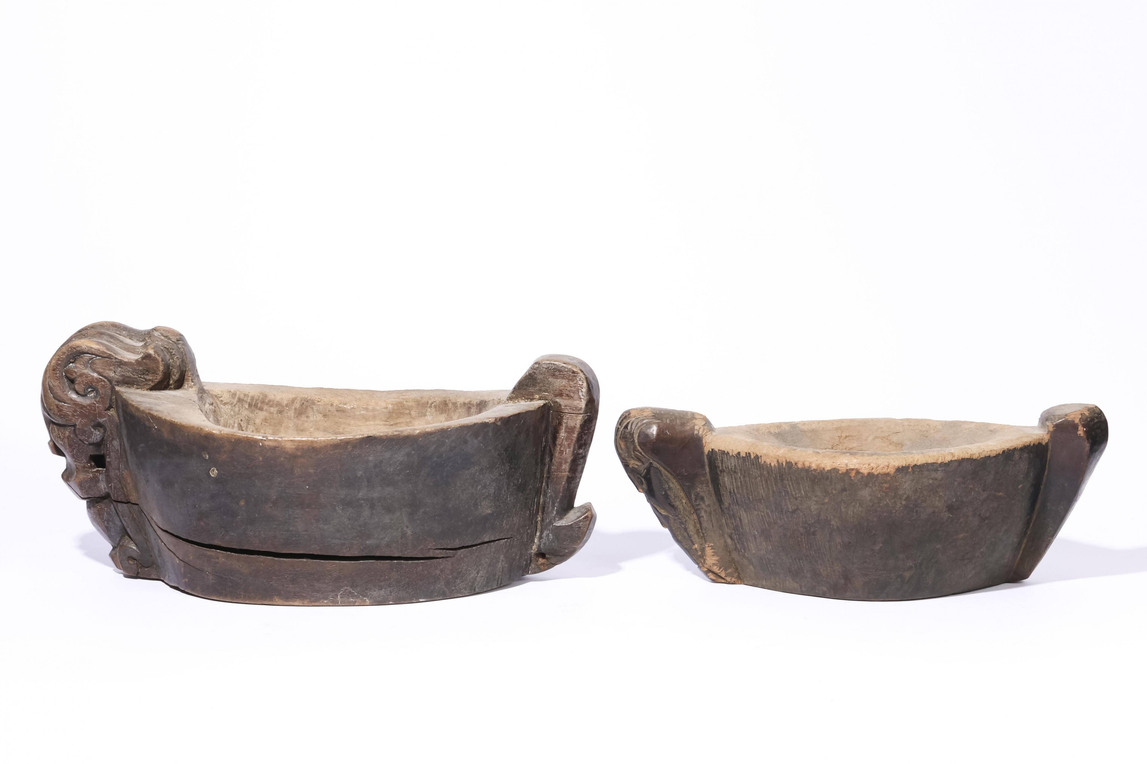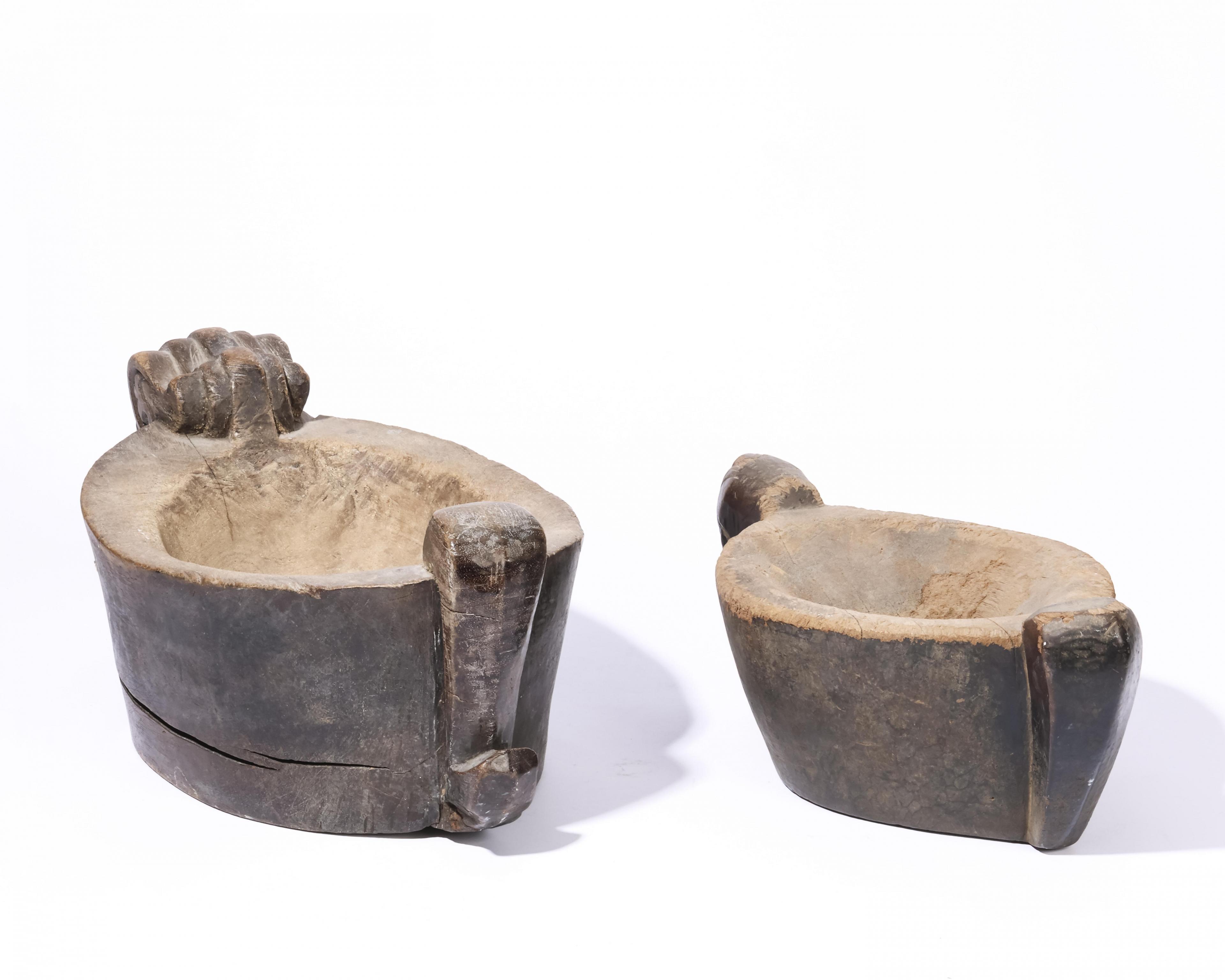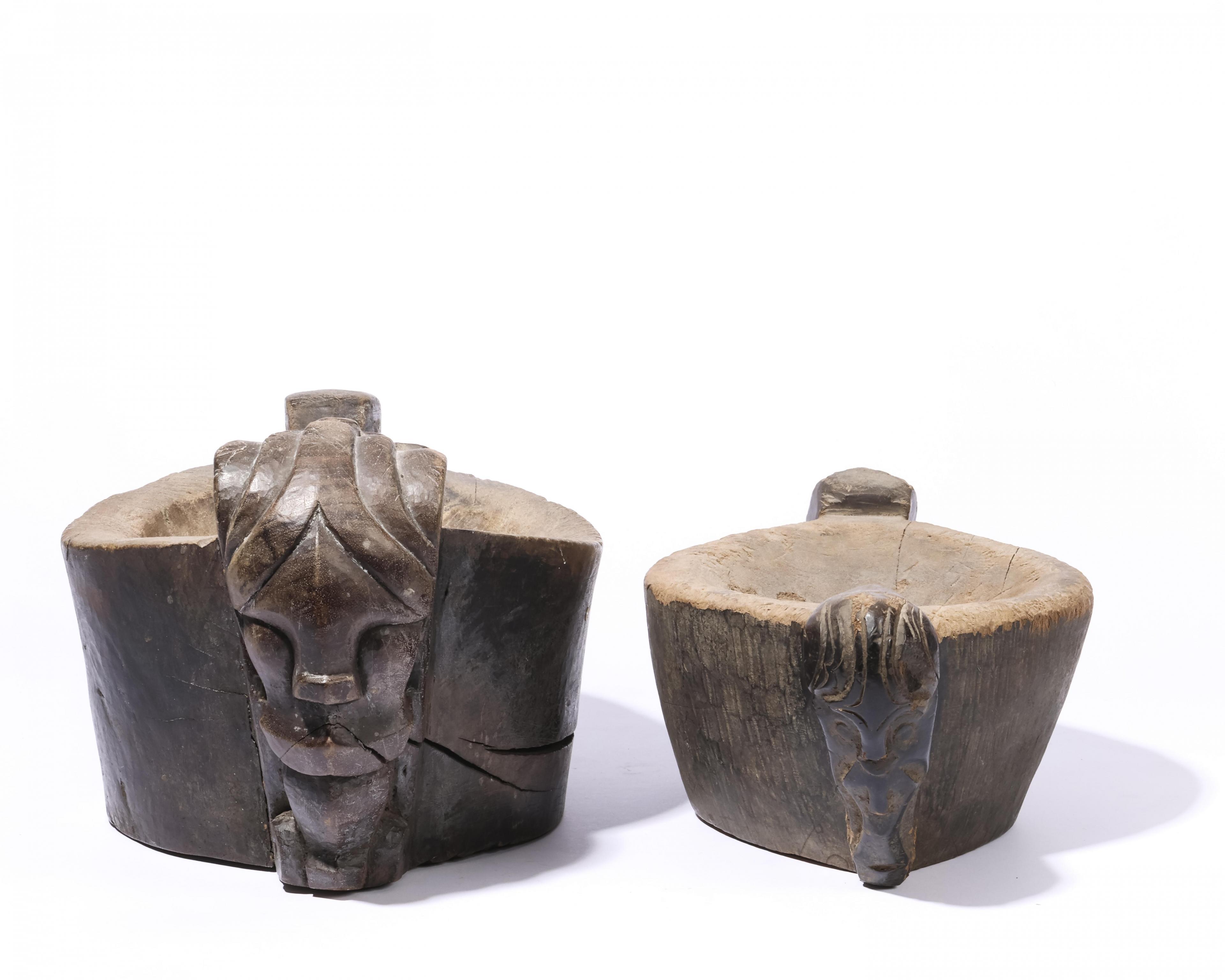 Sumatra, Batak, two wooden mortars, showing a singa head to one side a tail to the other.