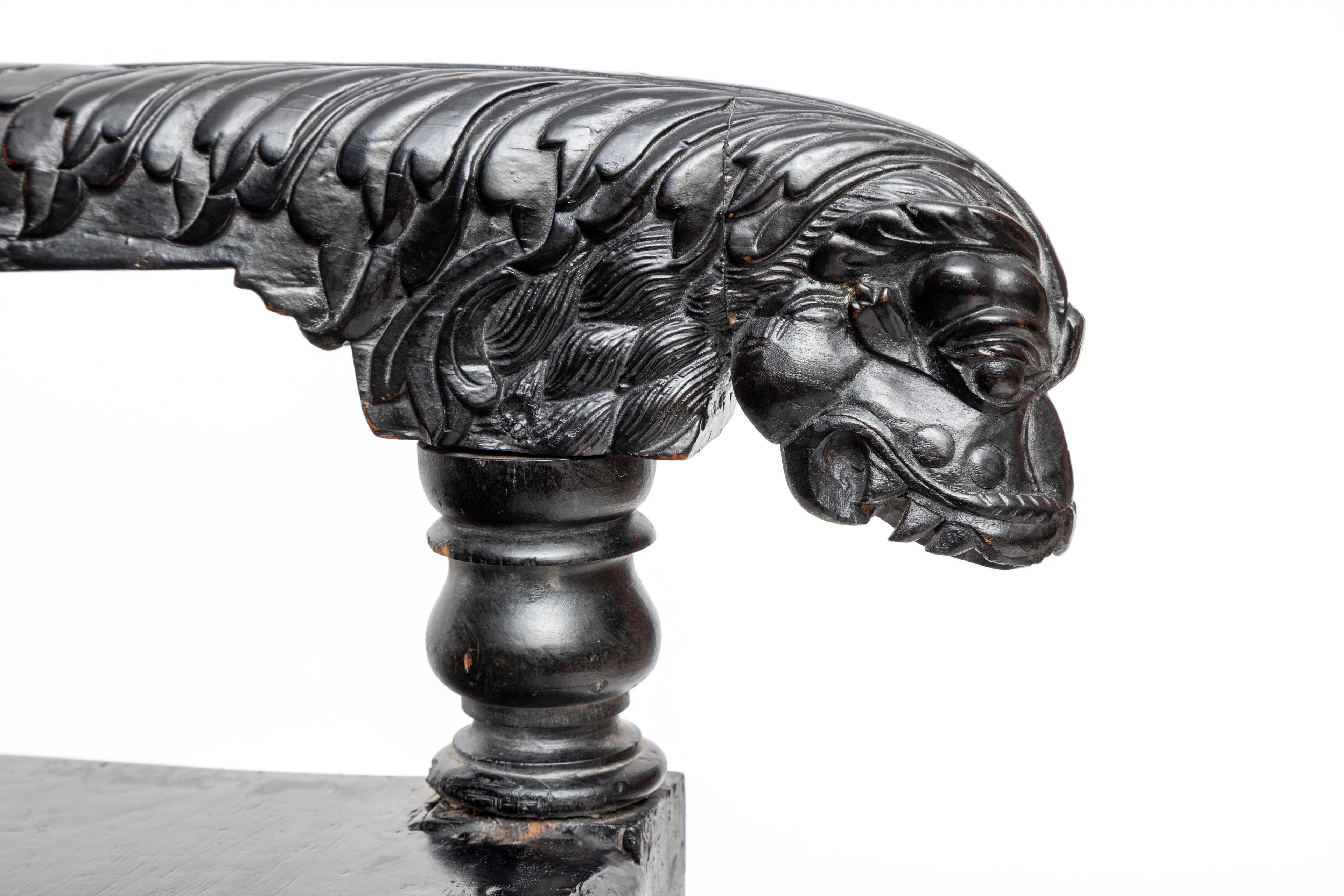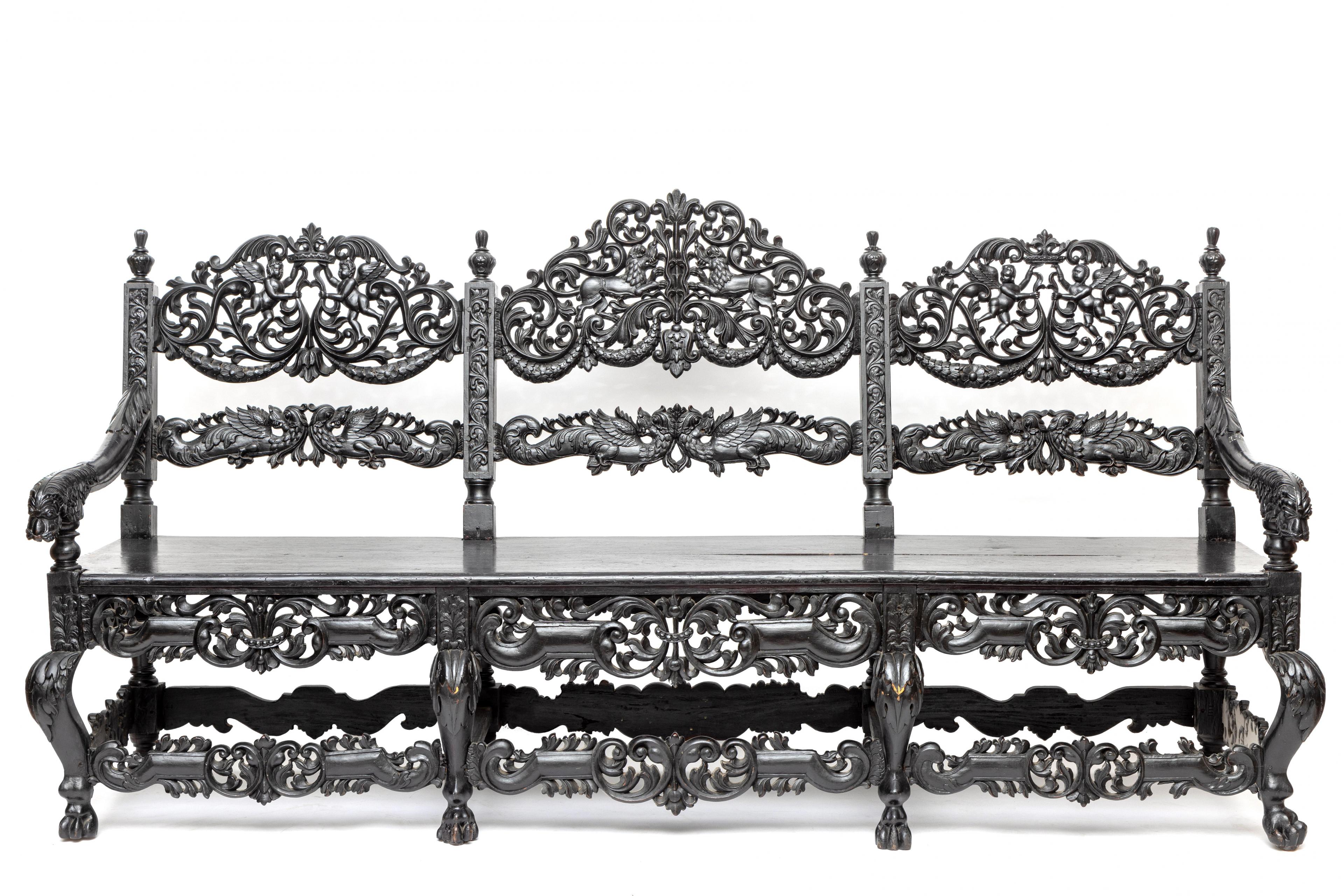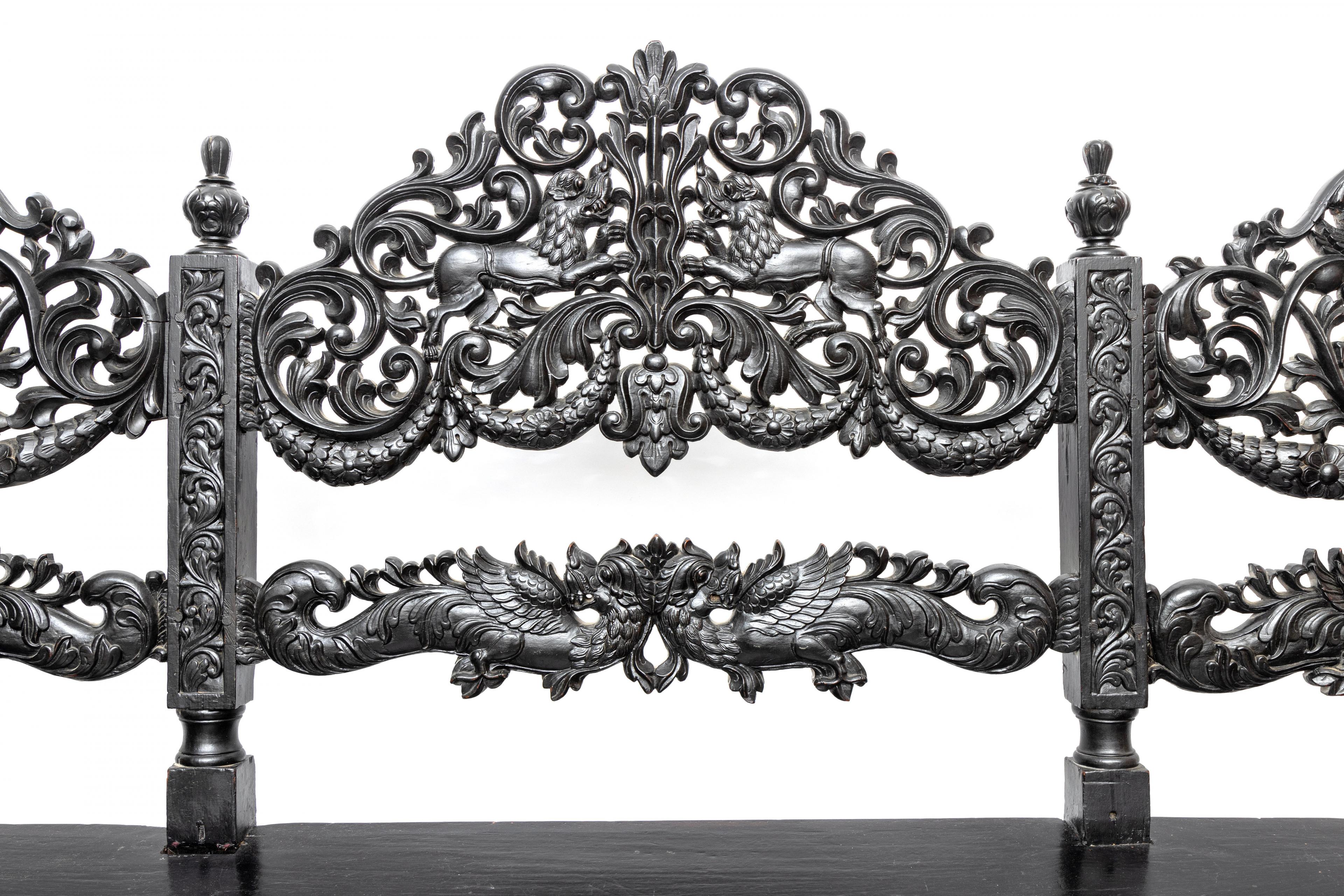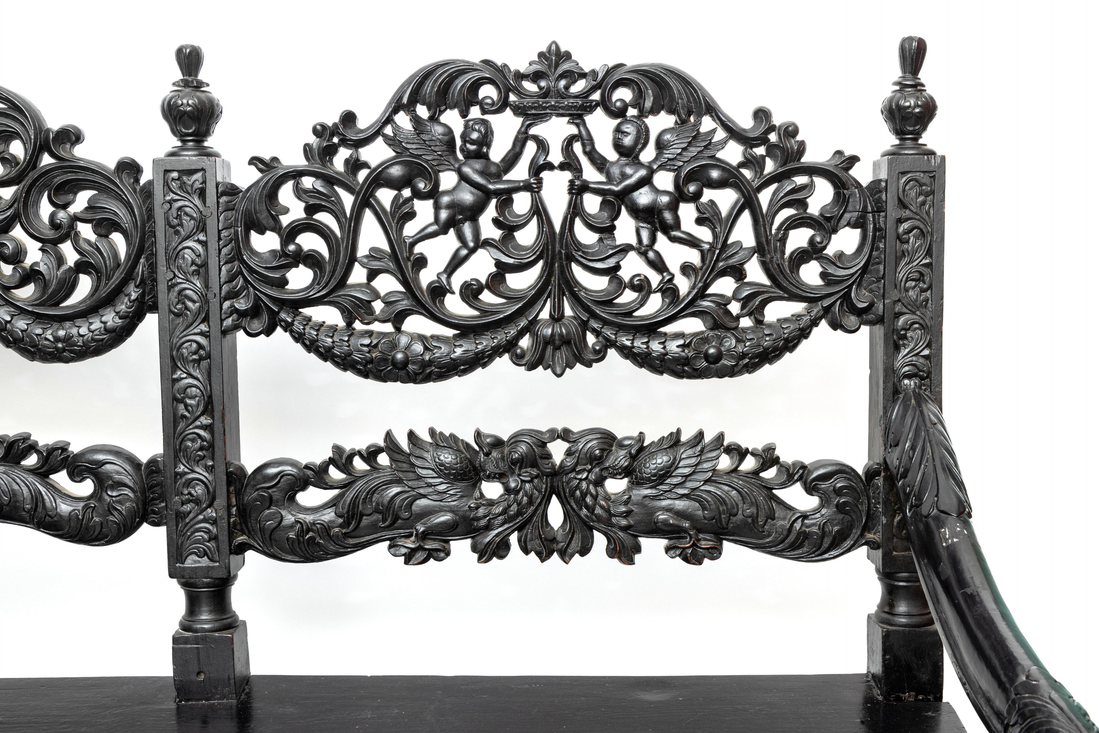 Zwart gelakte en rijk gestoken teakhouten koloniale bank, ca. 1900,