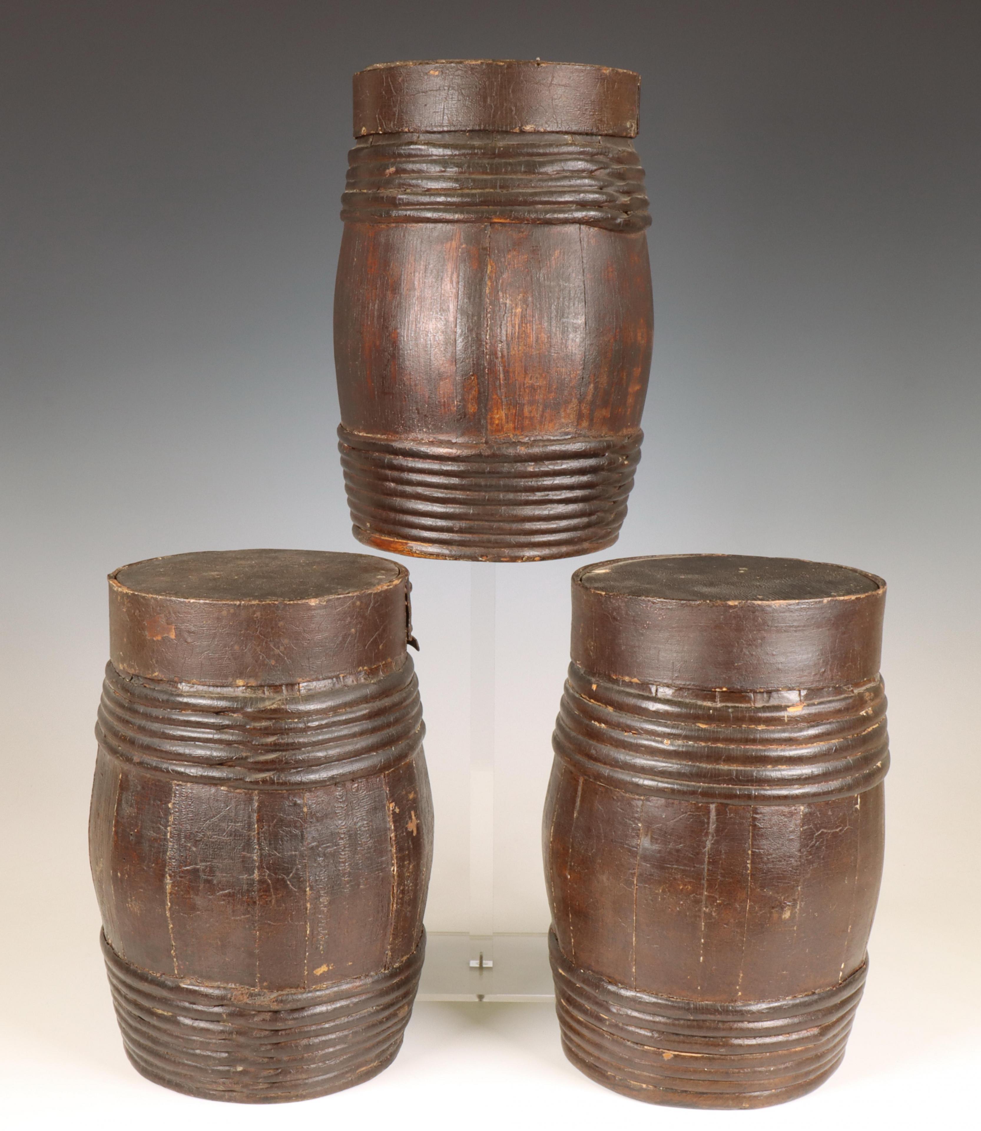 Drie bruin geschilderde gekuipte houten tabakstonnetjes, ca. 1800;