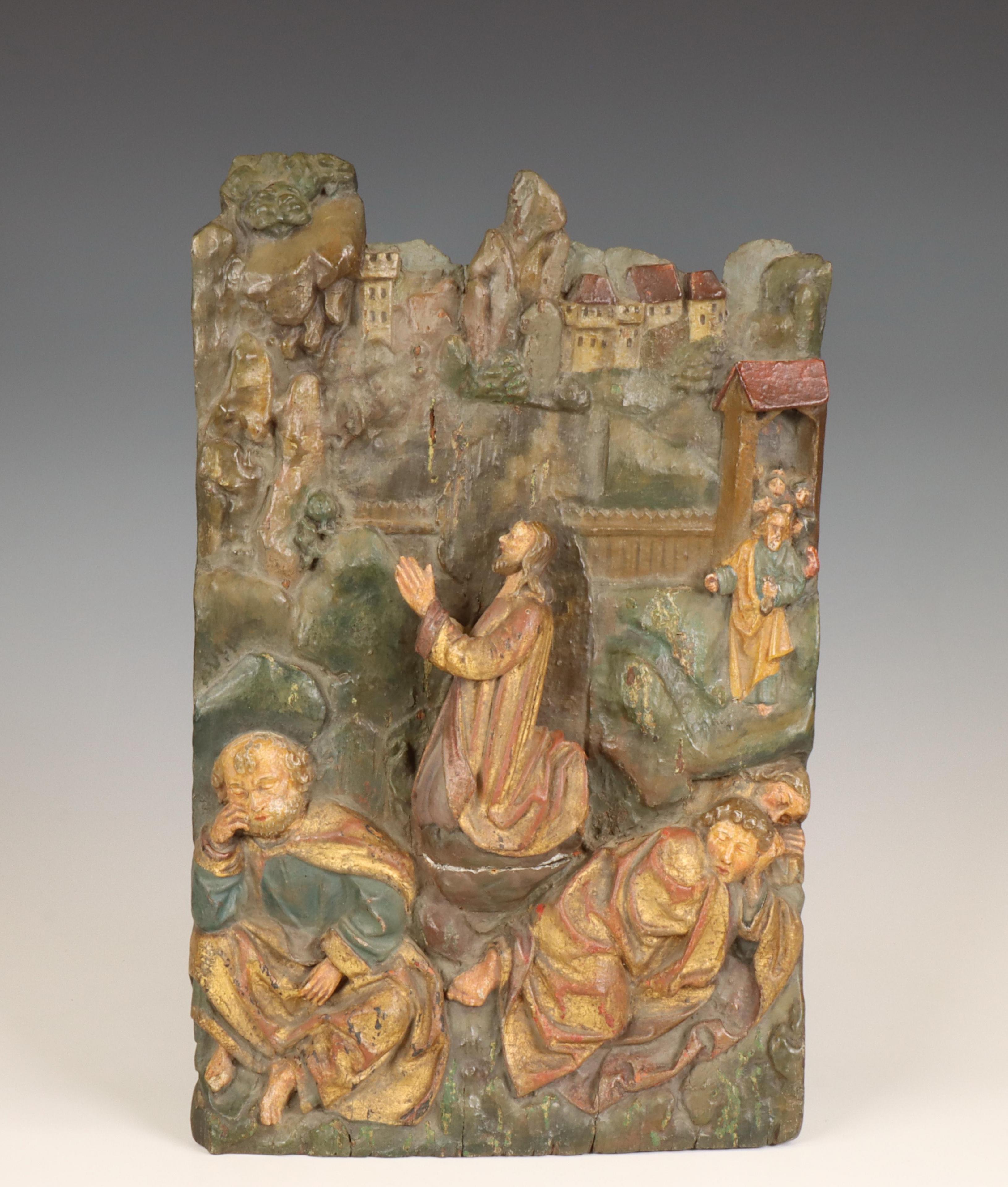 Uitgevoerd met voorstelling van centraal knielende Christus, aan zijn voeten drie slapende herders. Rechts boven een beeltenis van Christus die Jeruzalem verlaat.