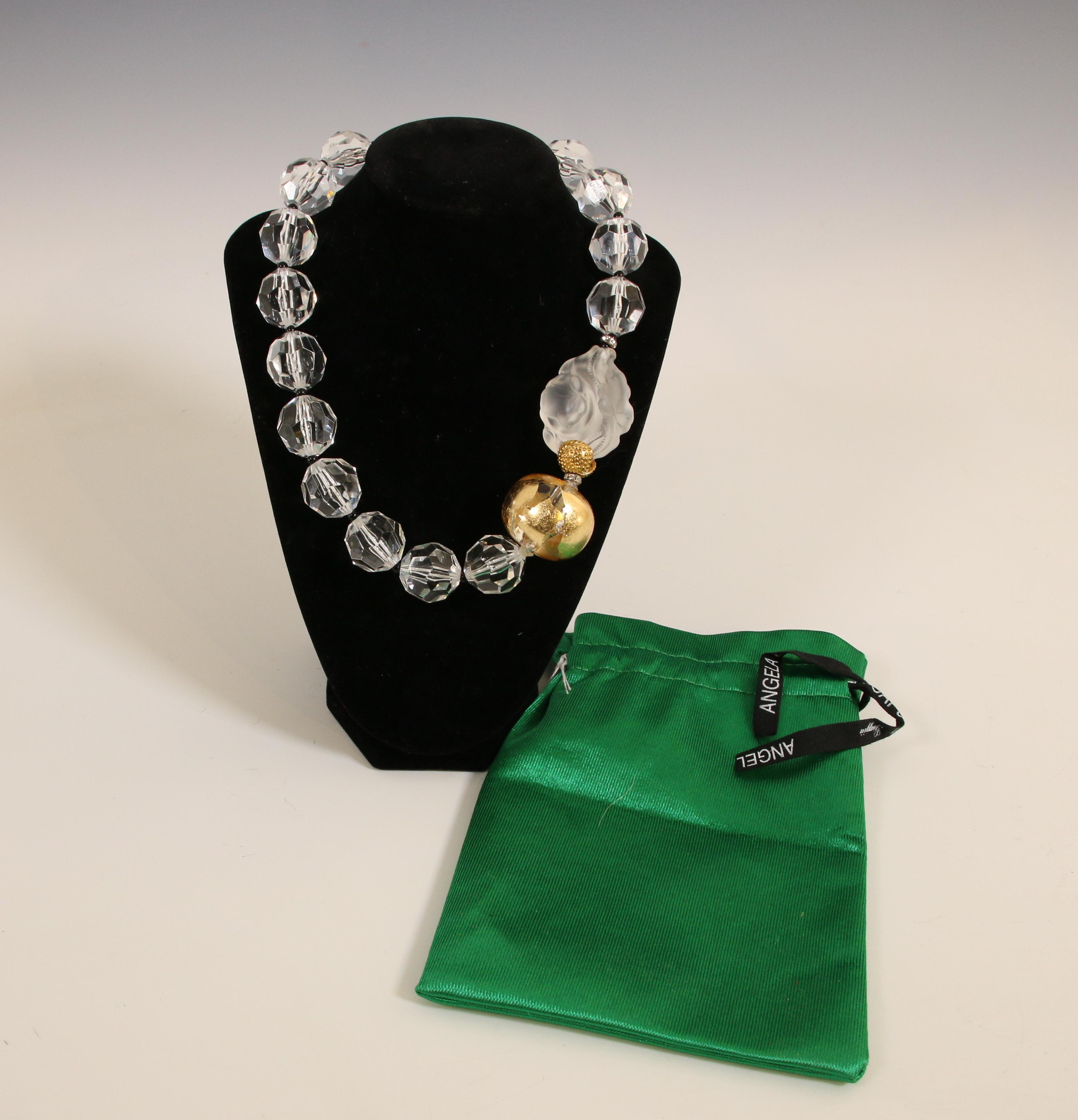 collier van gefacetteerde transparante kunsthars kralen, zwarte kralen, strass, een gematteerde kraal met bladmotieven en een kraal afgezet met bladgoud. In origineel zakje.