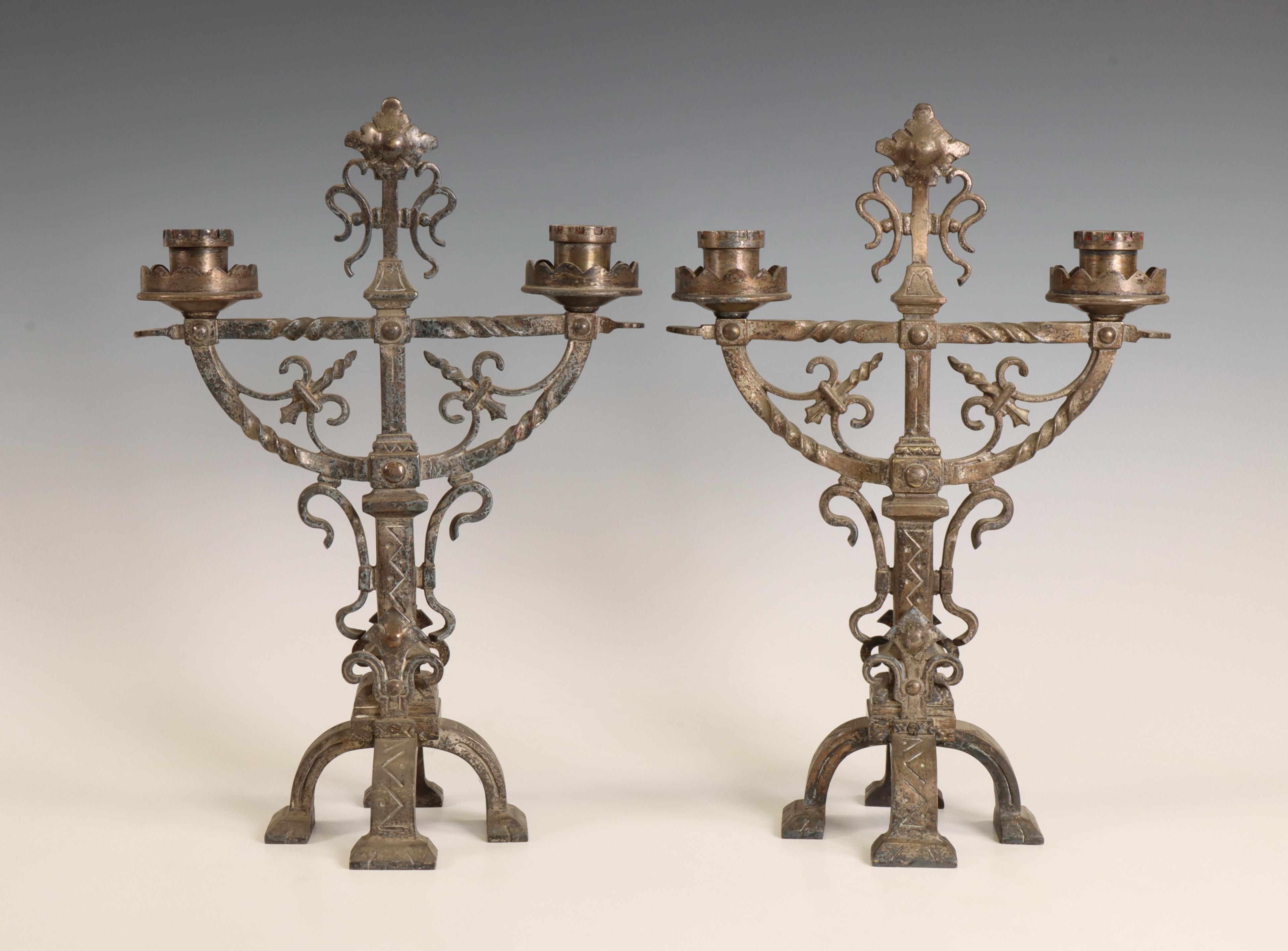 Paar verzilverde metalen tweelichts kandelaars, Neo Gotiek