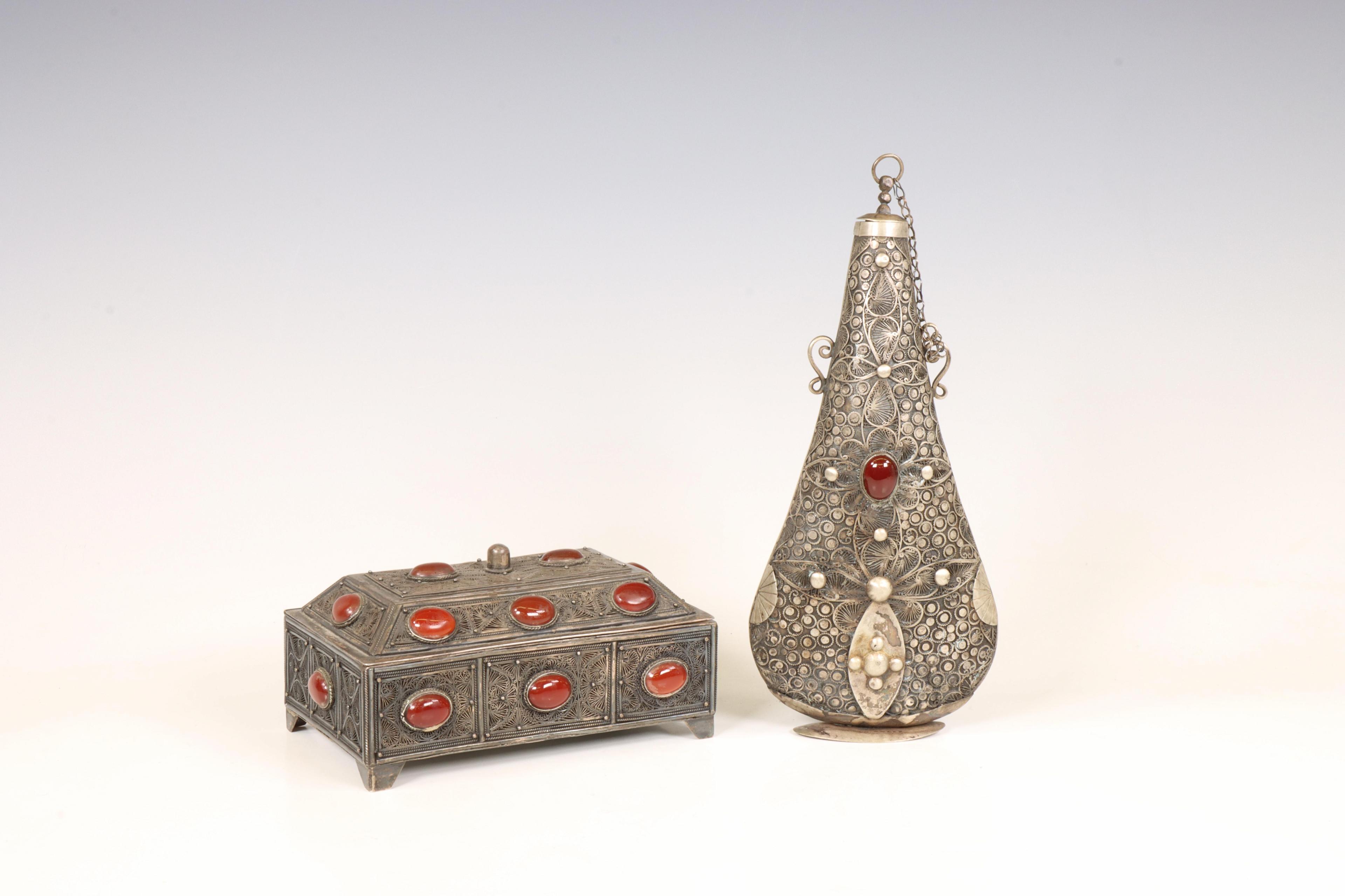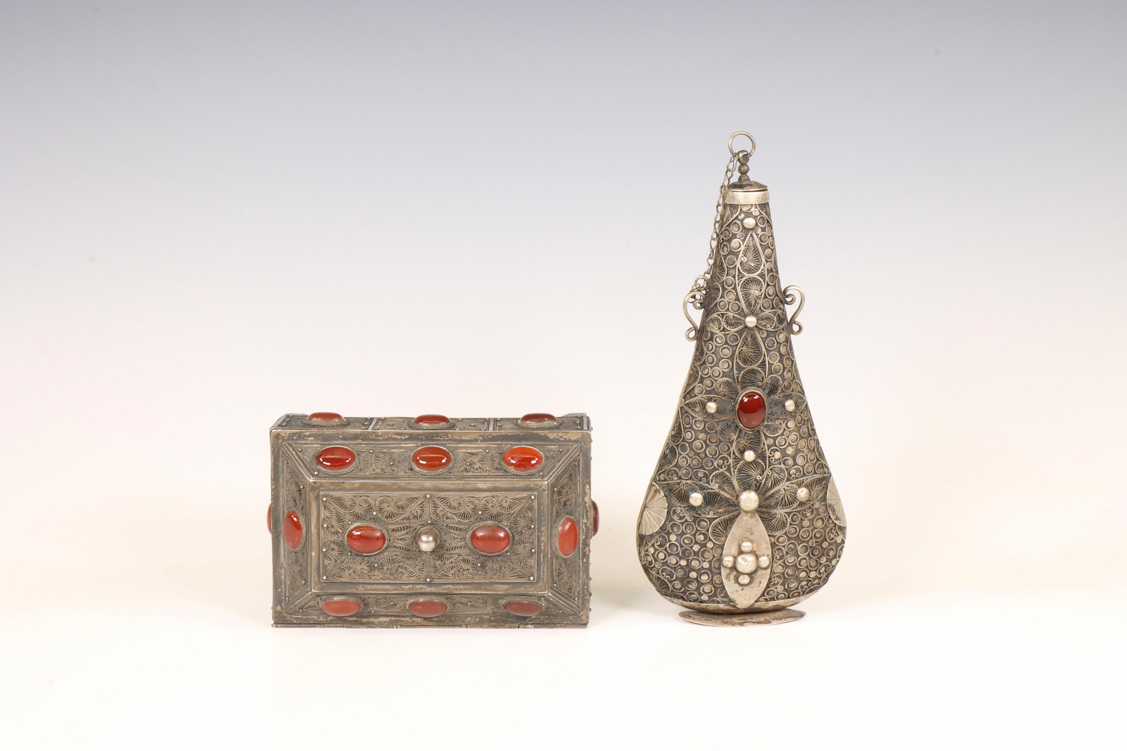 Marokko, een zilver legering dekseldoos en veldfles versierd met agaten