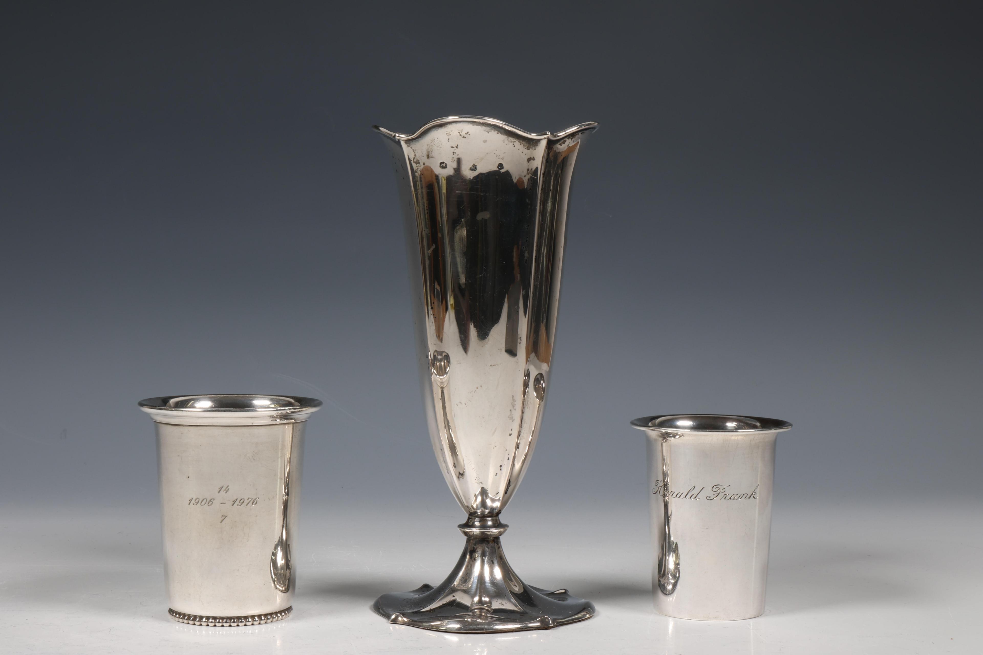 vaas mt. Gerritsen * Van Kempen Zeist 1930, theelepels mt. fa. Driessen Utrecht 1919-1943, bekers mt. Fa. N.V. Zilverfabriek Voorschoten met cassette en mt. Van Kempen en Begeer, schaaltje gemerkt mt. CGH en jaarletter 1959, 2e gehalte,