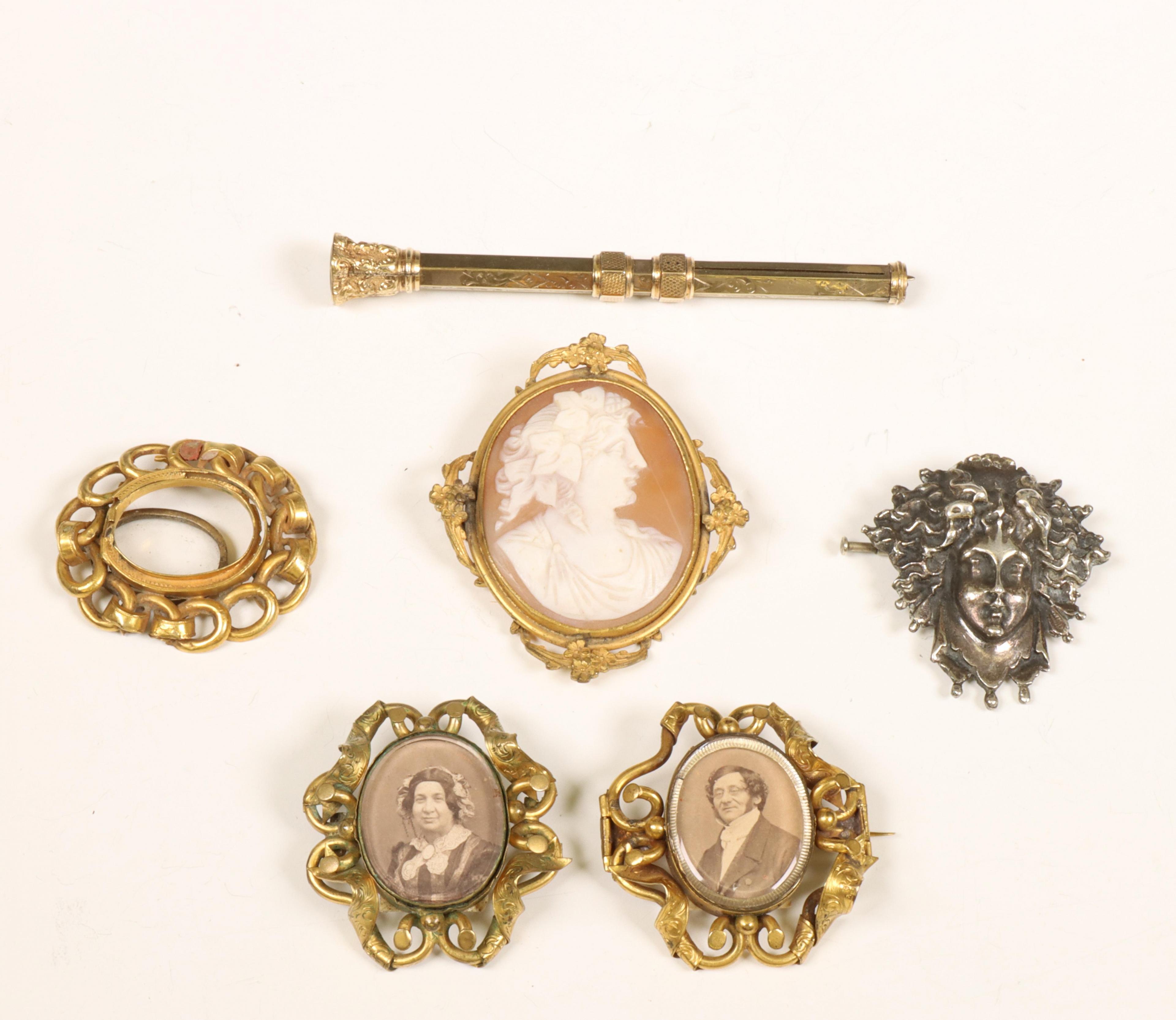 Hierbij een doublé vulpotlood, cameebroche, zilveren broche met masker en een gouden montuur (defect)