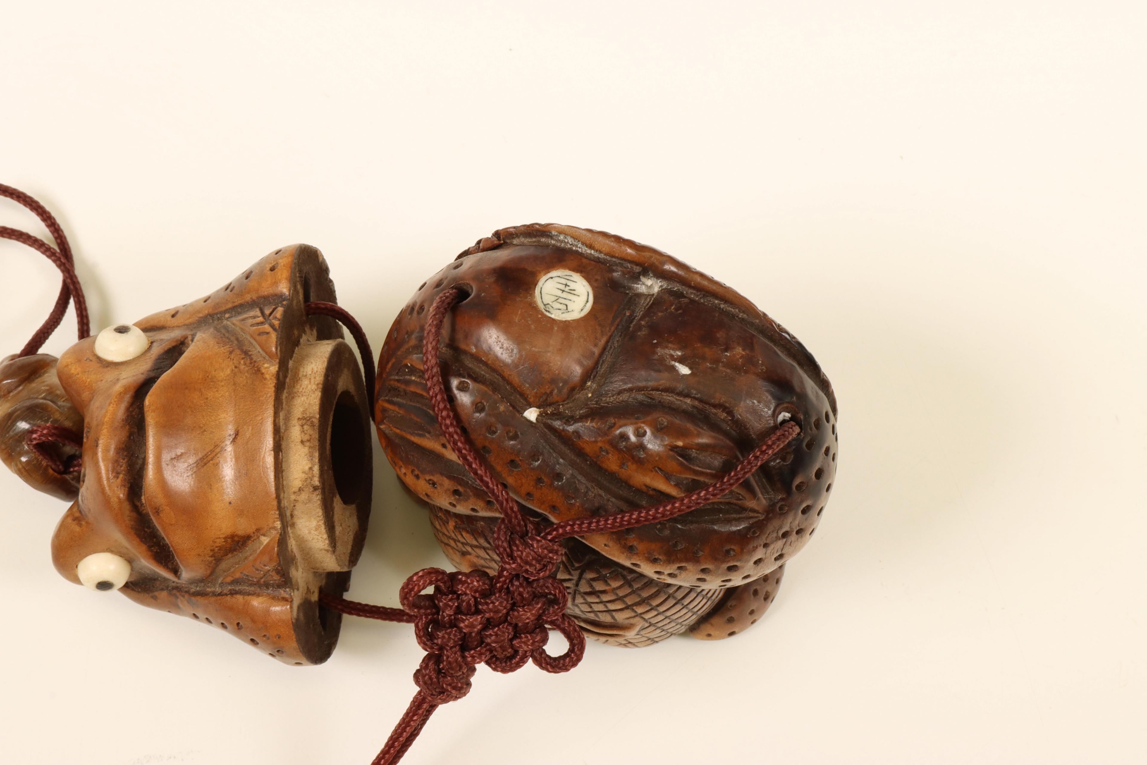 Samen met jade ojime in de vorm van een pad en een houten netsuke in de vorm van een pad.