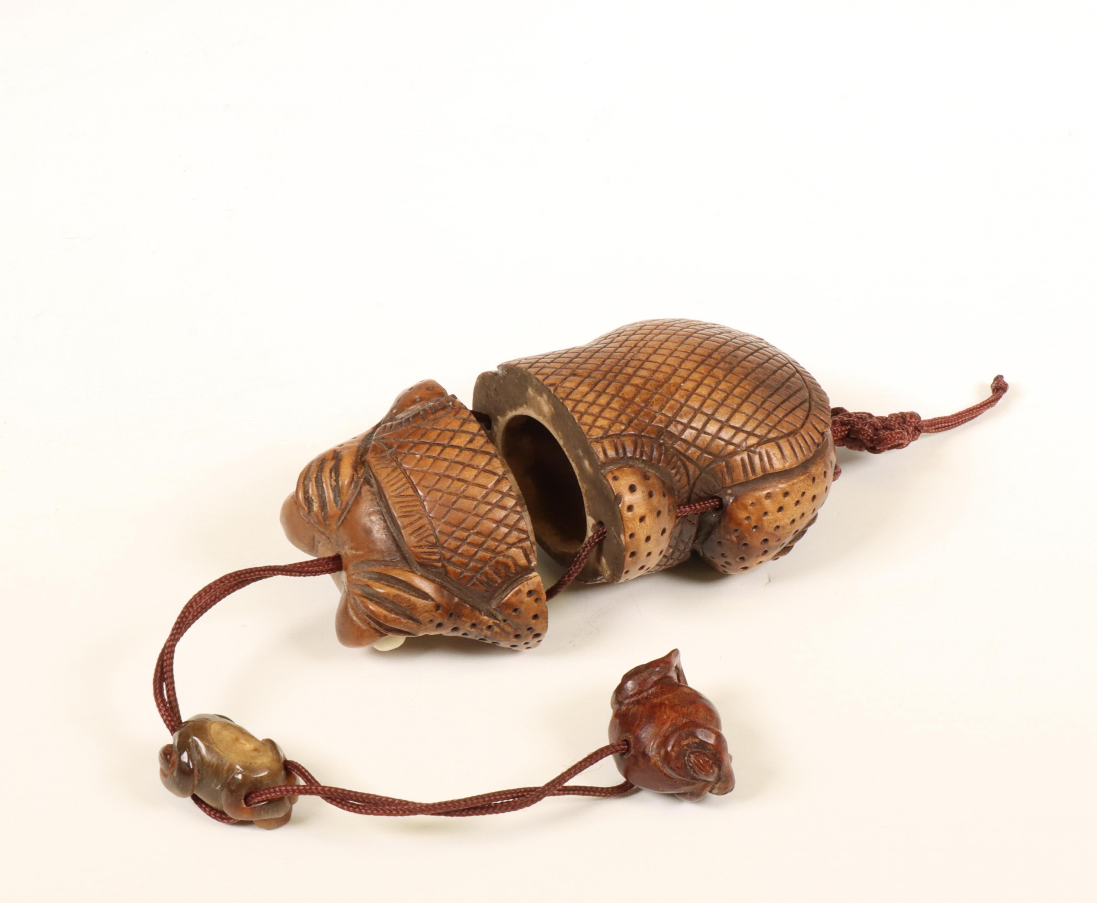Houten inro in de vorm van een pad.