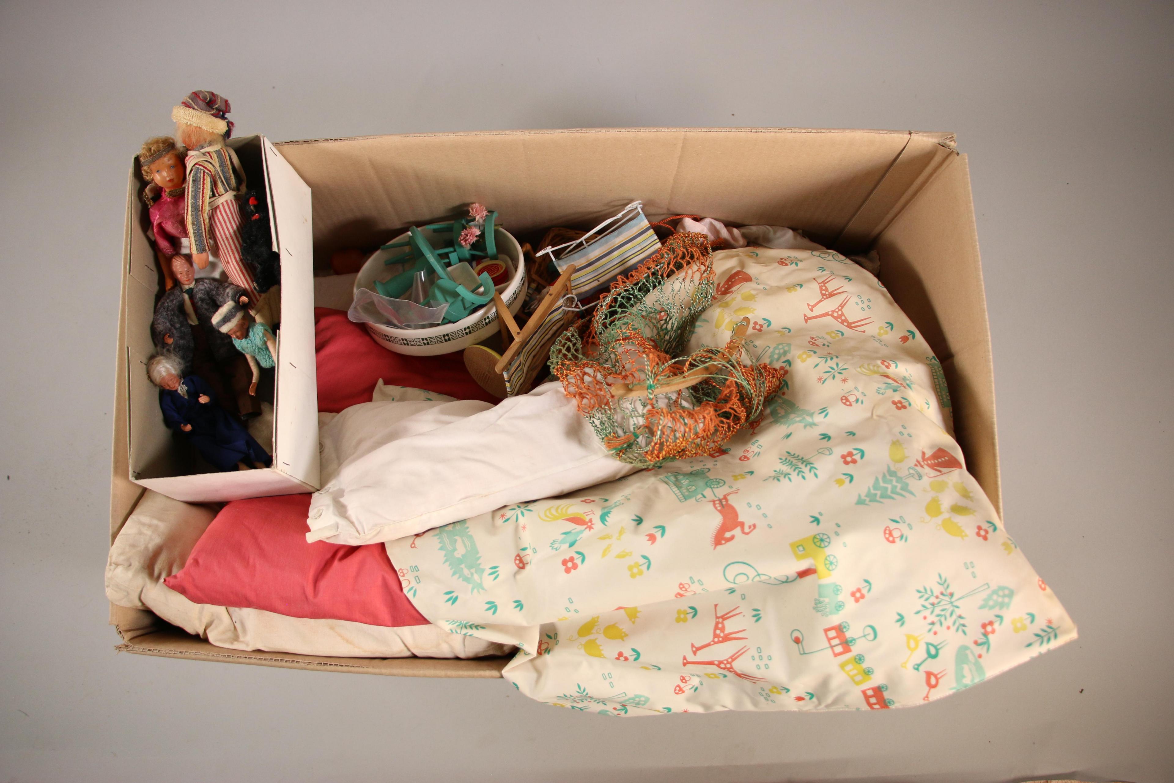 Duitsland, twee dozen met poppen, kleding en beddengoed.