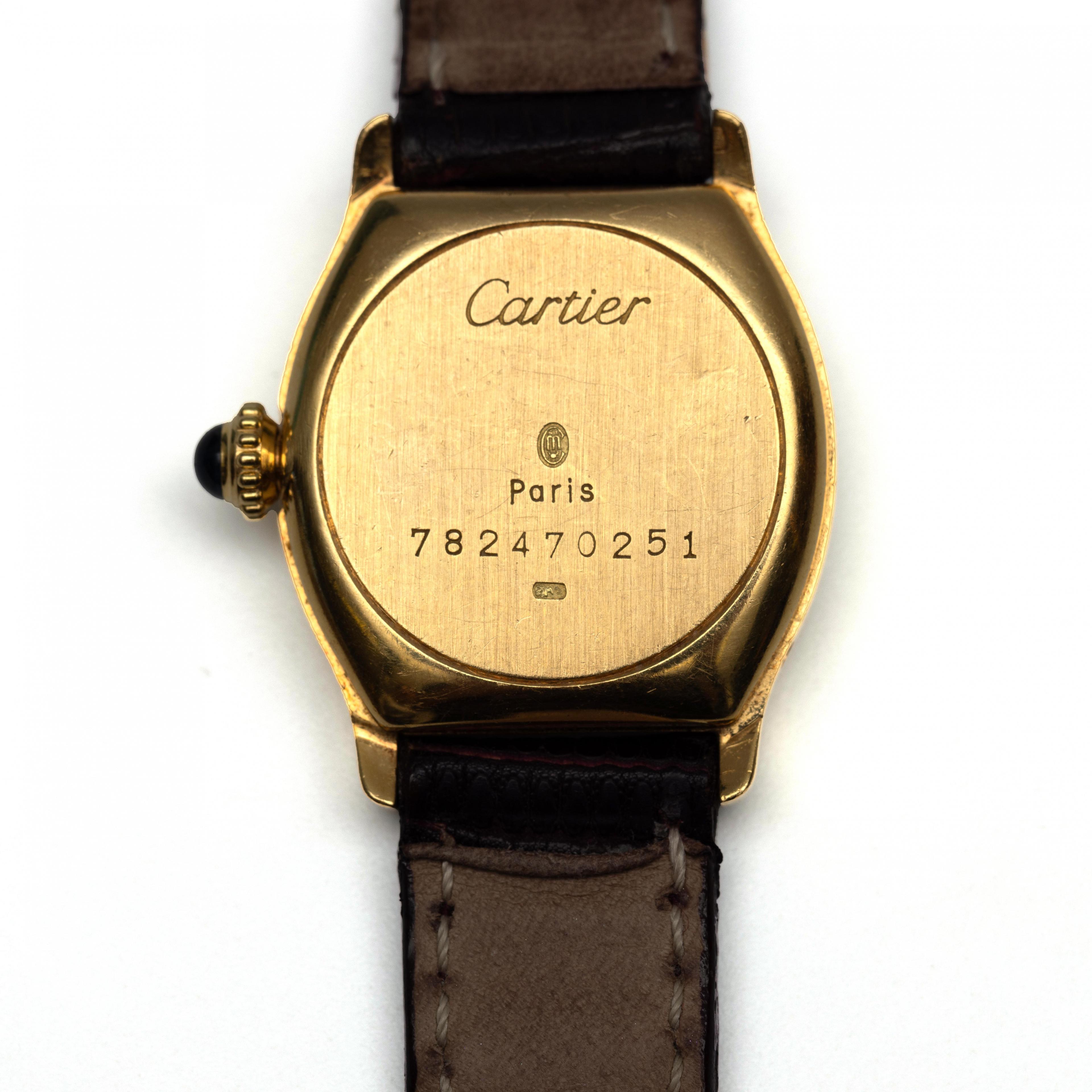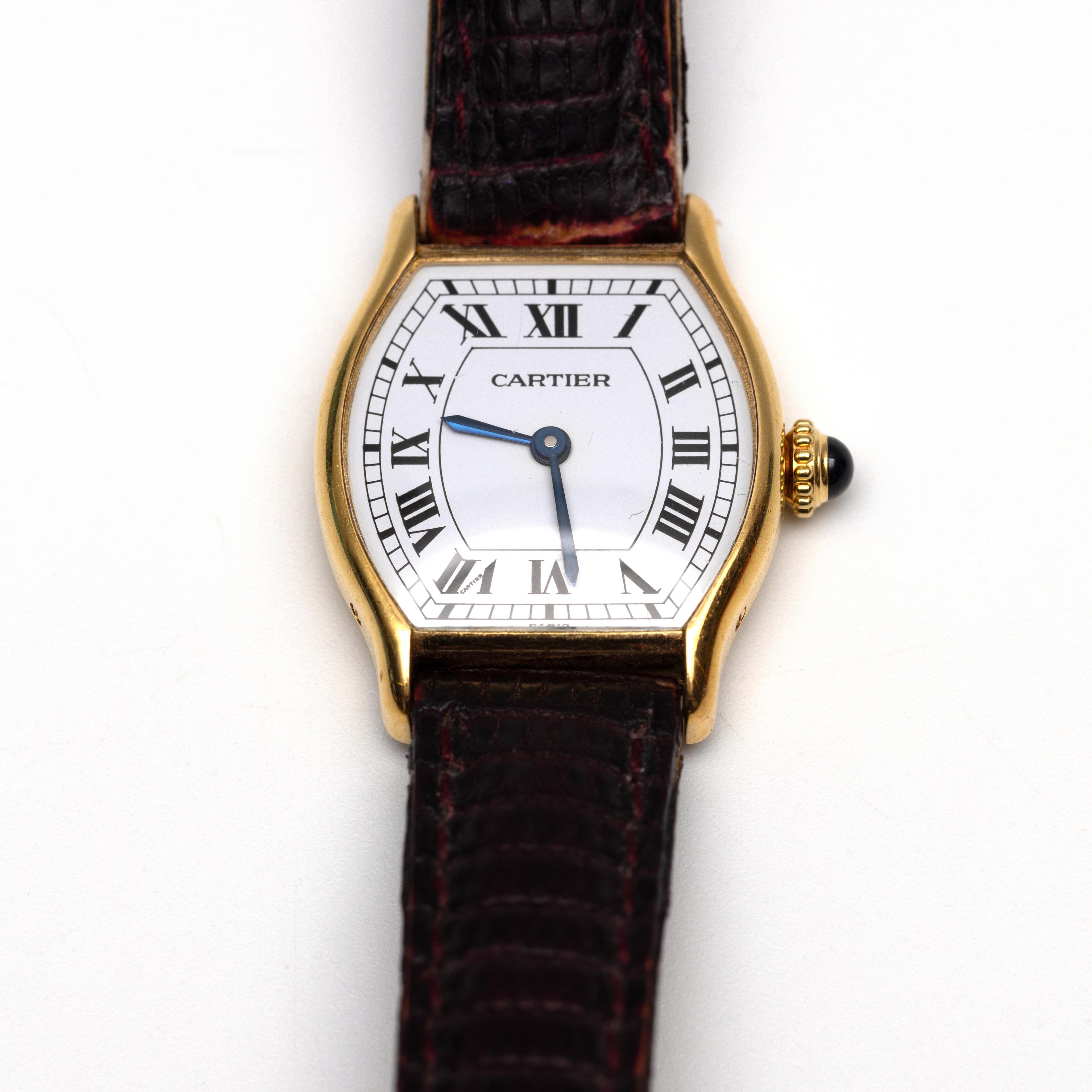 Cartier, 18 k. gold women's wristwatch, quartz. Tonneau-shaped case with white dial with Roman numerals. On a brown leather strap with original gold-plated clasp. The crown is set with a cabochon cut sapphire, ref no. 782470251.