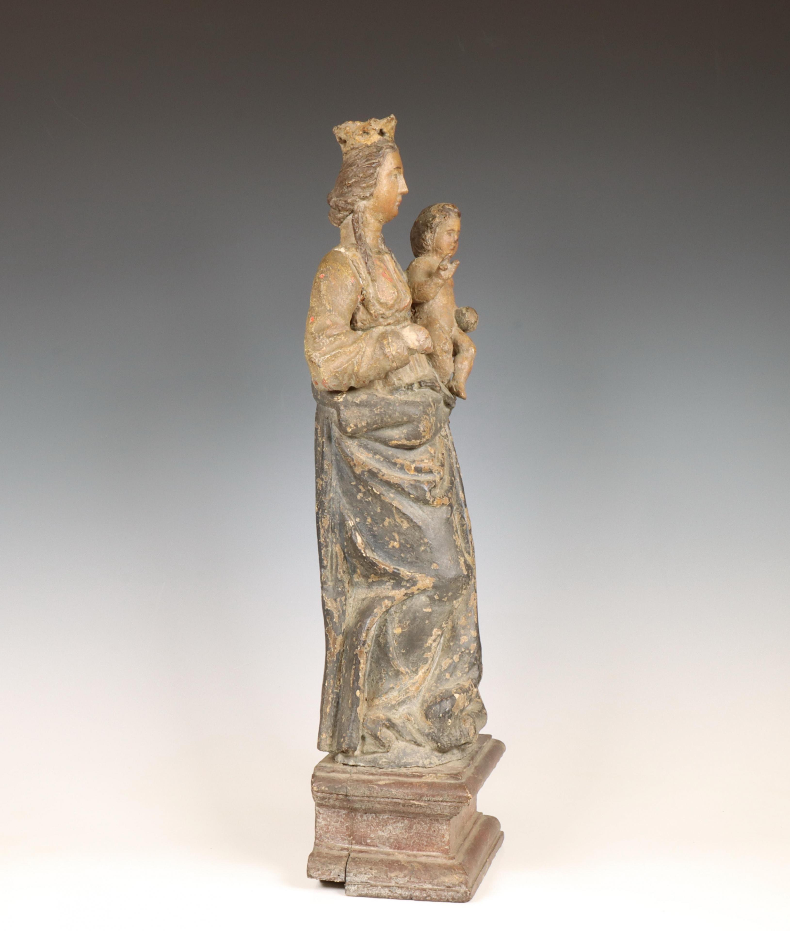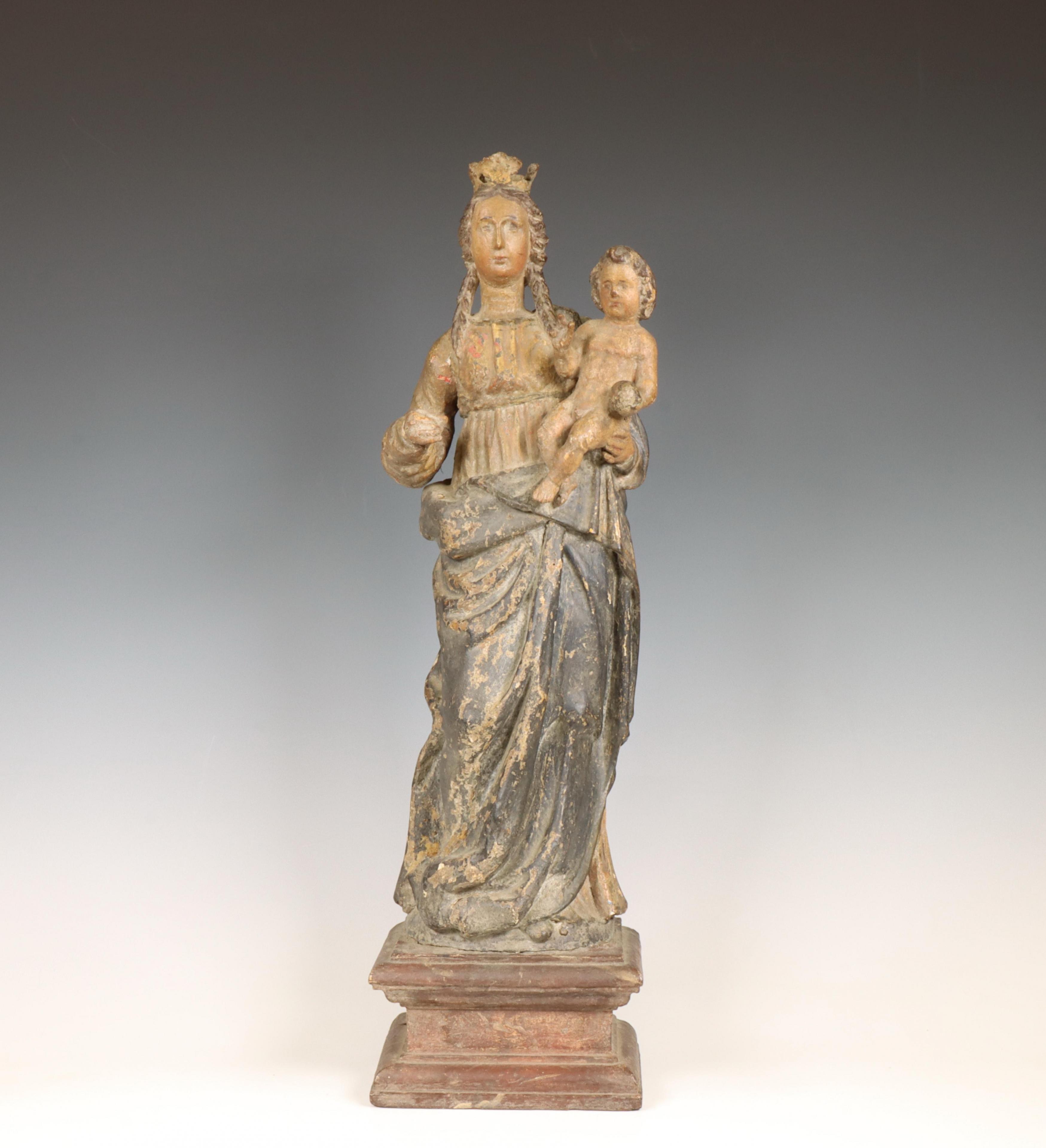 Italië, gestoken houten en polychroom geschilderde Madonna en kind, op vierkante sokkel, 18e eeuw.
