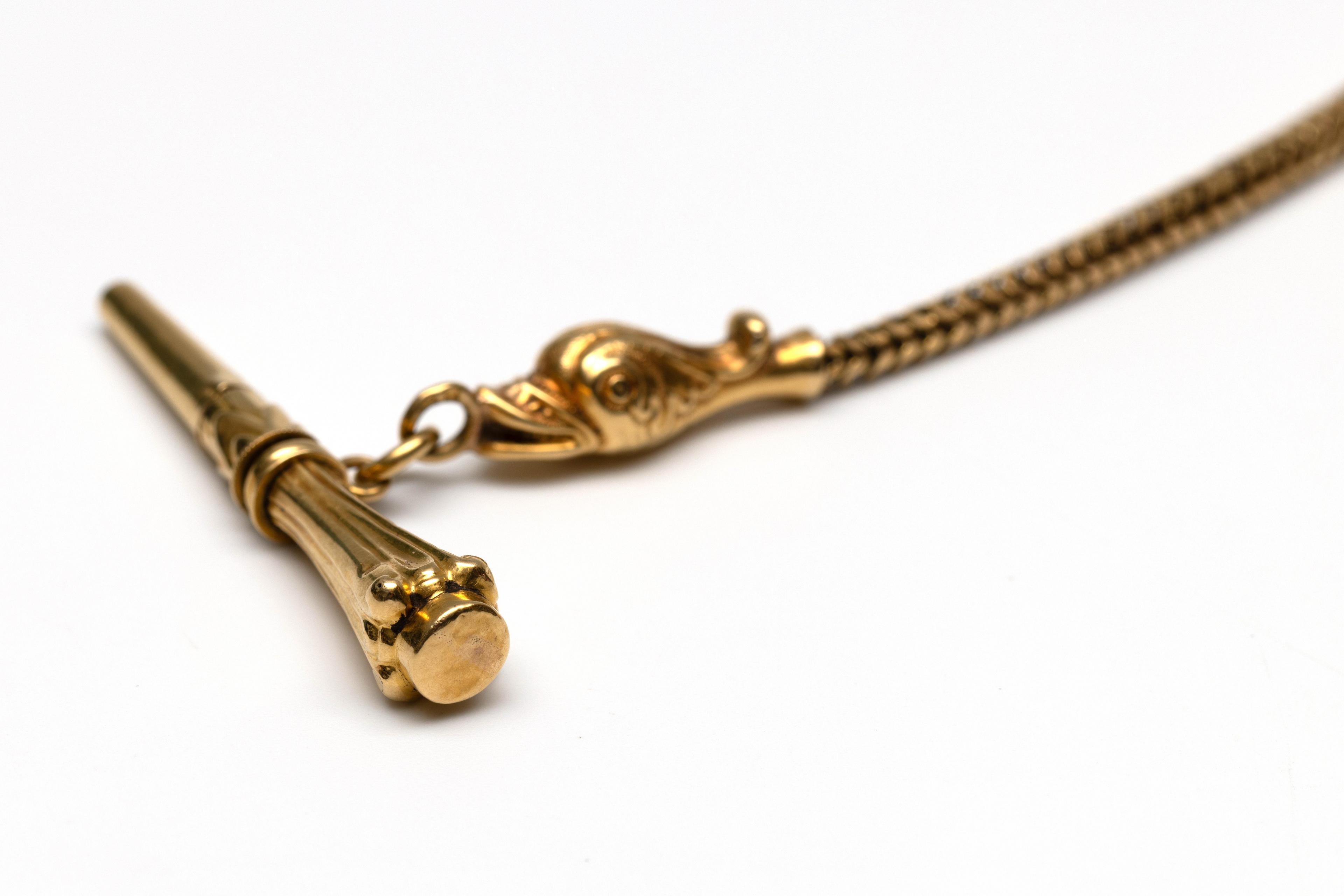18 k. gold watch chain, 19th century. Made from a snake chain, ending in a dolphin head with a watch key