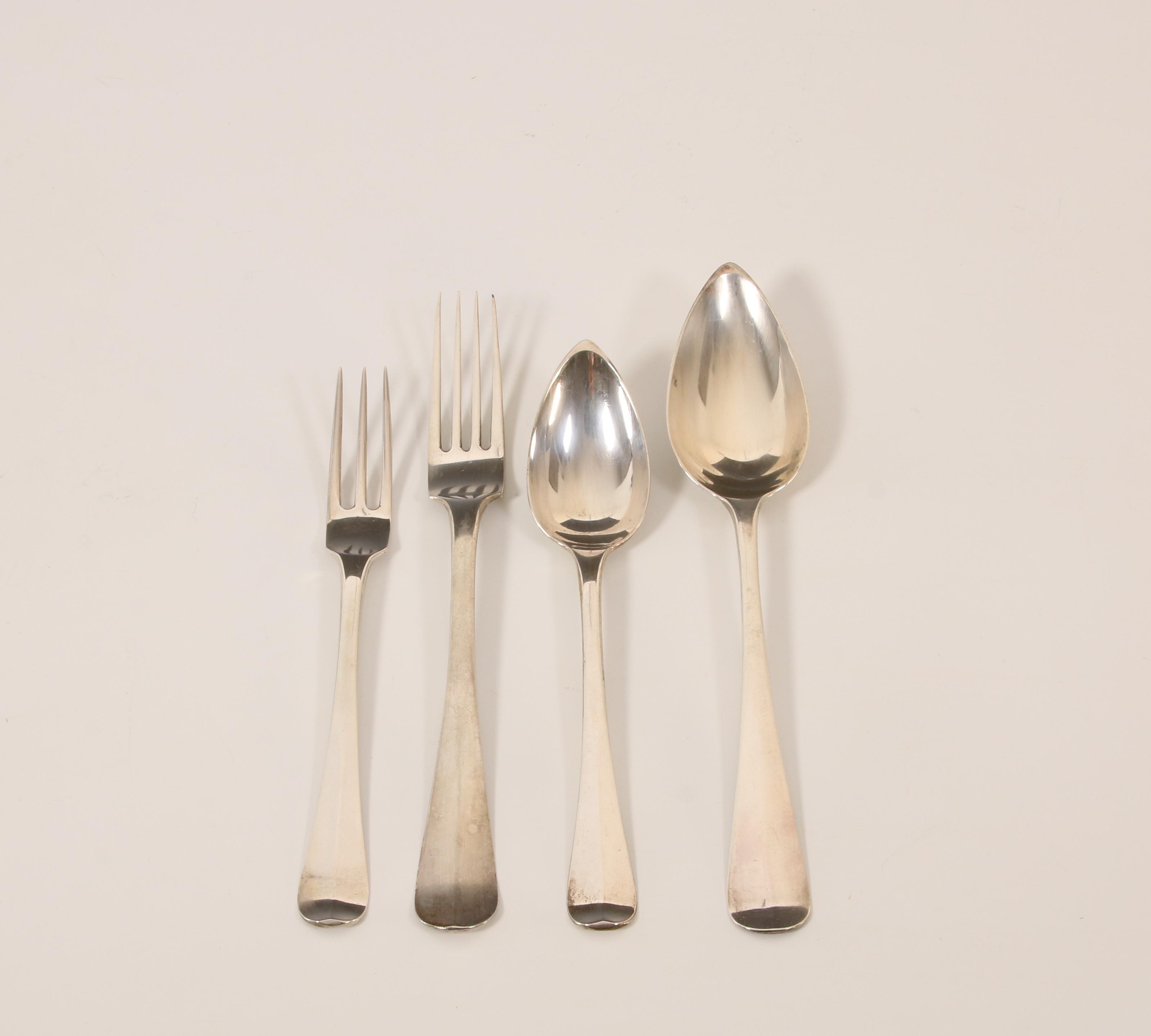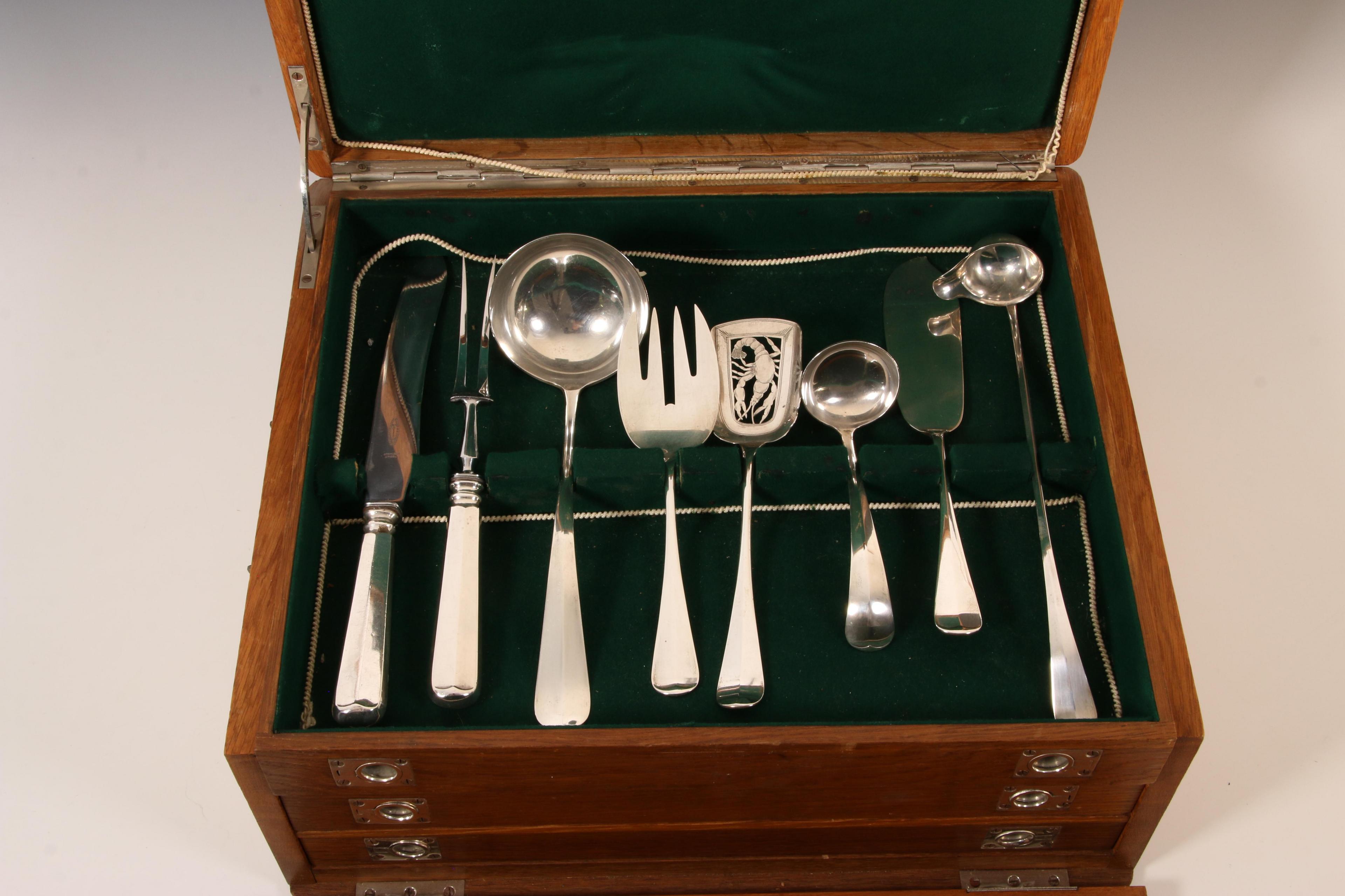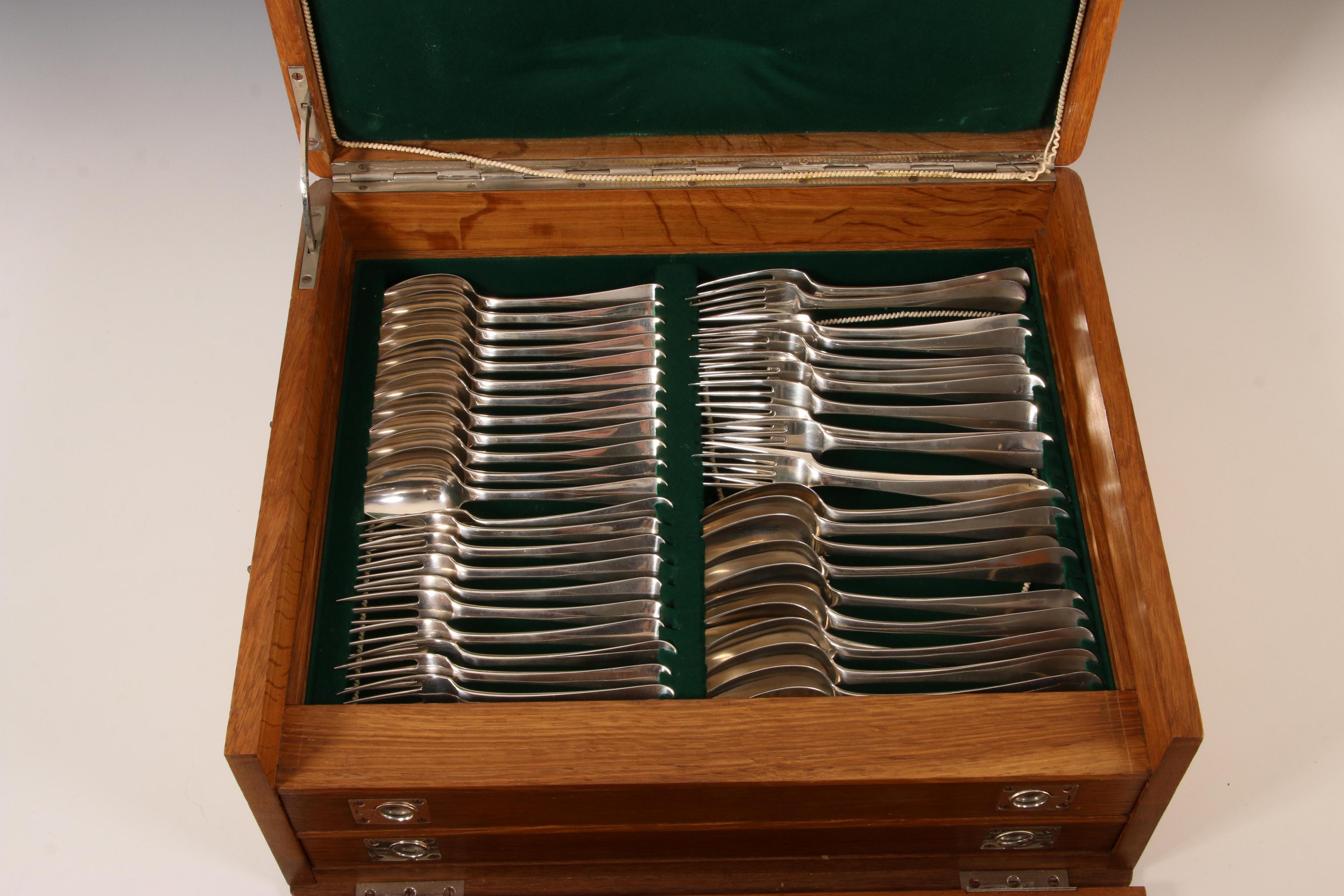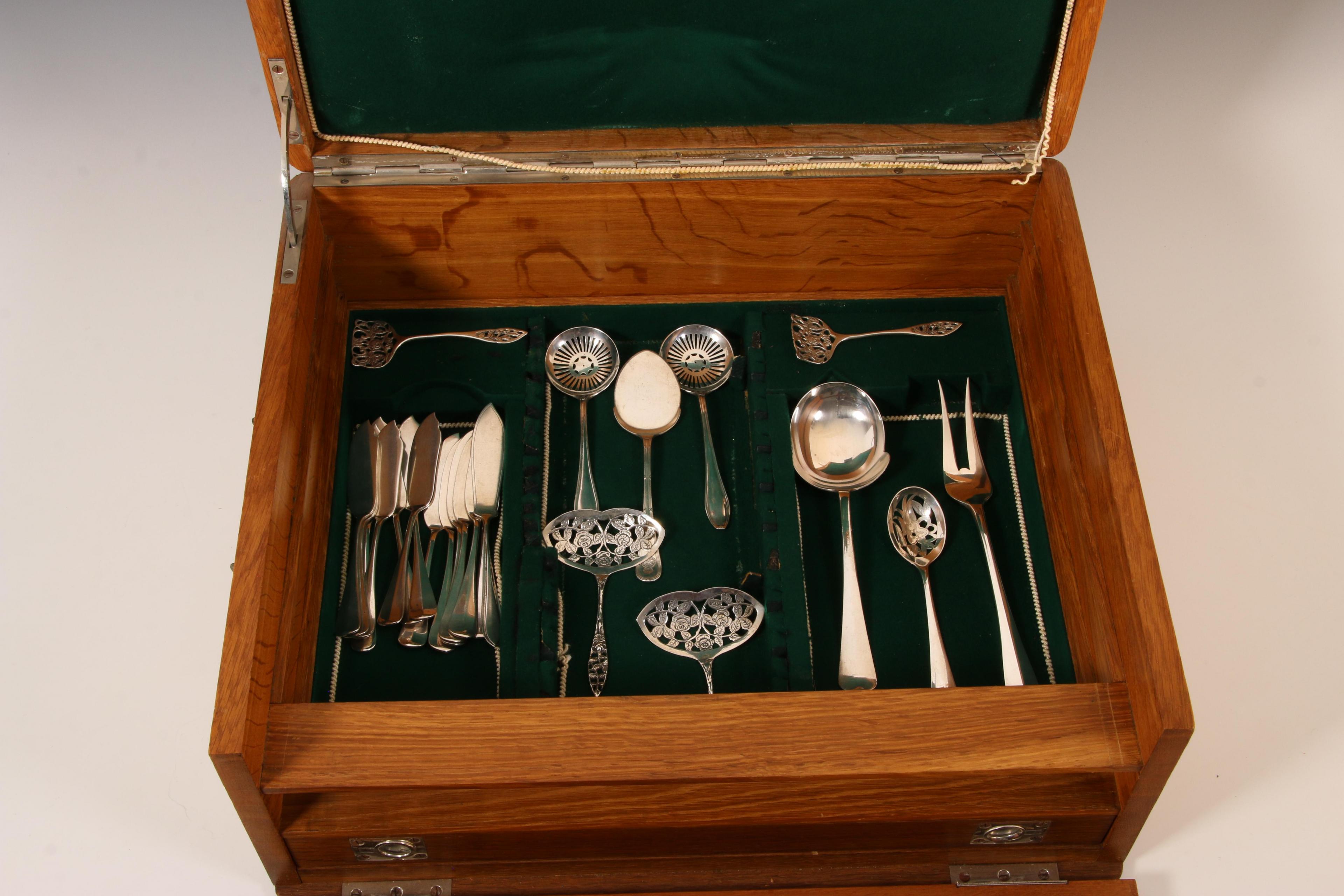 voornamelijk rond model met kam, diverse meestertekens en jaarletters, bestaande uit: twaalf tafelcouverts, twaalf dessertcouverts met mt. Helweg & zn. Wed. Helweg, veertien boter/vismesjes-, tien opdienlepels en vorken en acht klein opscheplepels(diverse stijlen en periodes), hoofdzakelijk 2e gehalte, cassette met grepen en drie lades en klep, interieur met groen vilt bekleed,