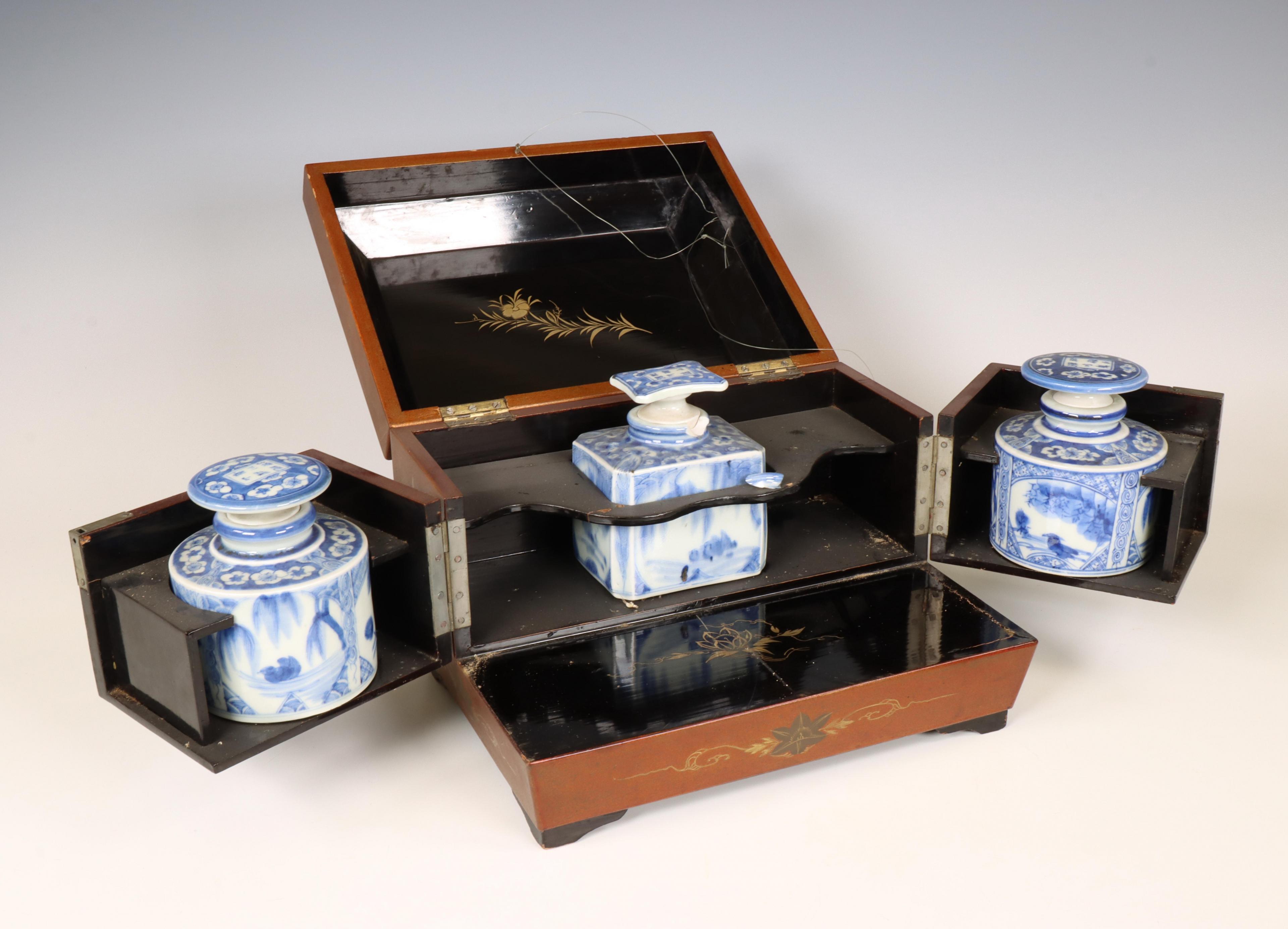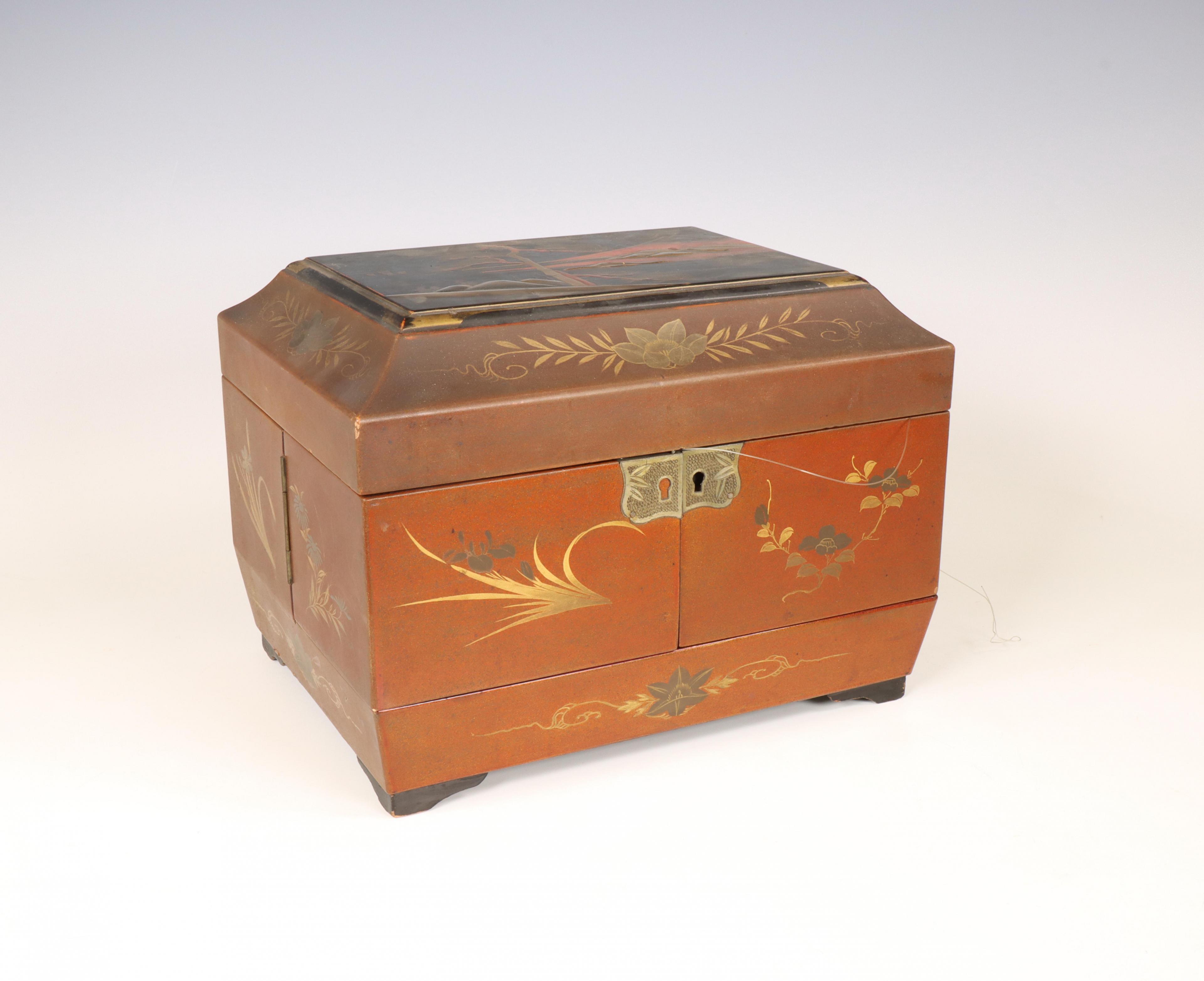 de deksel gedecoreerd in gouden, rode en zwarte lak met de Fujiberg, het interieur met een paar ronde en een rechthoekige blauwwitte theebussen (sleutel ontbreekt, kleine beschadigingen)