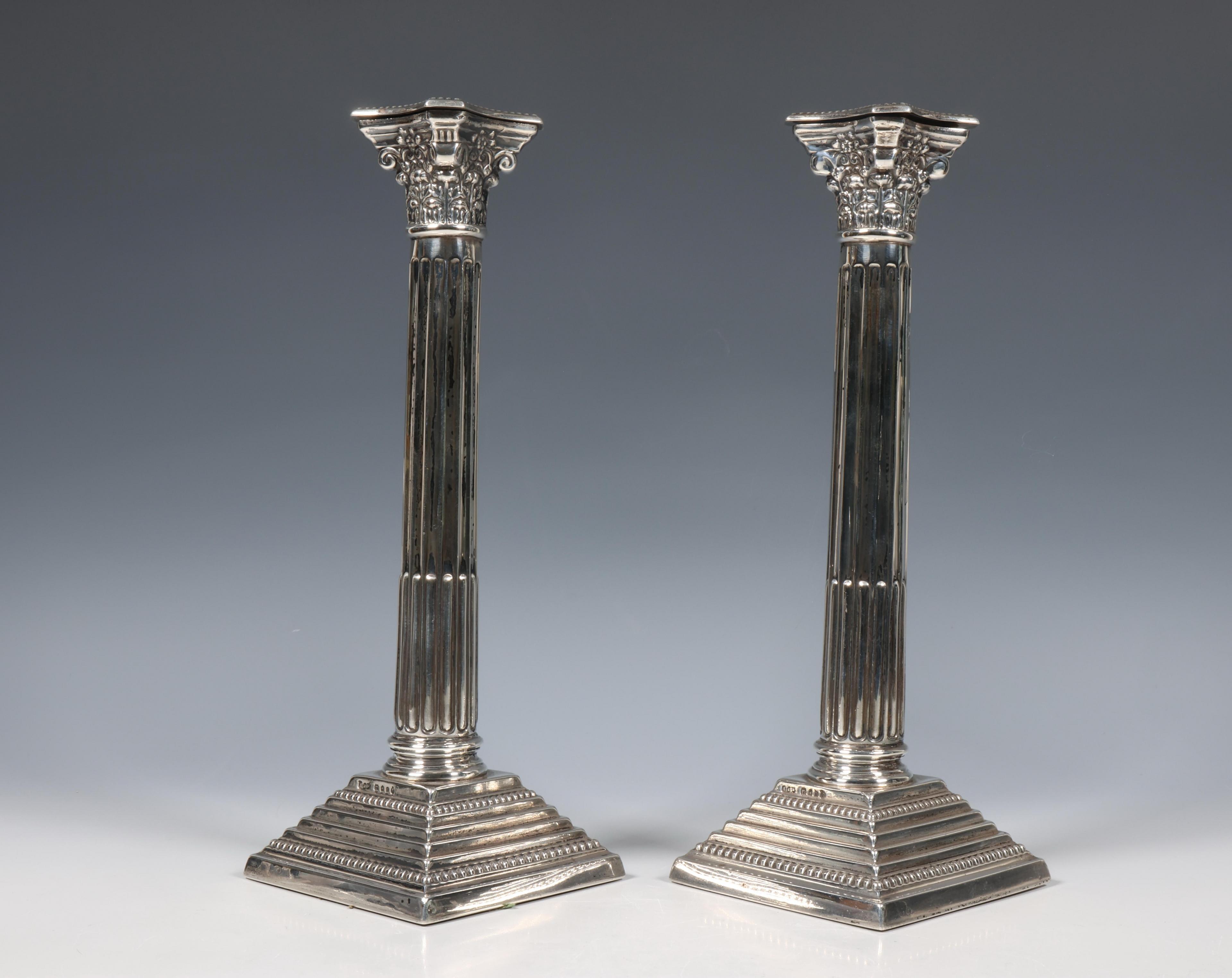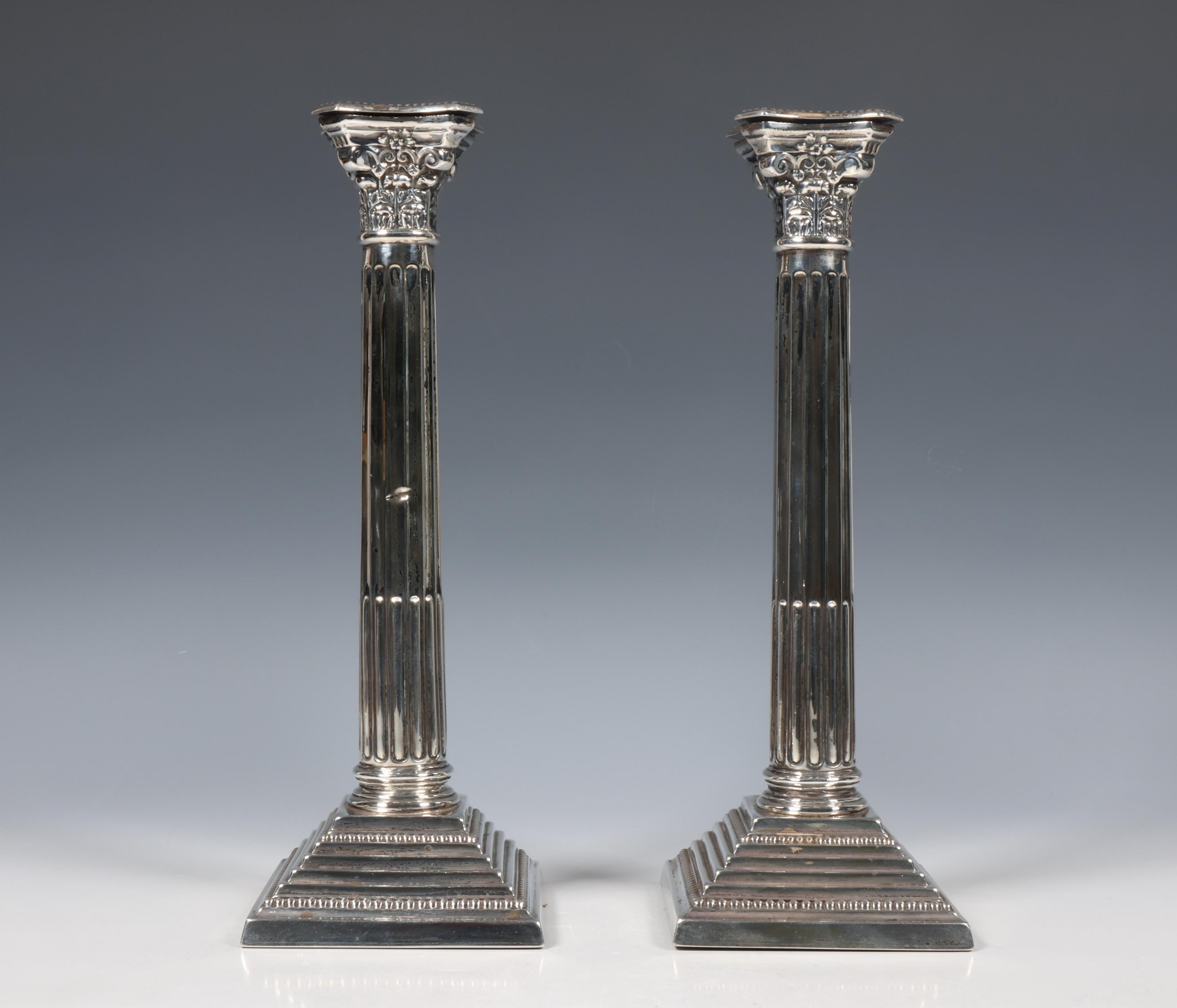met bobèches, kaarsenhouder Korintische kapiteelvorm, op vierkanten getrapte basis, mt. A. Taite & Zons Ltd. (waarschijnlijk) Londen 1935, 1e gehalte,