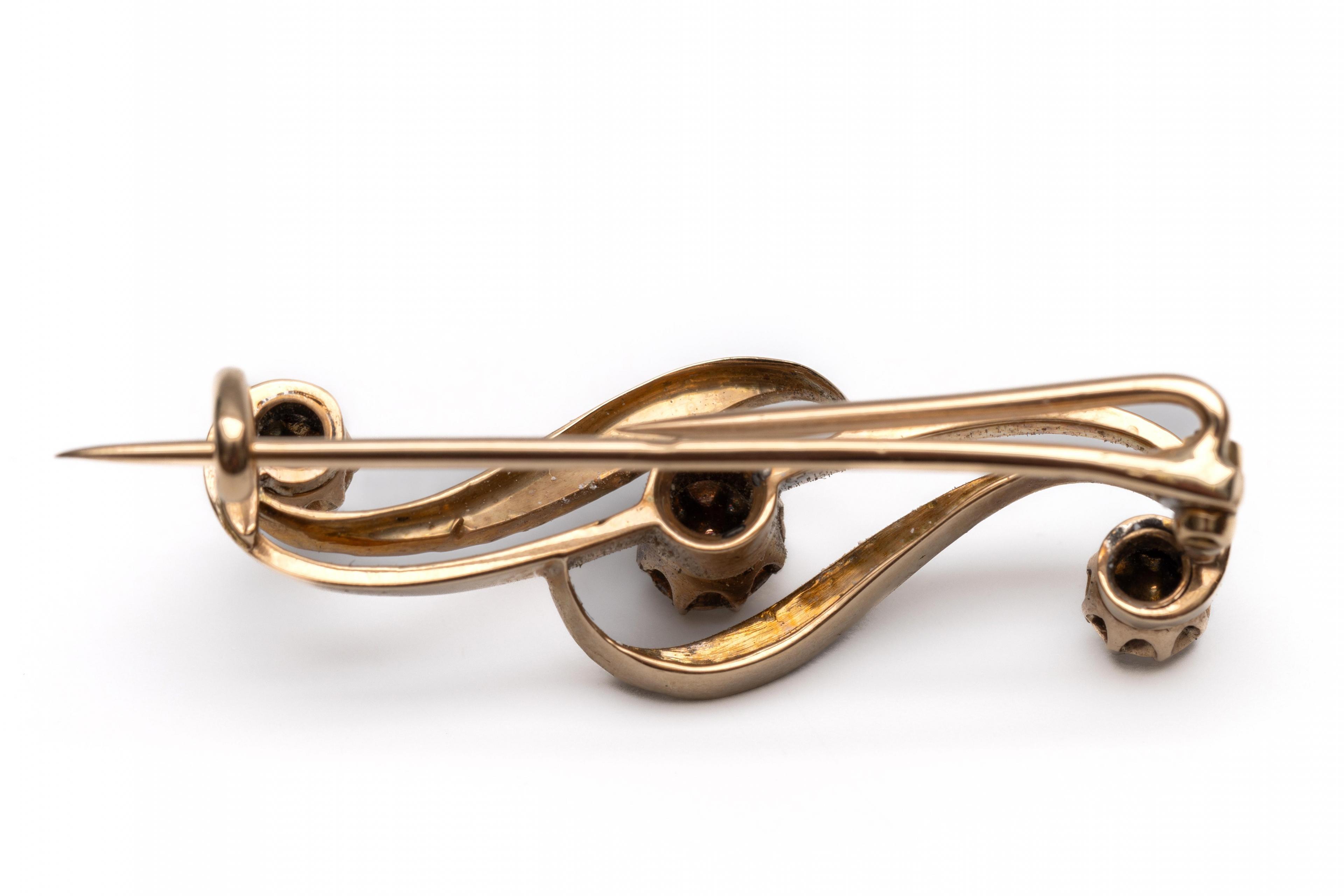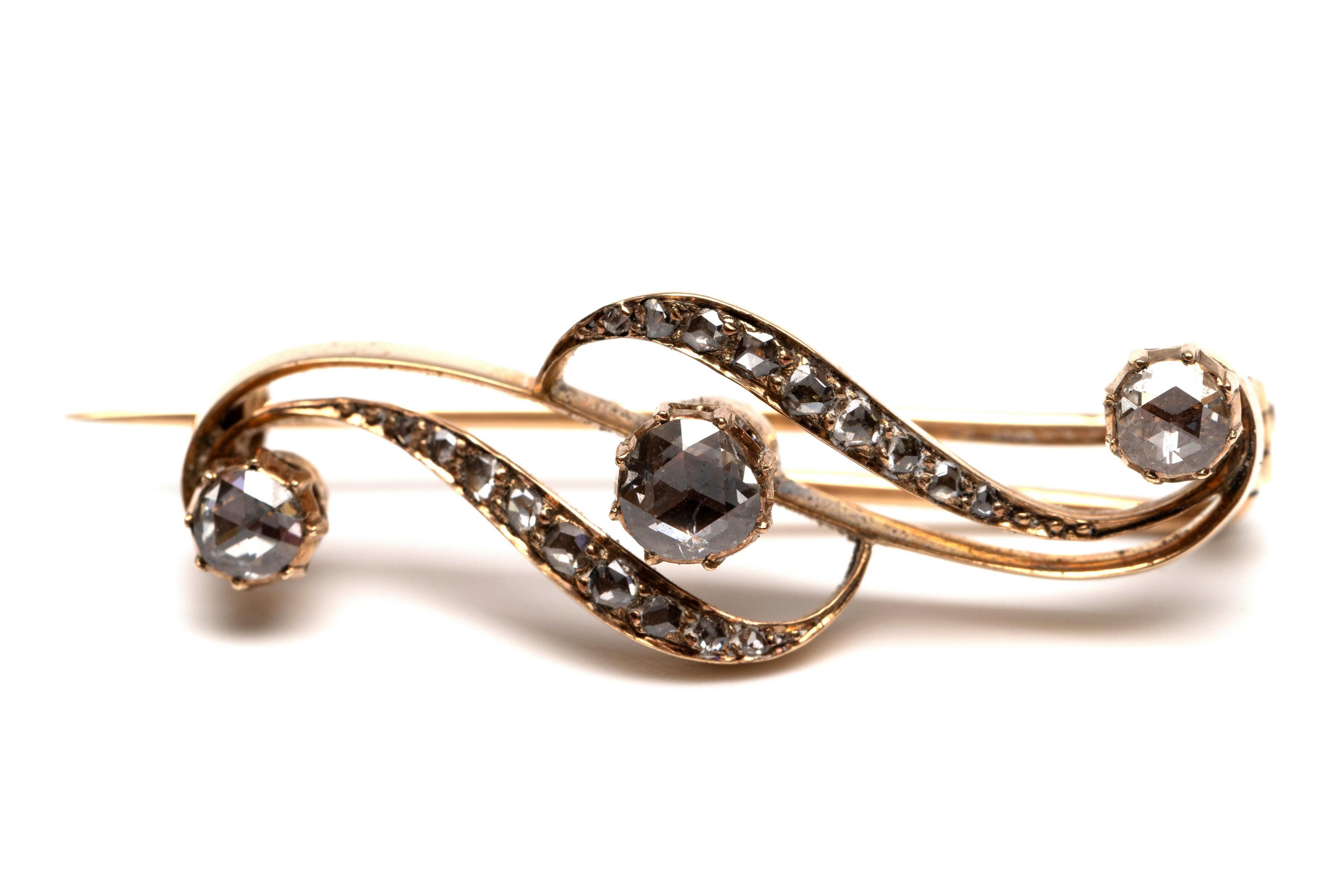 14 k. gold crossover brooch, 19th century. Set with rose cut diamond, the central stone with a diam. of approx. 4.9 mm.