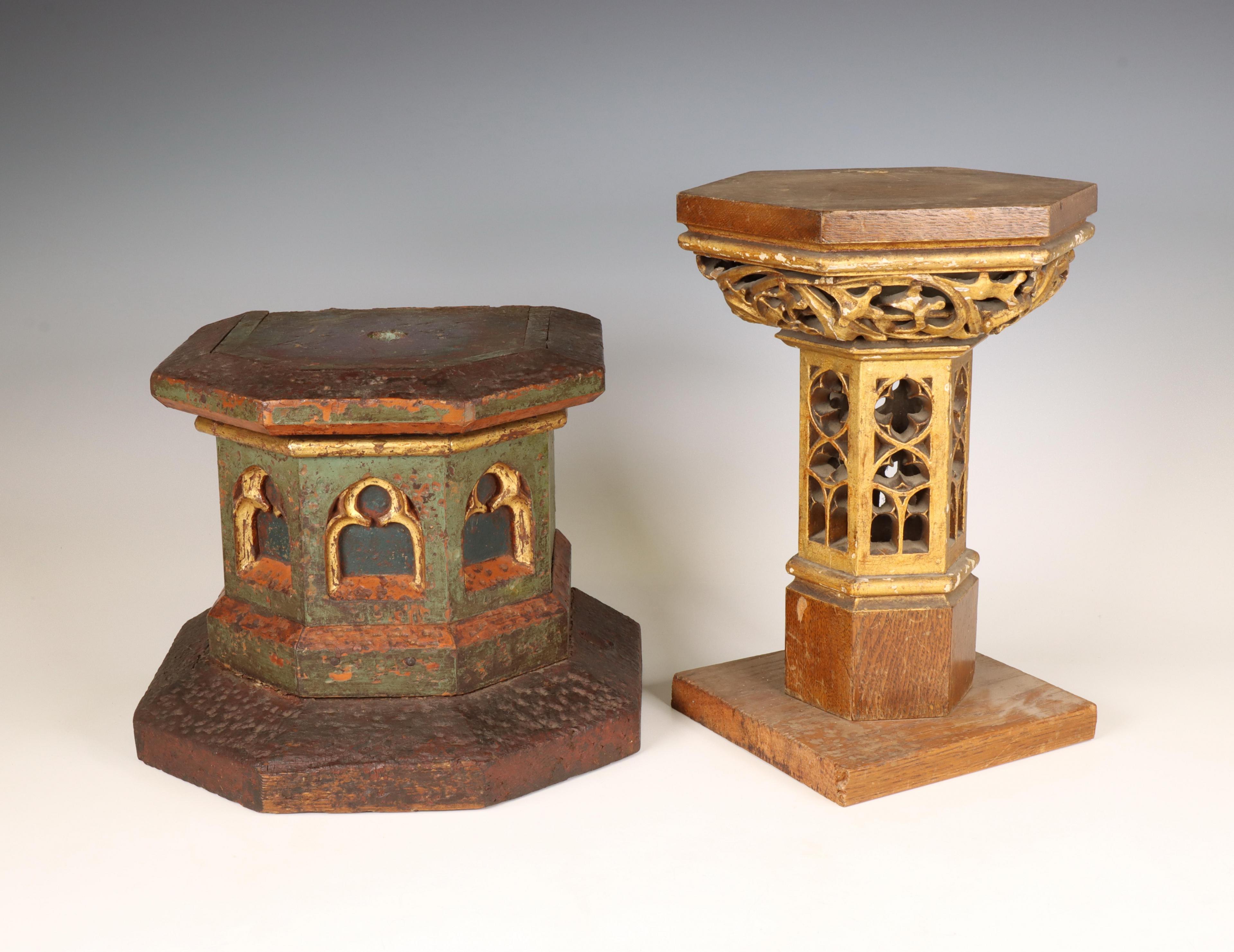 Twee houten gestoken houten sokkels voor heiligen beelden;