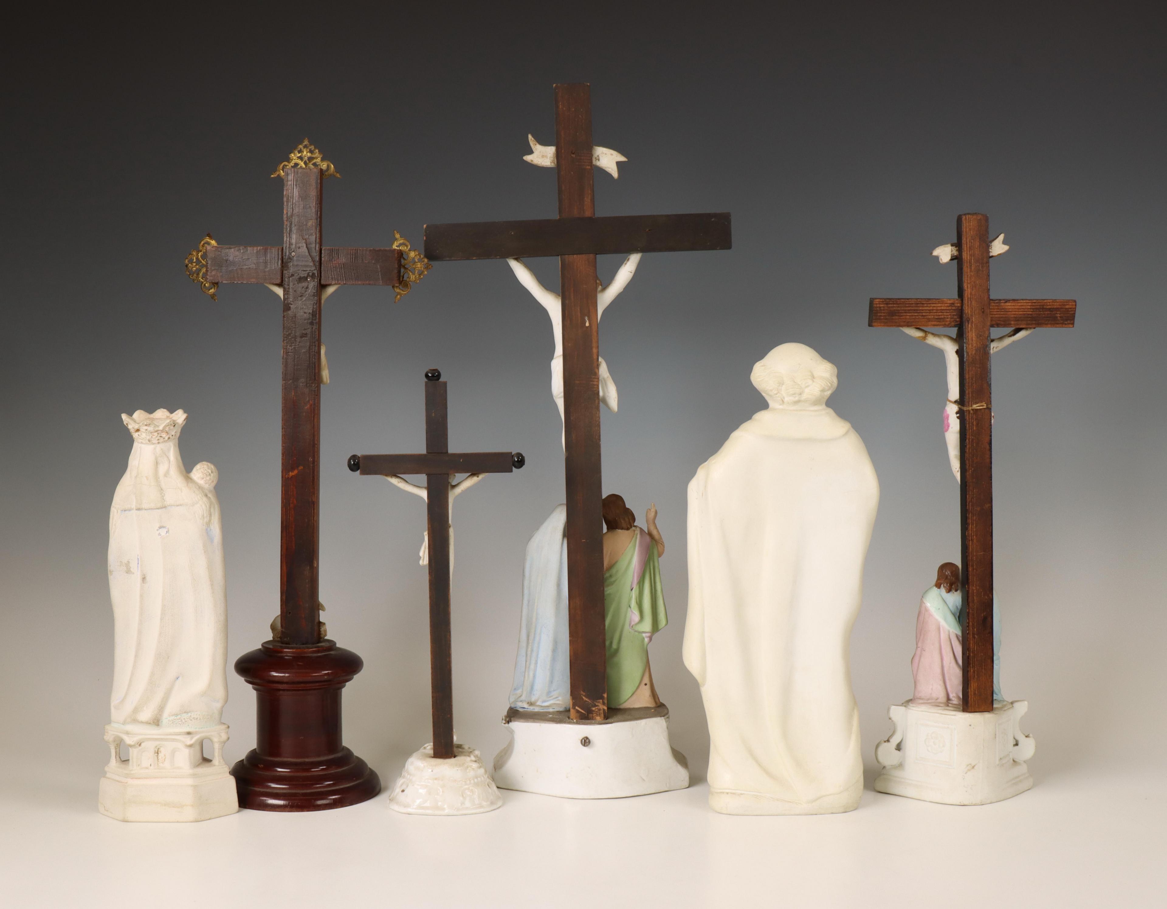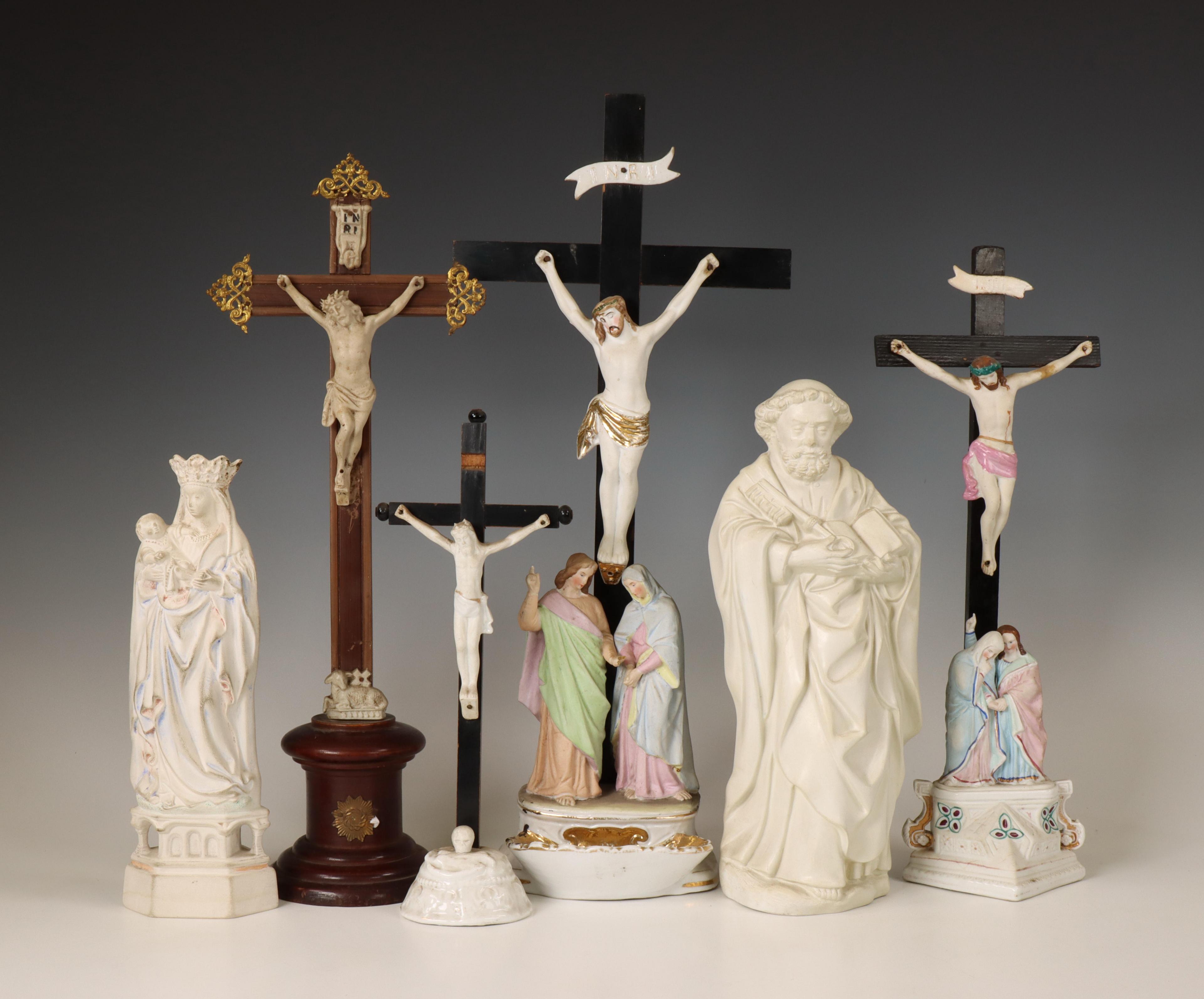 Vier crucifixen en twee gipsen vormstukken van Heiligen , ca. 1900;