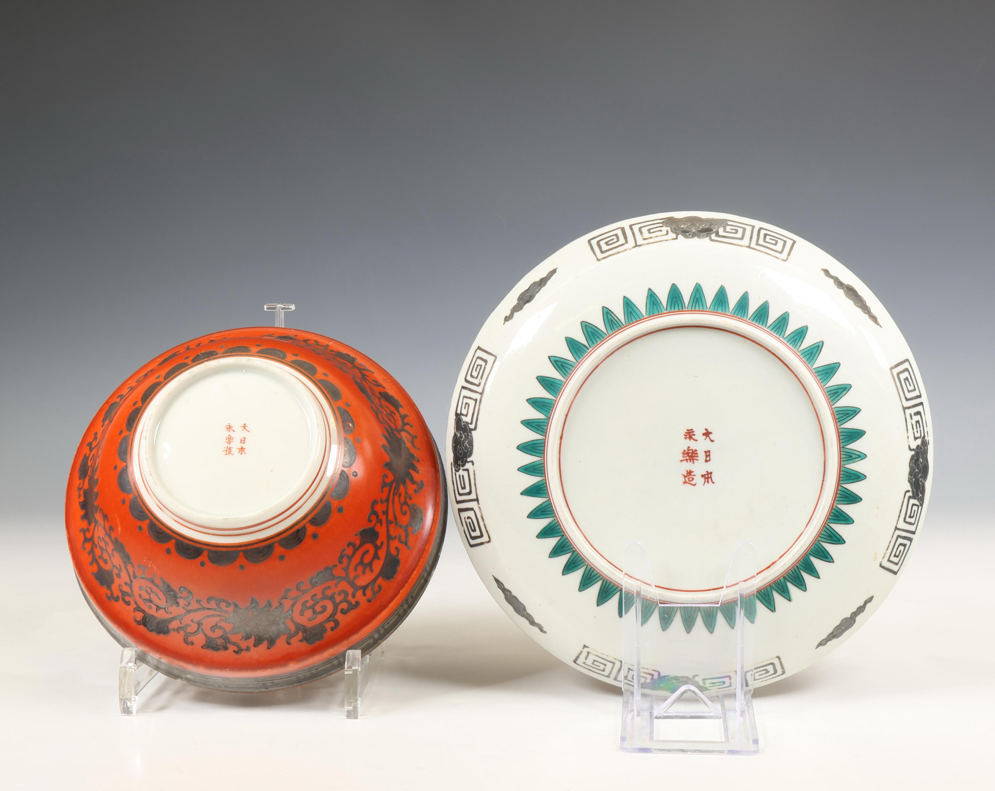 China, roodgeglazuurde Ming-stijl kom en bord,