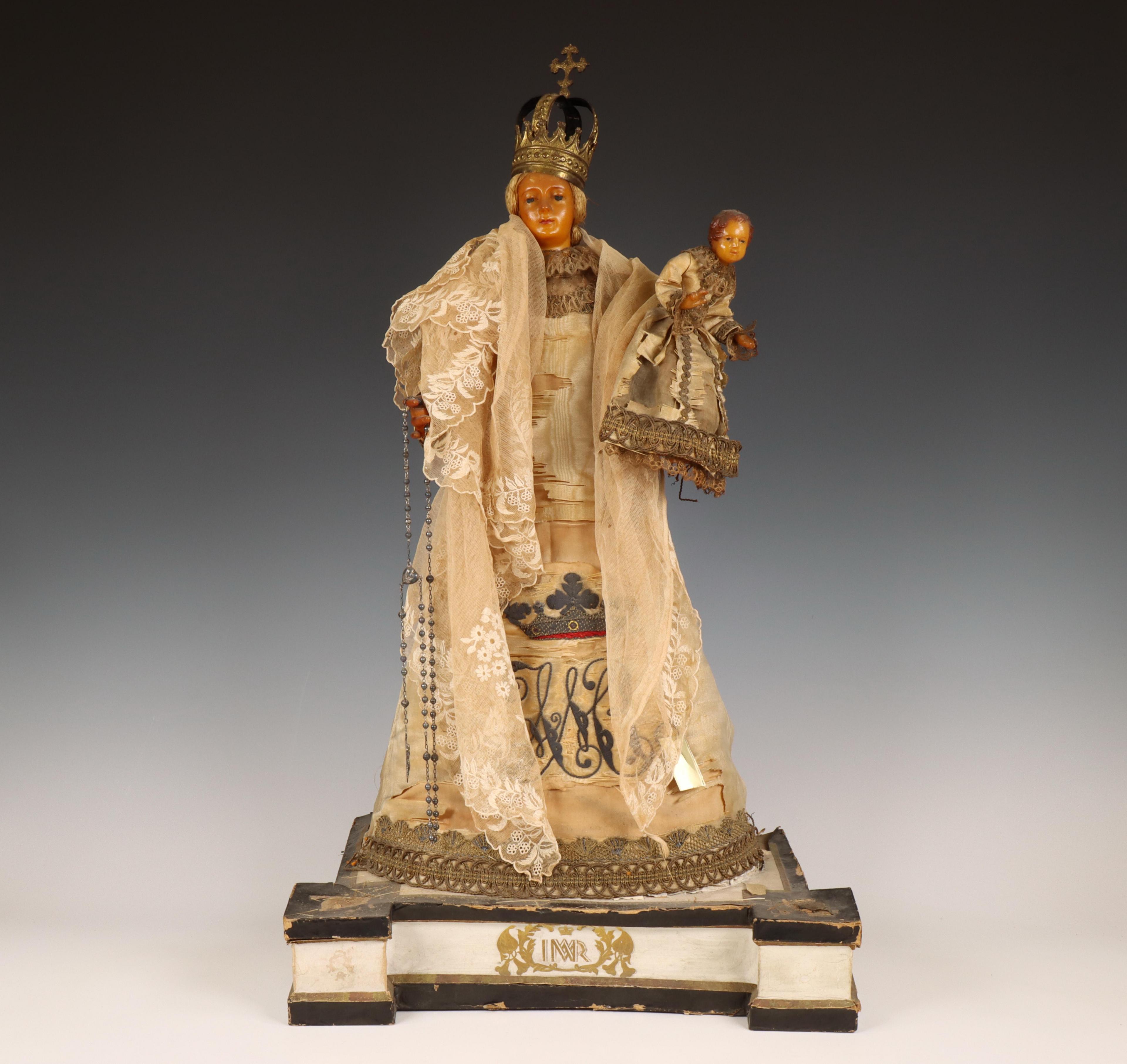 Uitygevoerd met wassen hoofden, koperen kroon en textiel. Op kartonnen voet.
