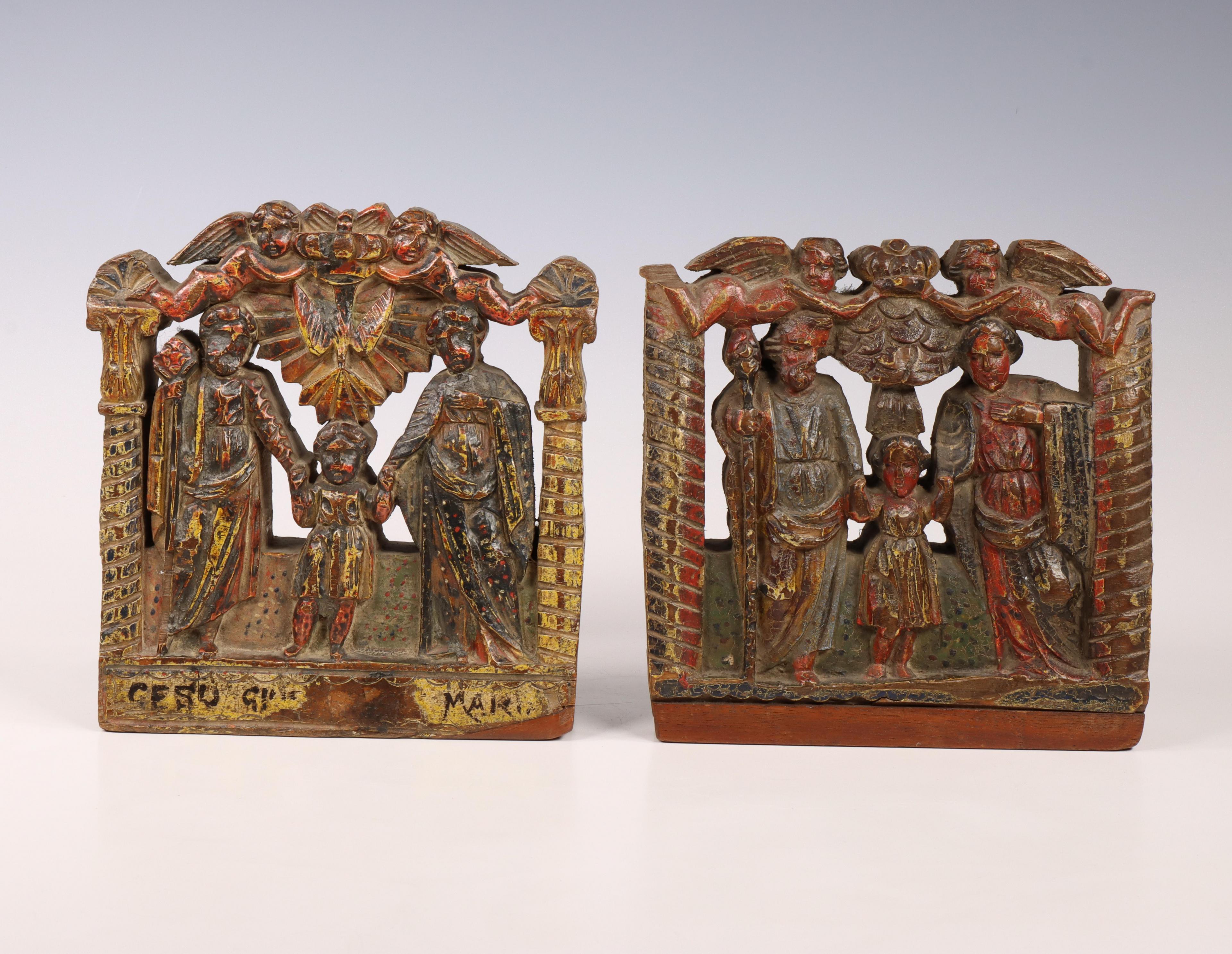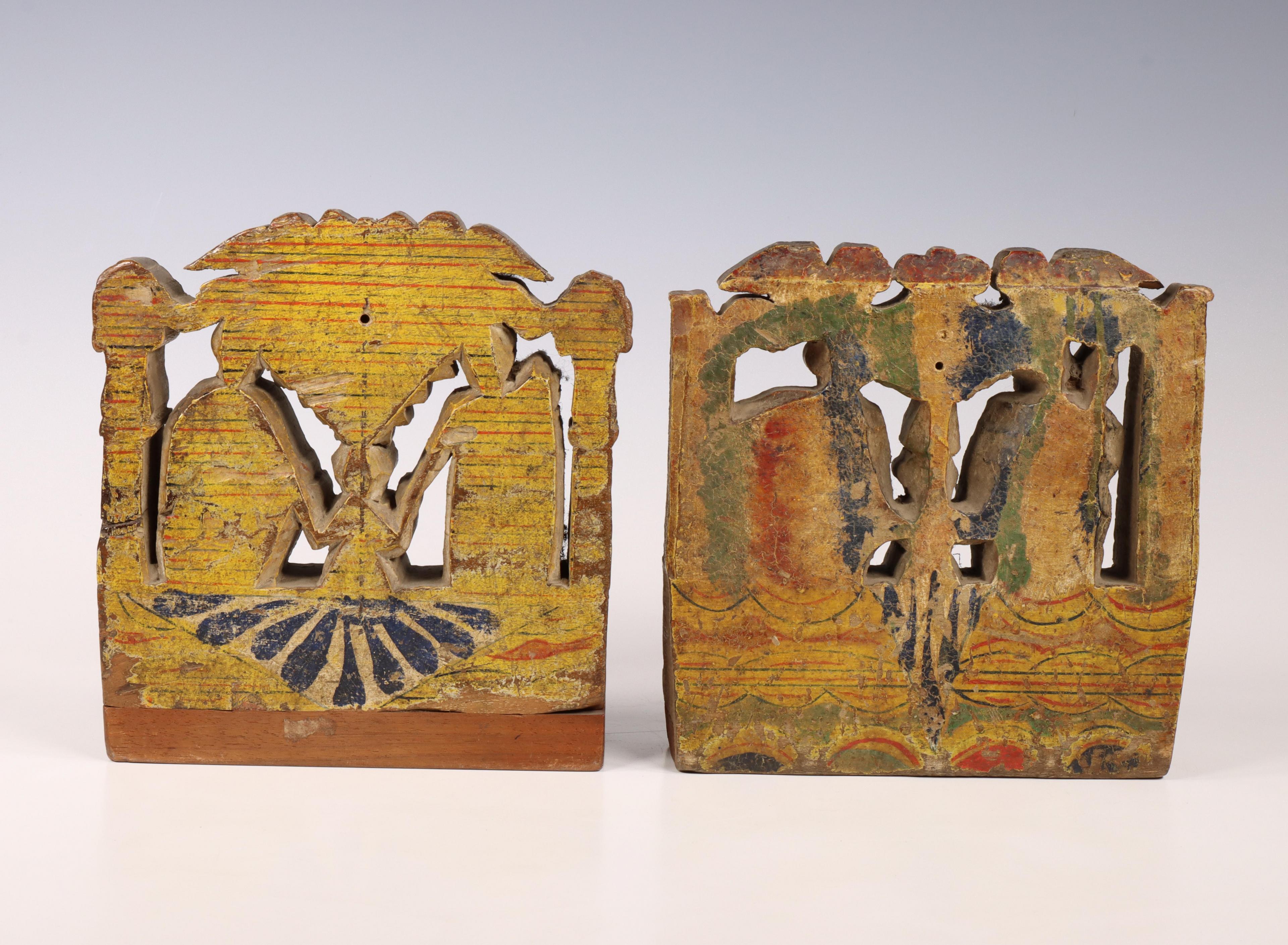 India, paar gestoken houten en polychroom geschilderde boekensteunen met religieuze voorstellingen.