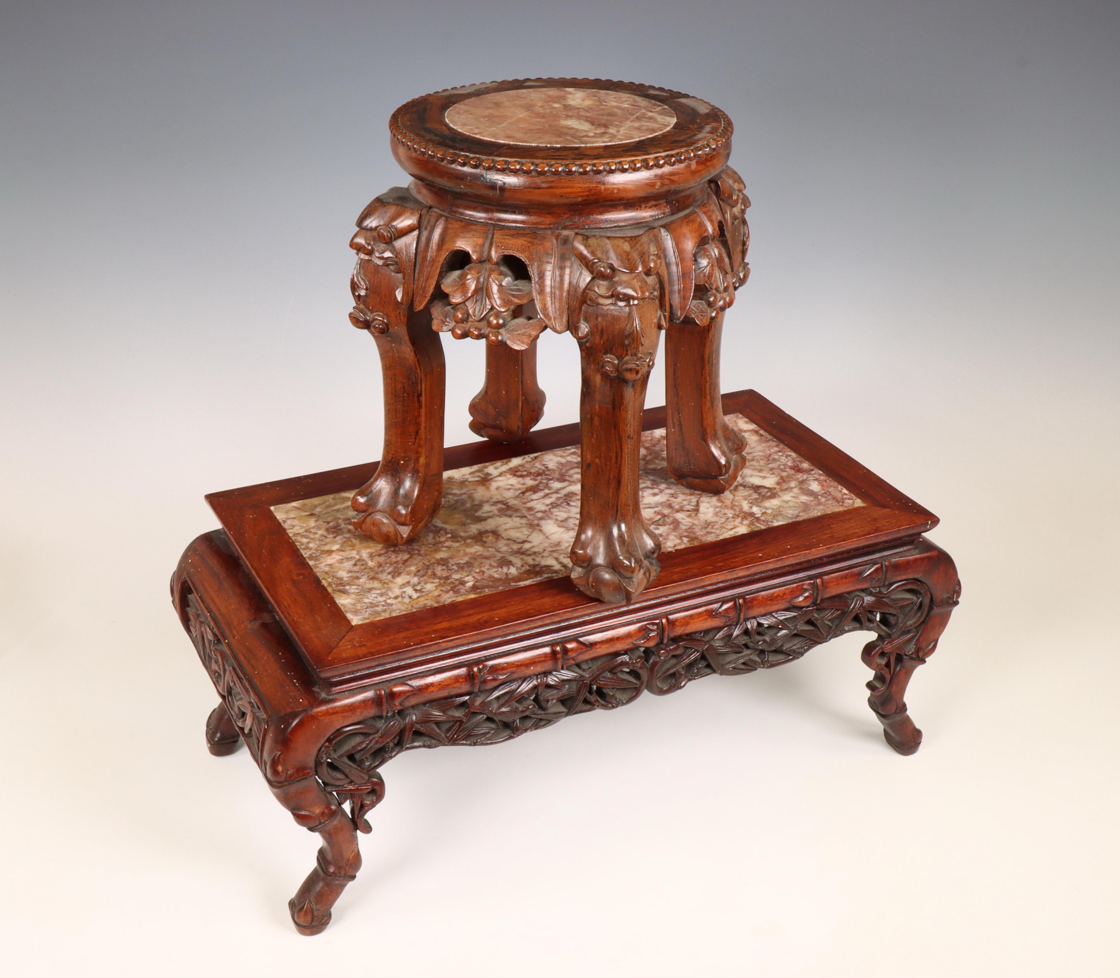 China, twee houten met marmer ingelegde plantentafeltjes, 20e eeuw,