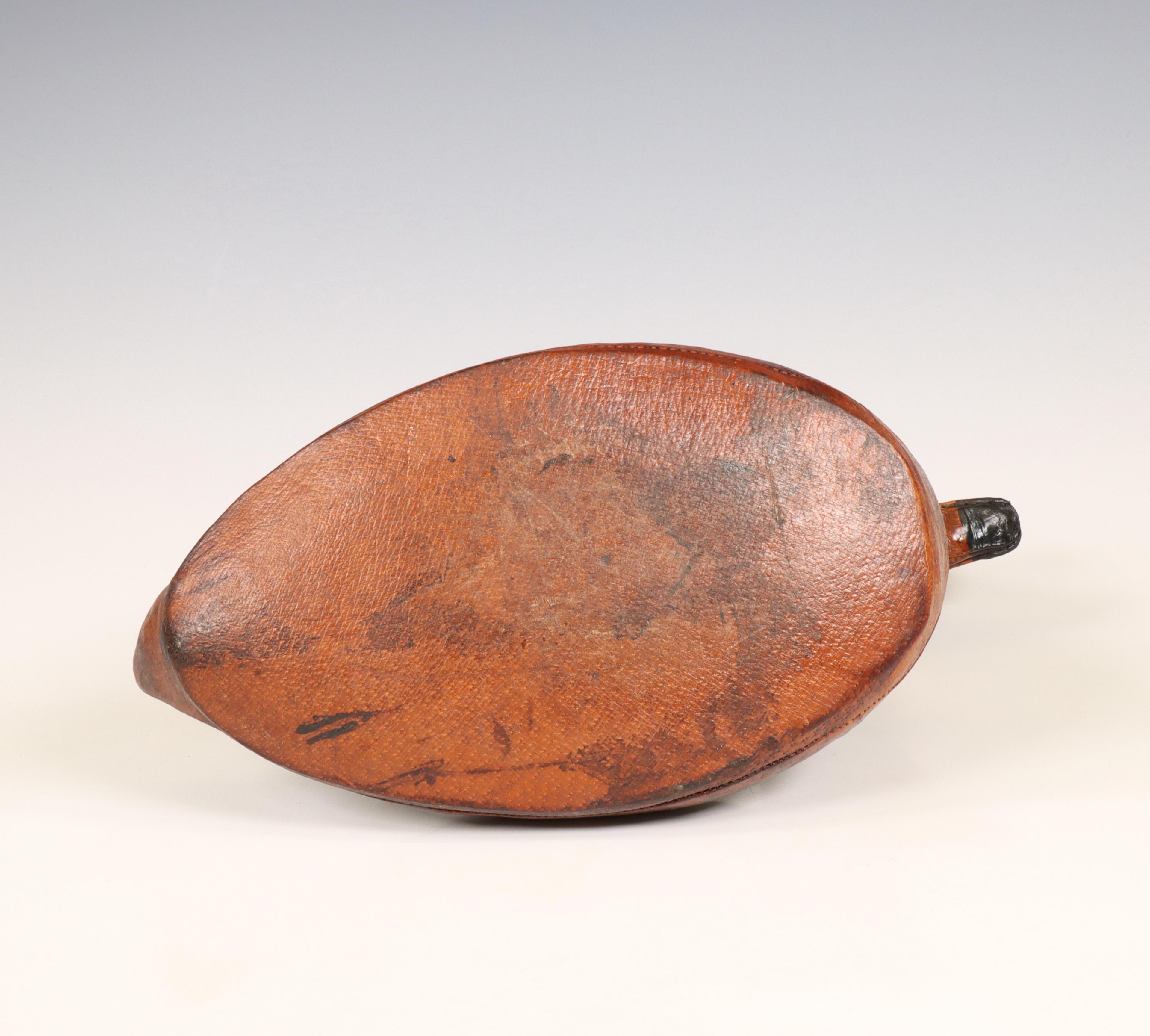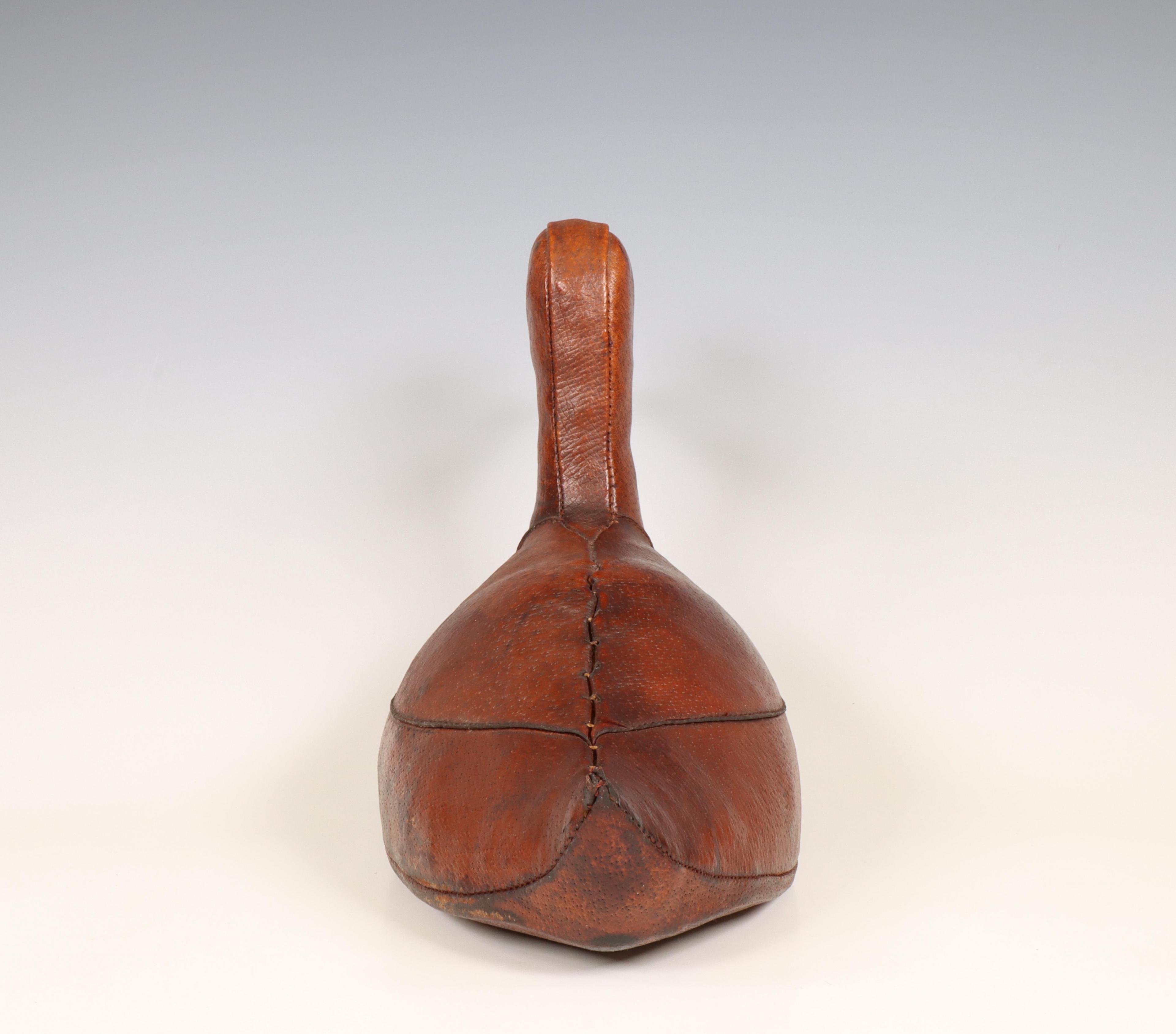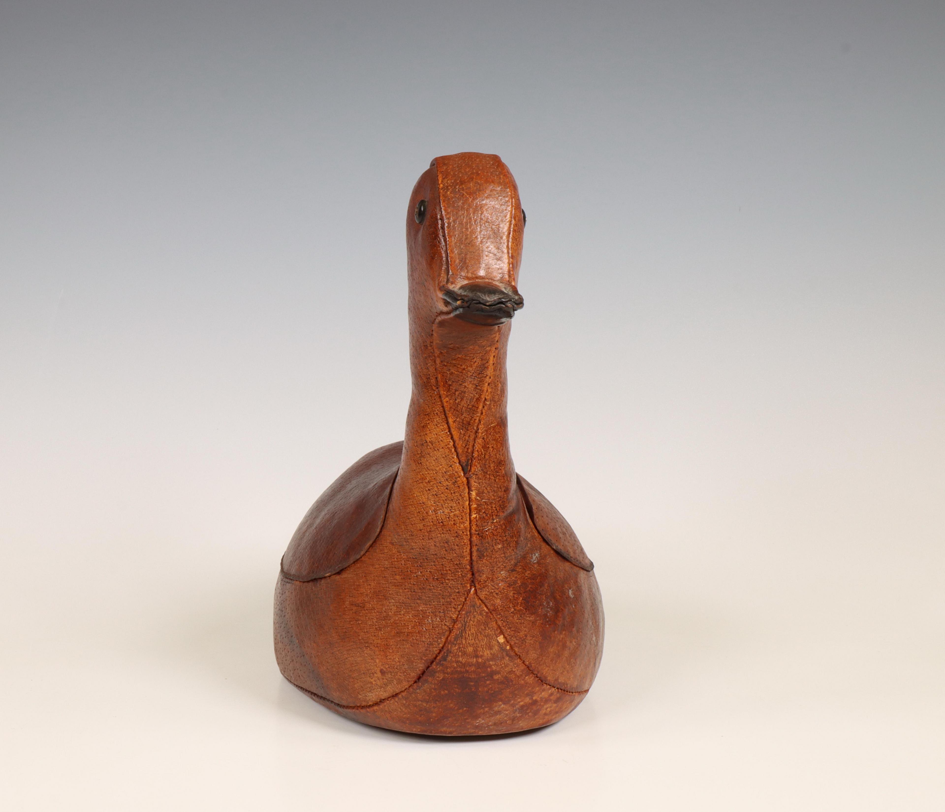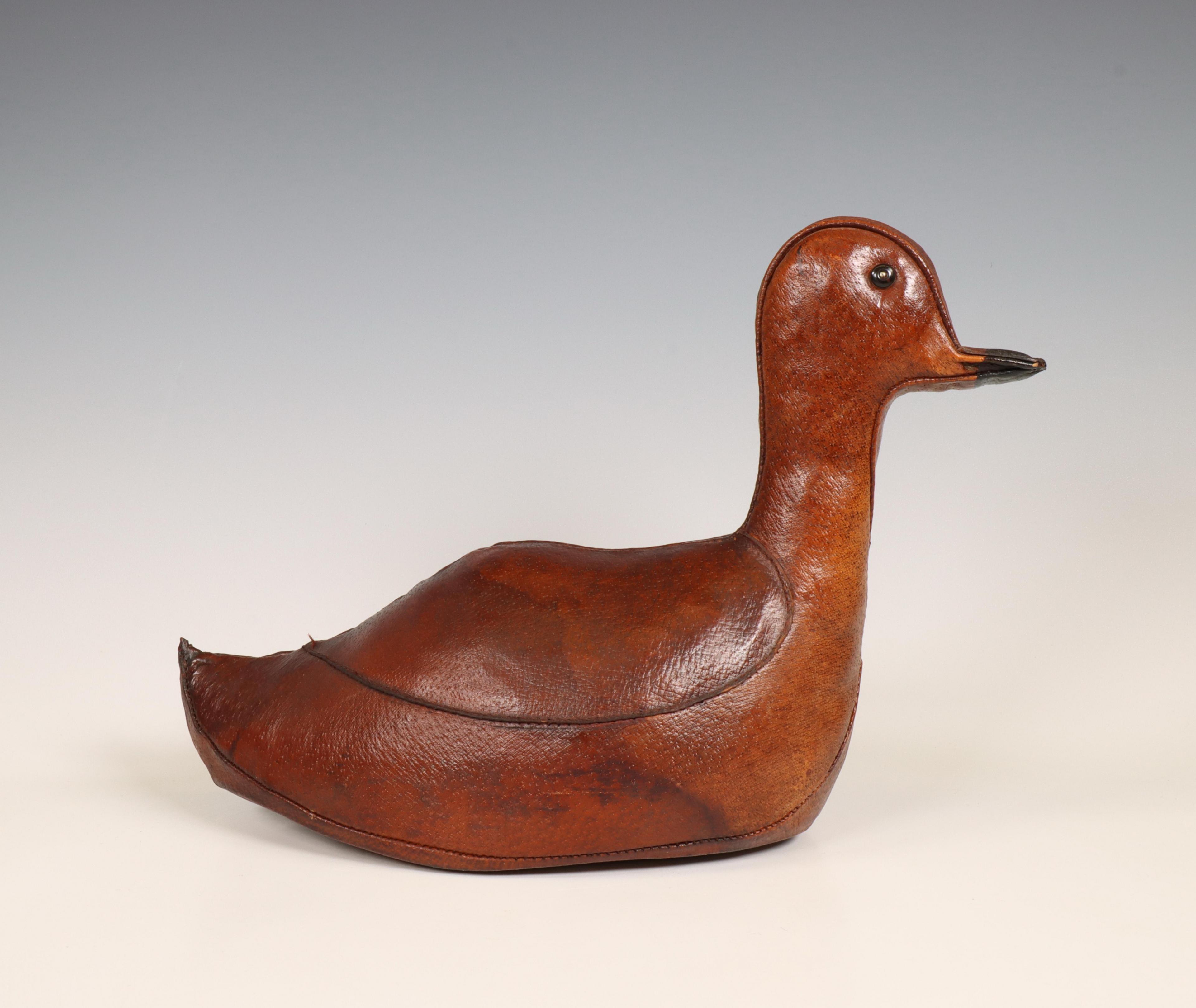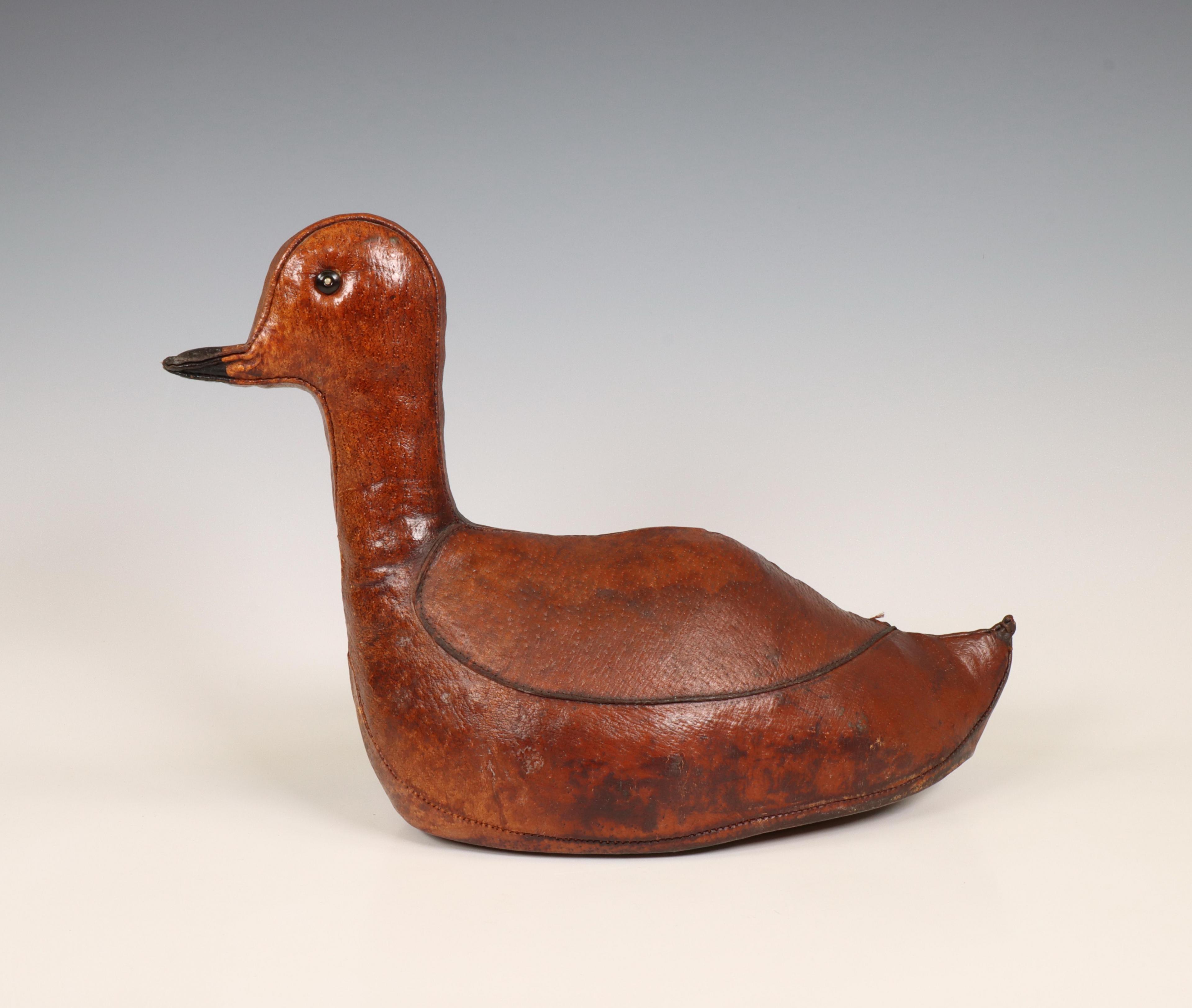 Bruin leren en verzwaarde deurstopper in de vorm van een eend, 60er jaren