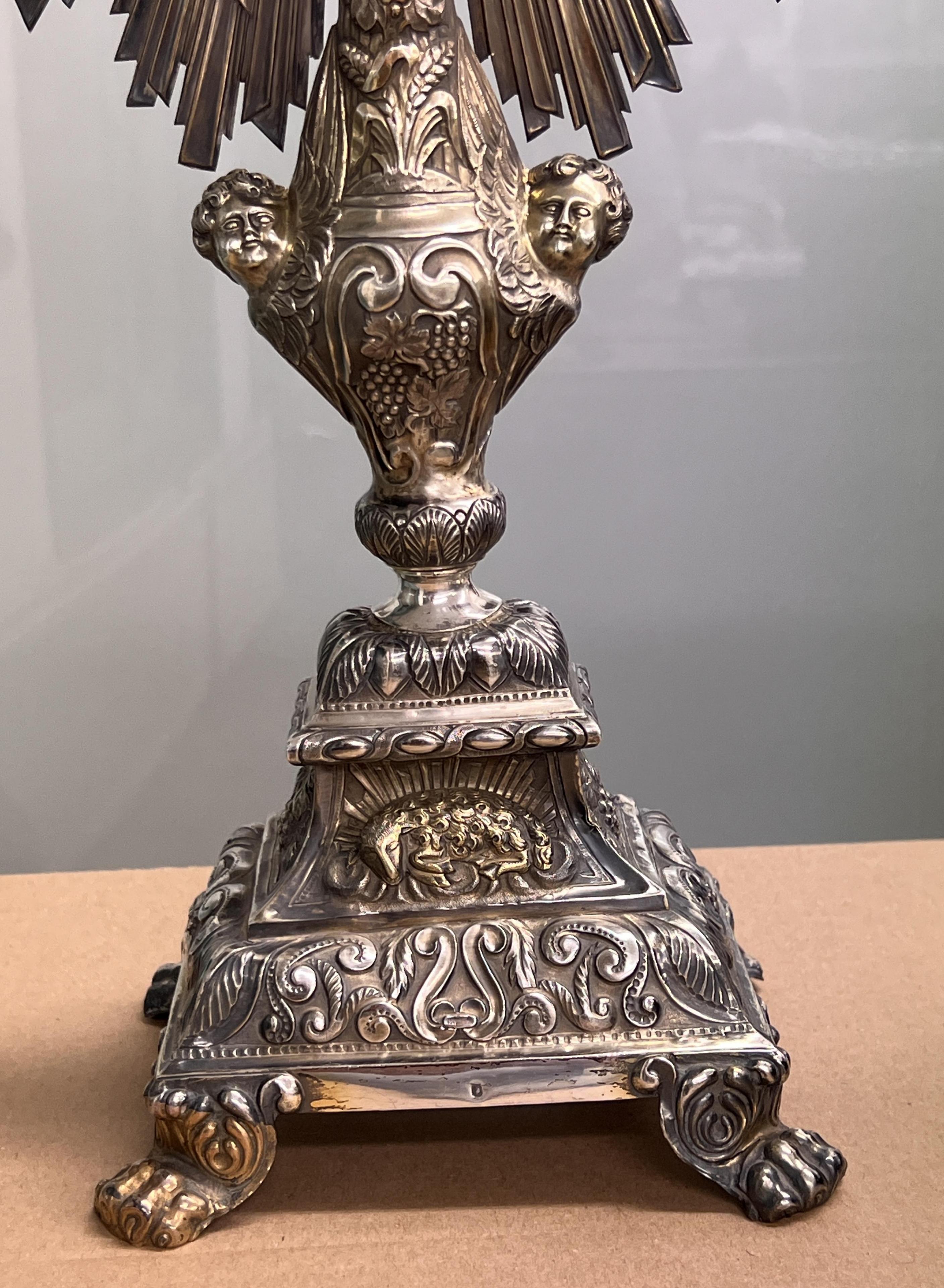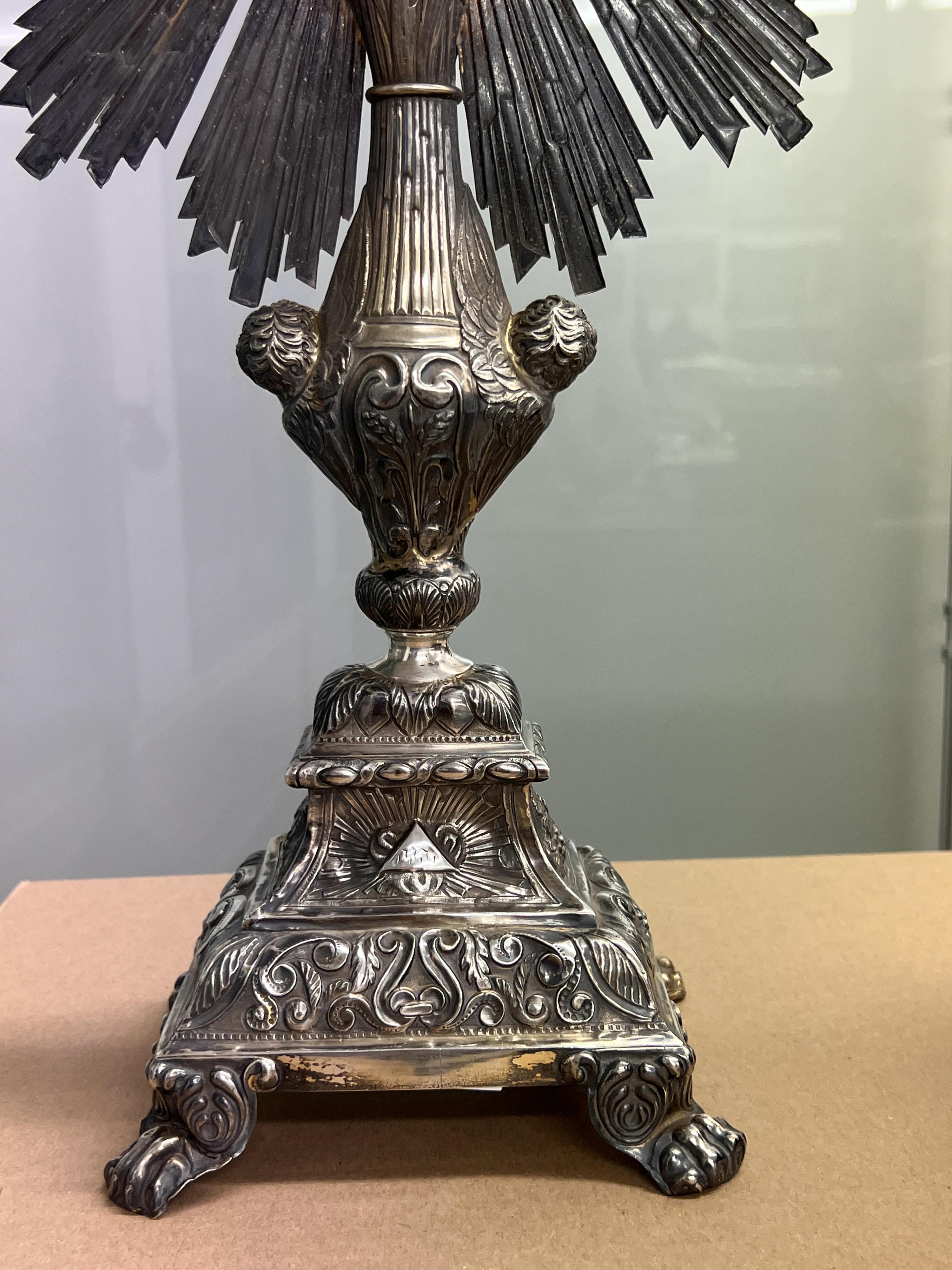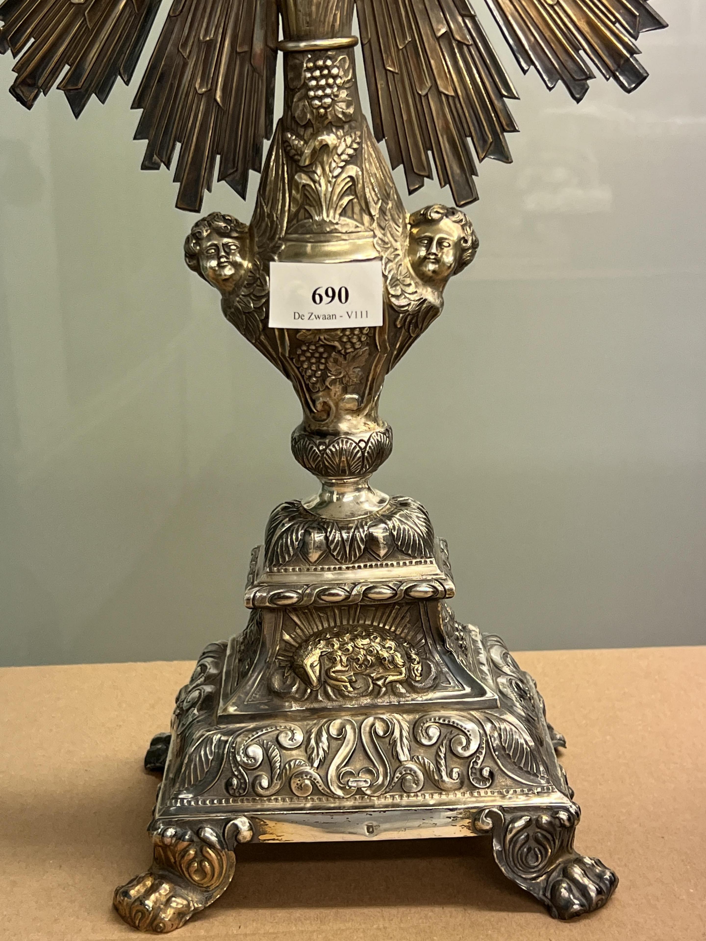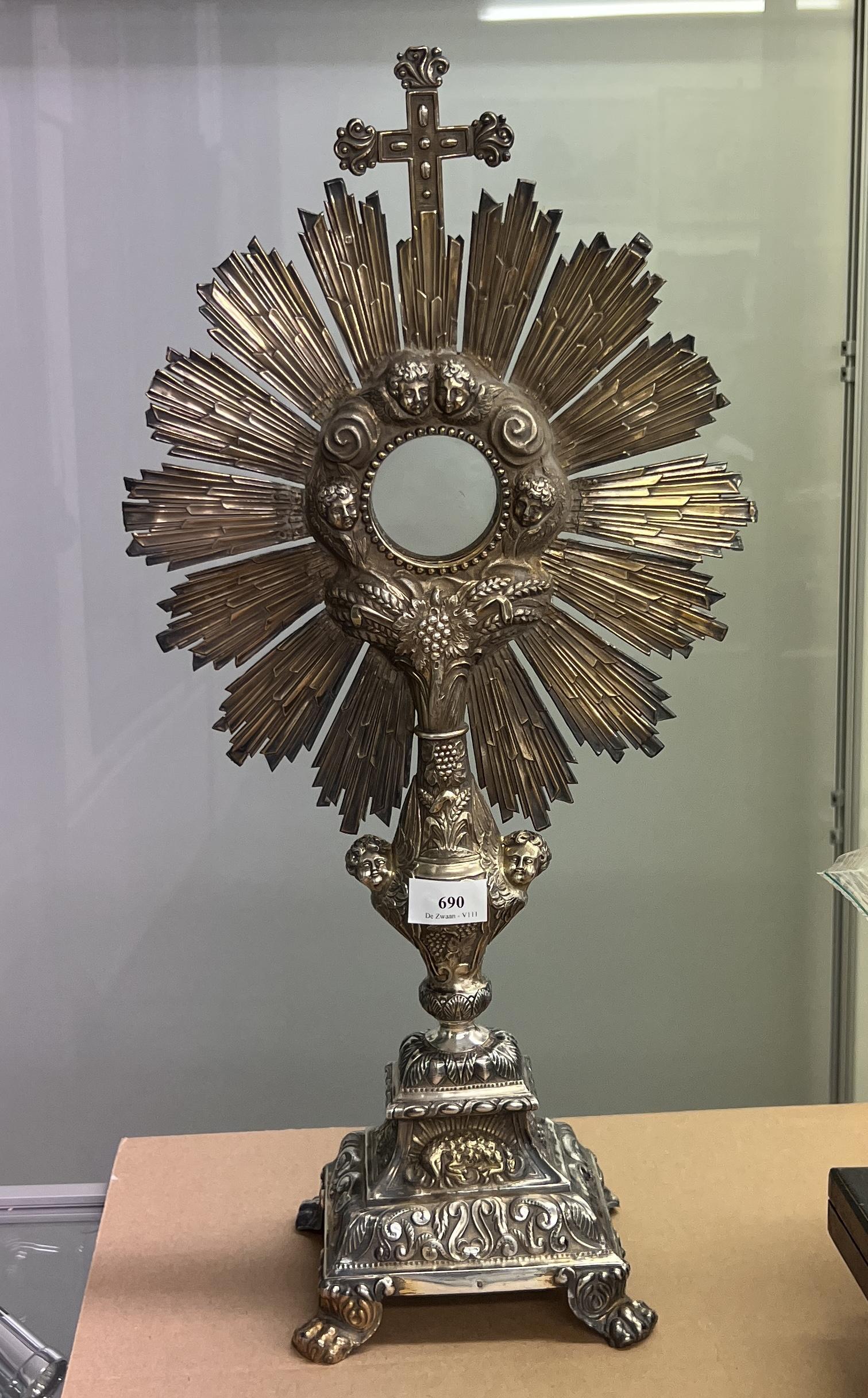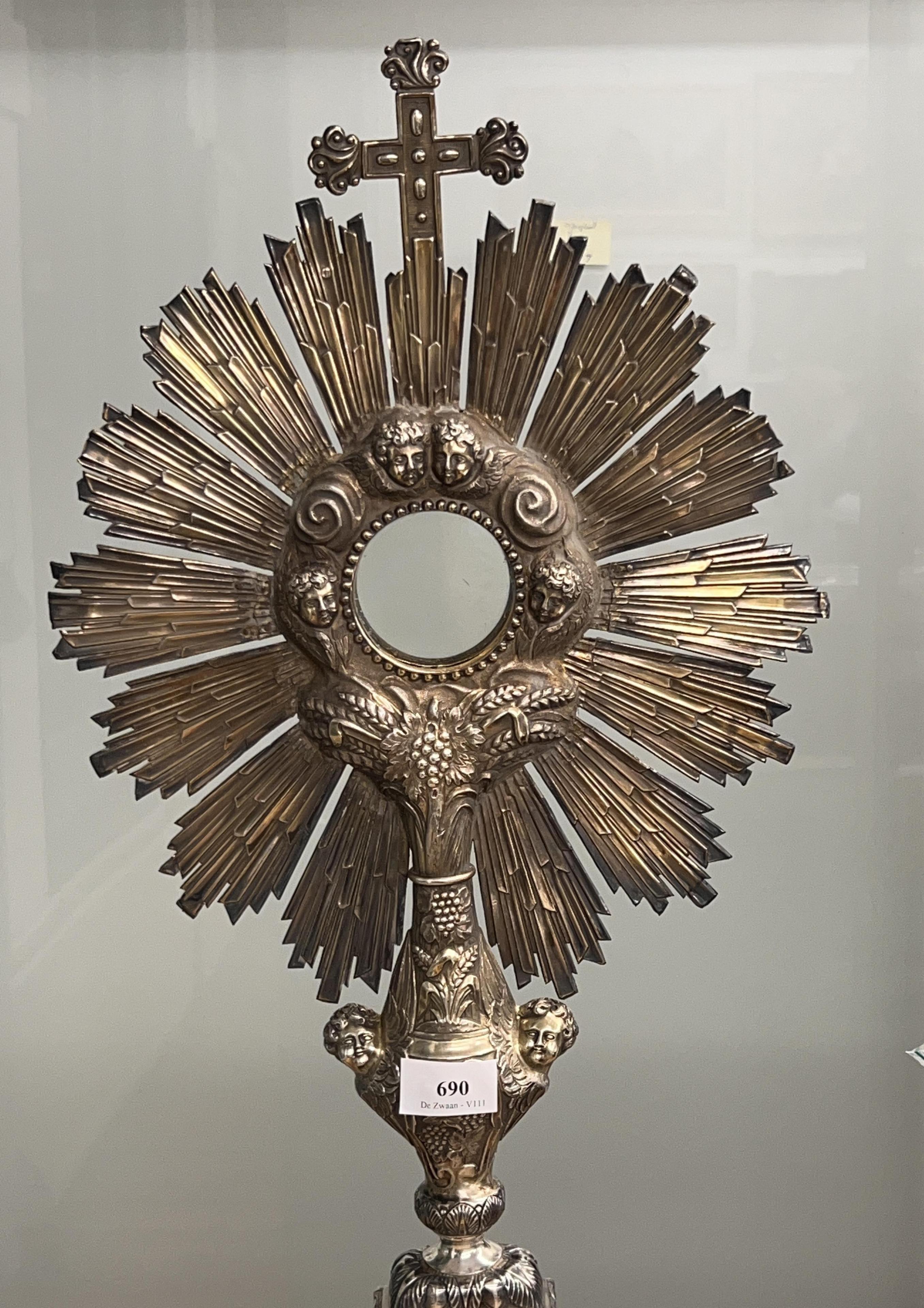 versierd met cherubijnen hoofdjes, agnus dei, vruchten-, blad- en andere decoratieve motieven, staand op leeuwenklauwpootjes, glazen ronde reliekhouder, mt. ruit met J takje en H(niet geïdentificeerd) waarschijnlijk Parijs, omgeving maker J.P.A. Dejean Parijs, gemerkt gehalte merk Minverva 1837-1846, 1e gehalte,
