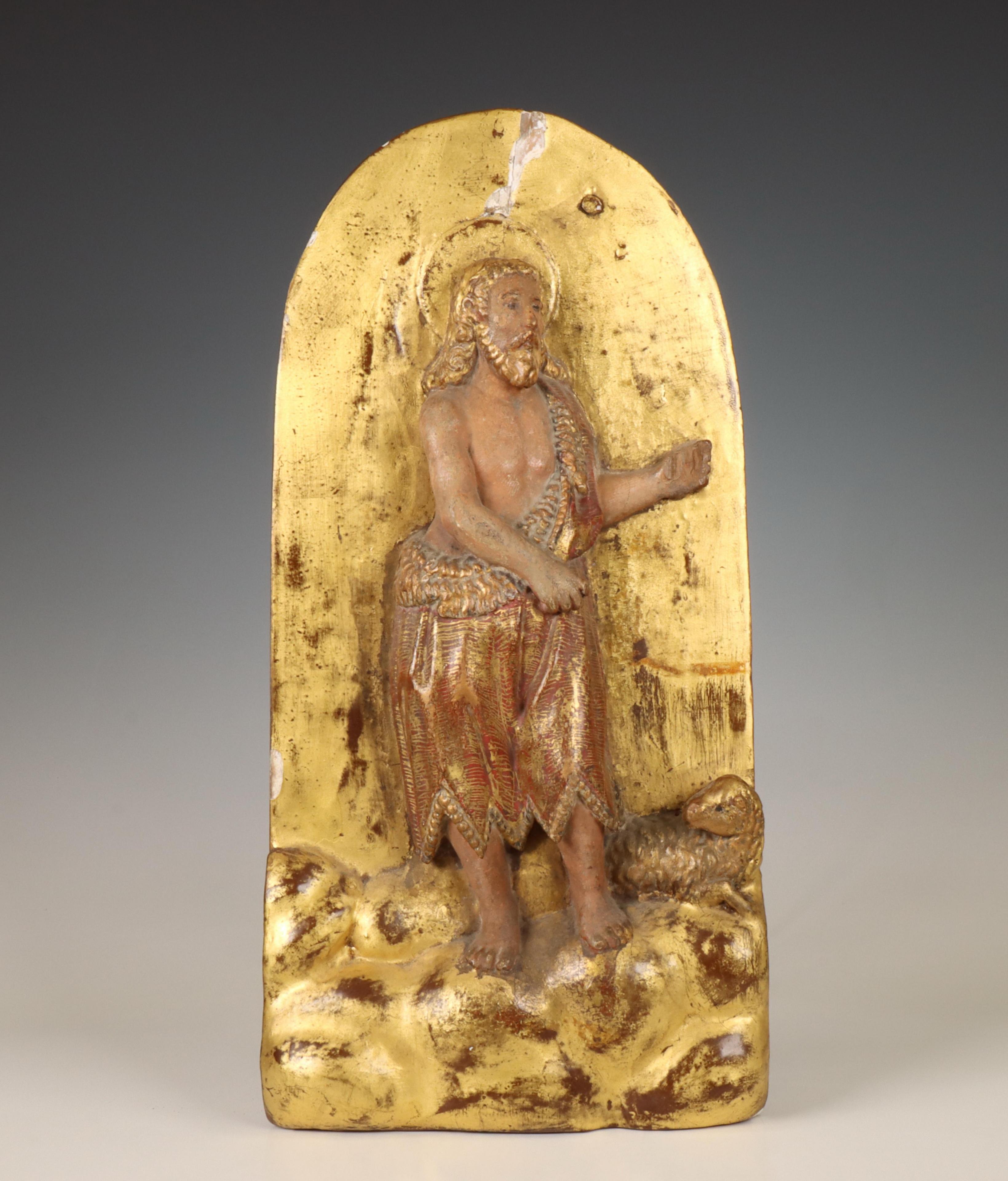 Frankrijk, verguld gestoken houten plaquette voorstellende Johannes de Doper, 18e/19e eeuw;