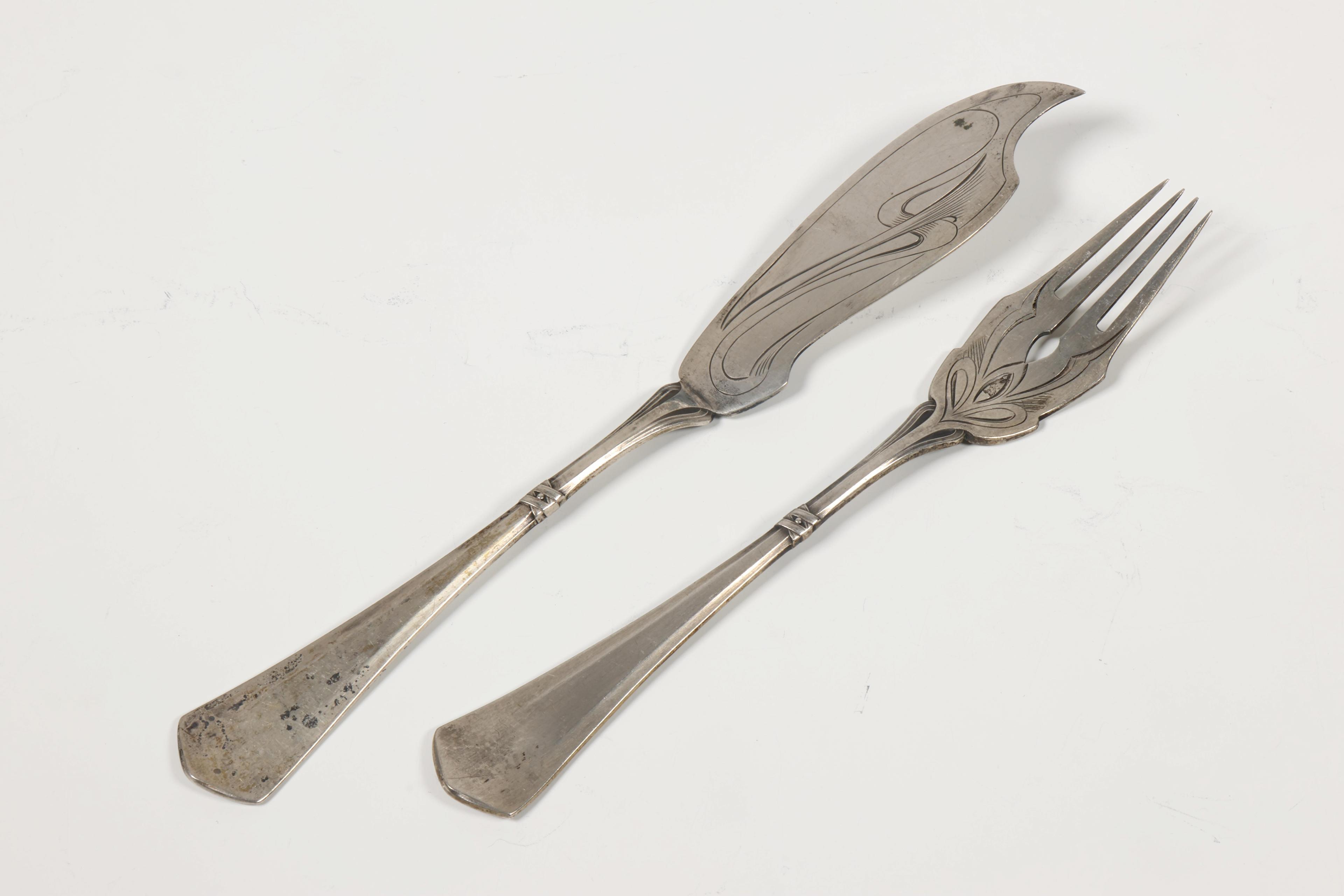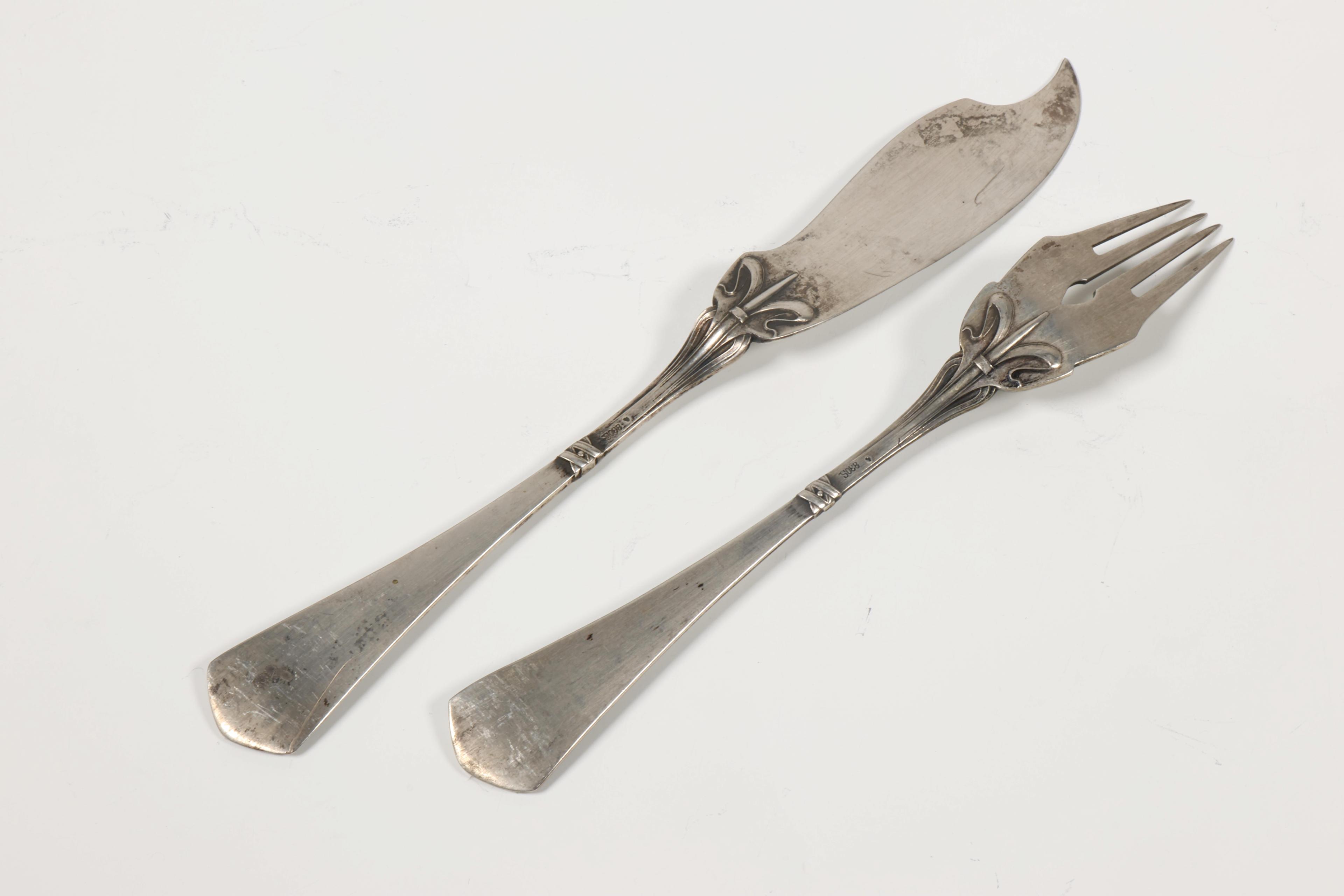 met zweepslag motieven, gemerkt 830s, 2e gehalte, en belastingstempel gearceerde I, en paar vorken en paar theelepeltjes met lettermonogram en gravure 25 dec 1907,
