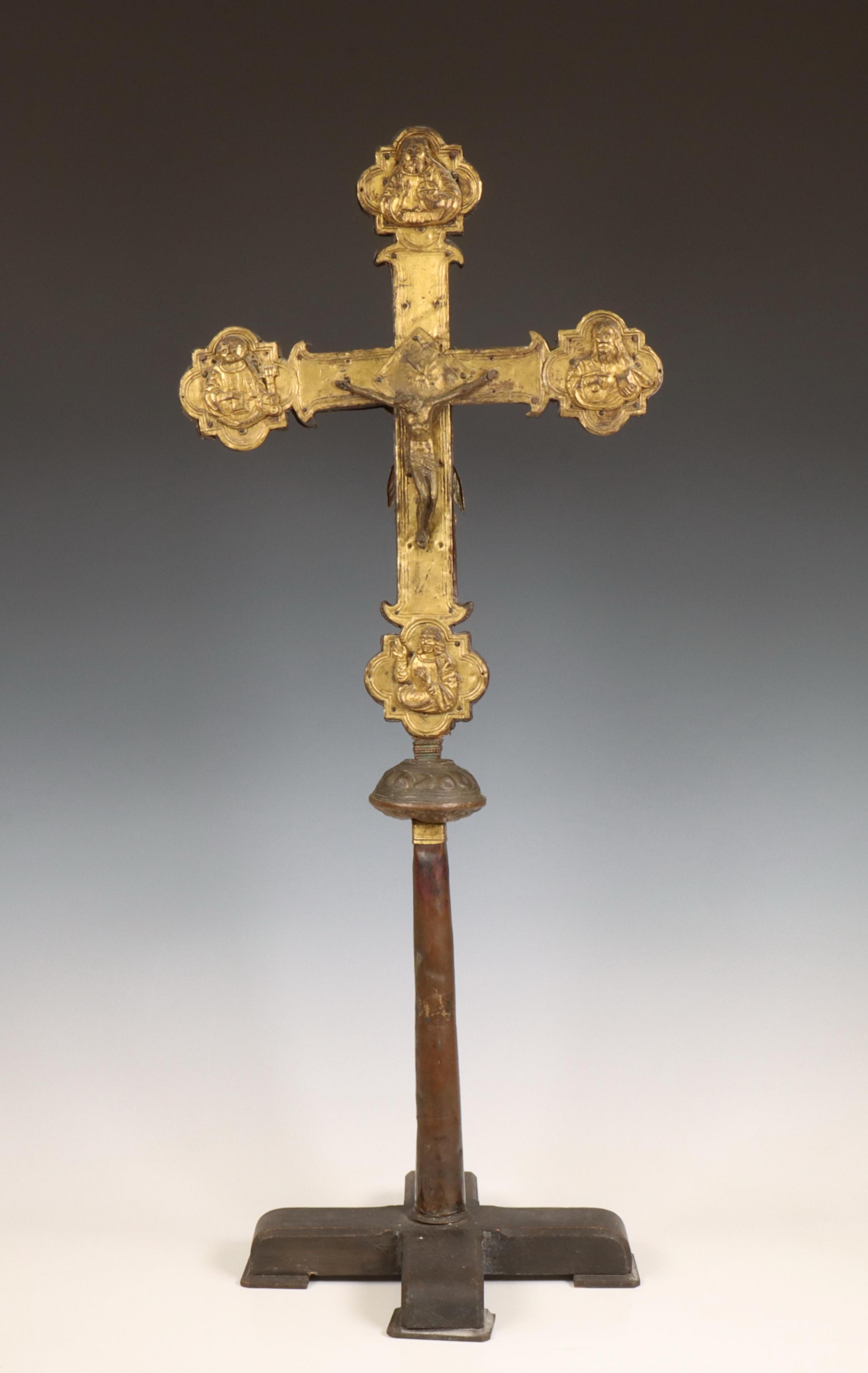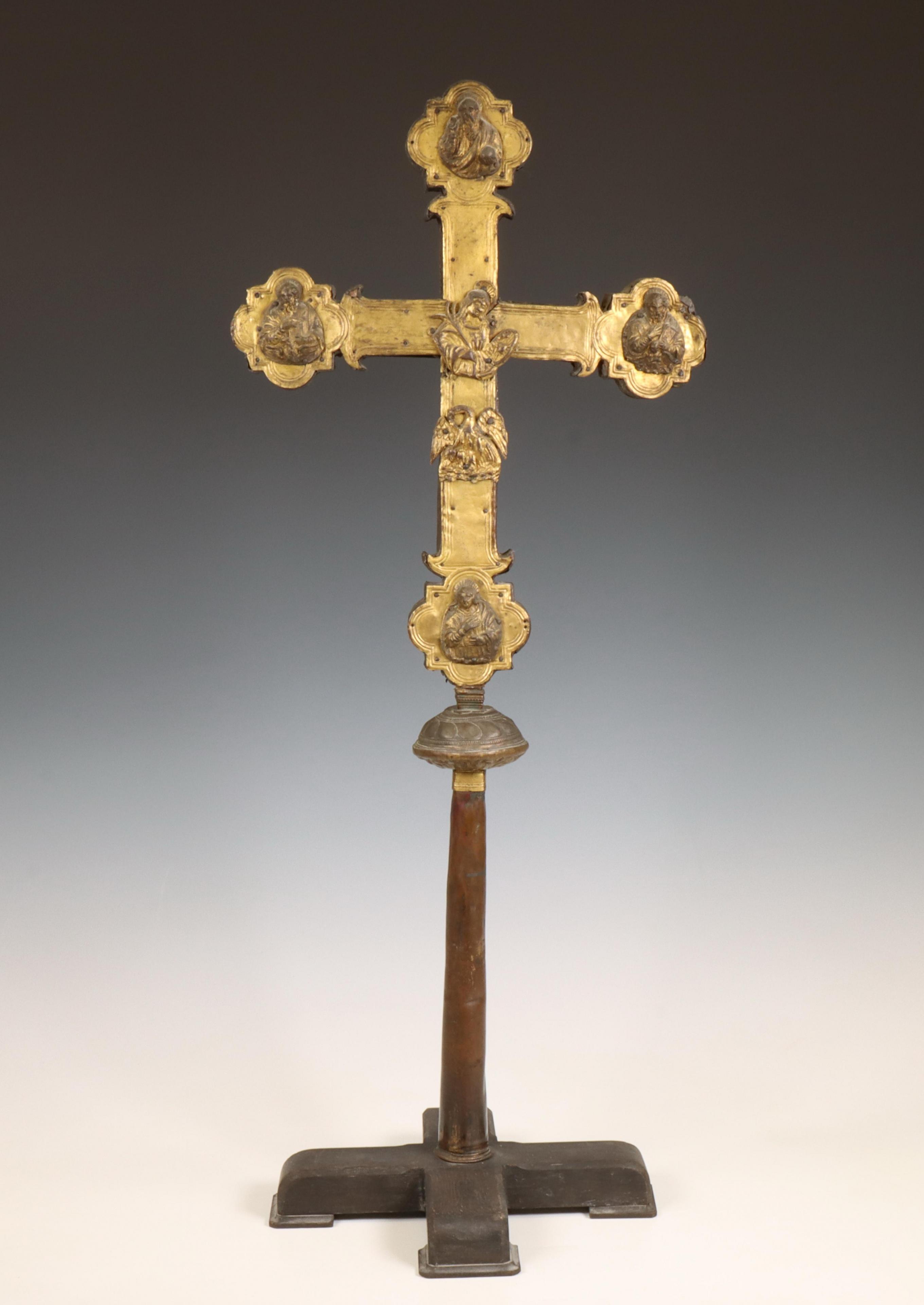 Het houten kruis opgelegd met latoenkoper, met gegoten appliques van heiligen en Christus. Staande op gelobte bol, het geheel op houten latere voet.