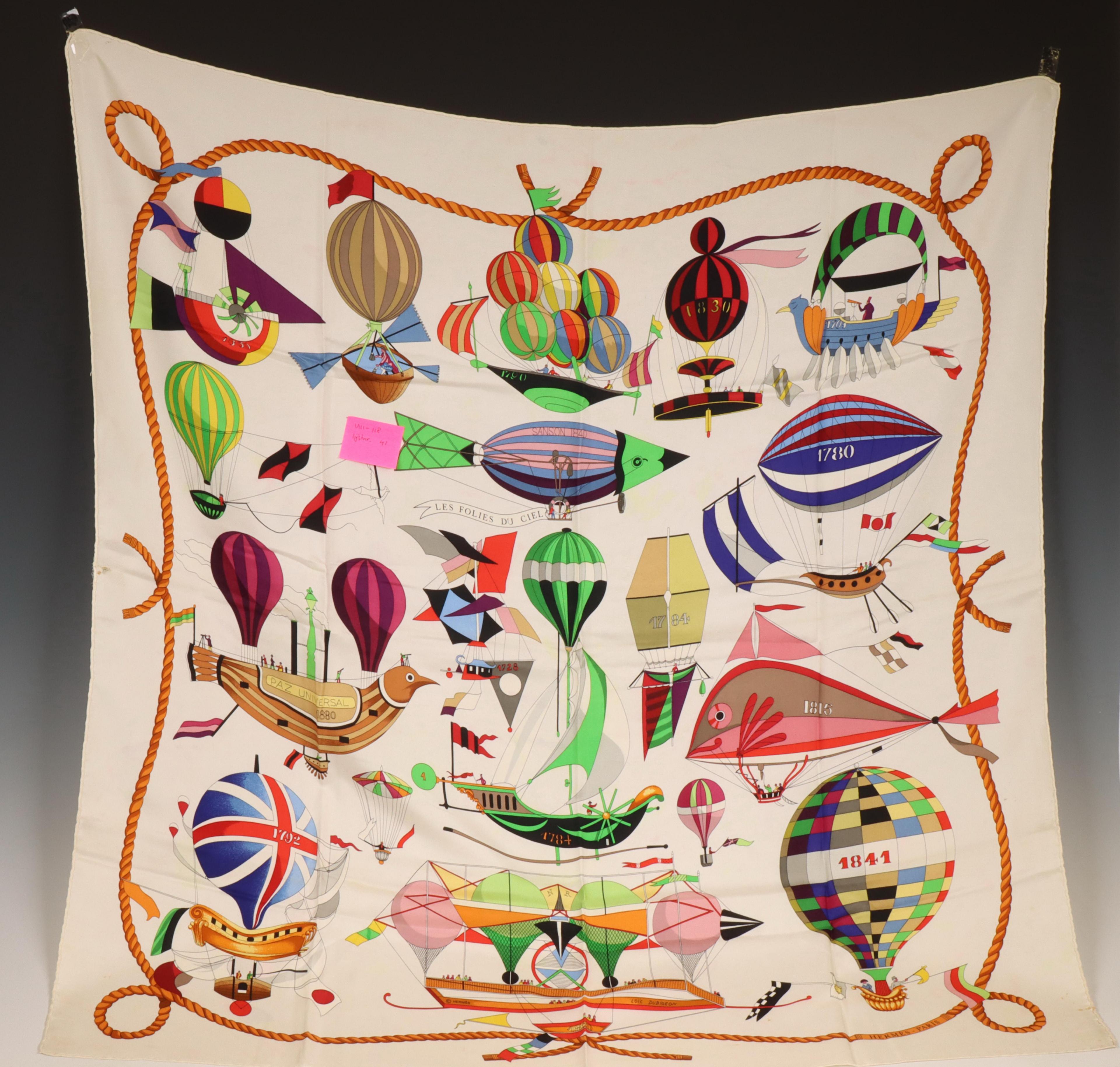 zijden shawl met voorstelling van luchtballonen. Ontwerp door Loic Dubigeon (vlekjes, reparatie).