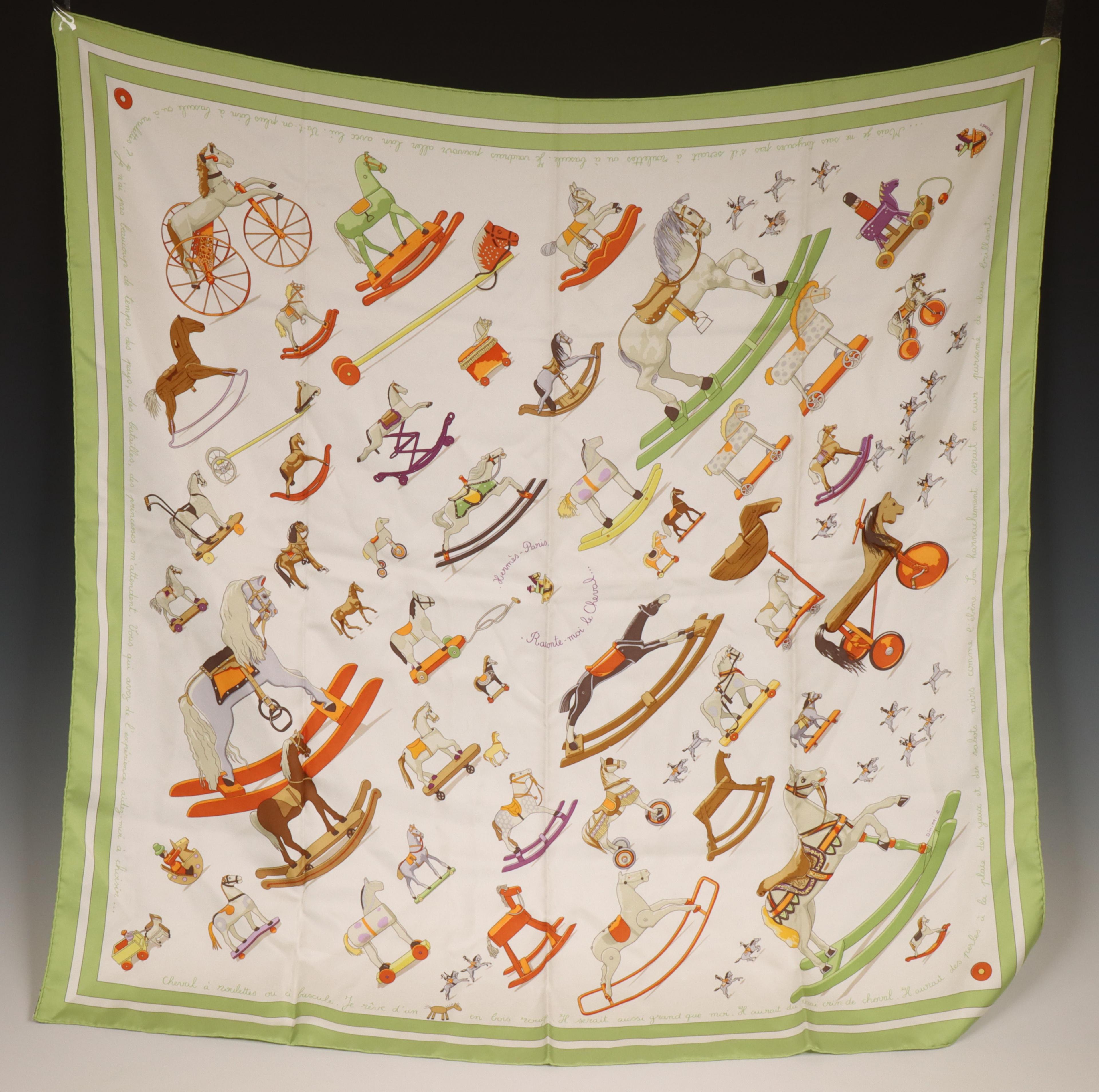 zijden shawl met voorstelling van hobbelpaarden. Ontwerp Dimitri Rybaltchenko