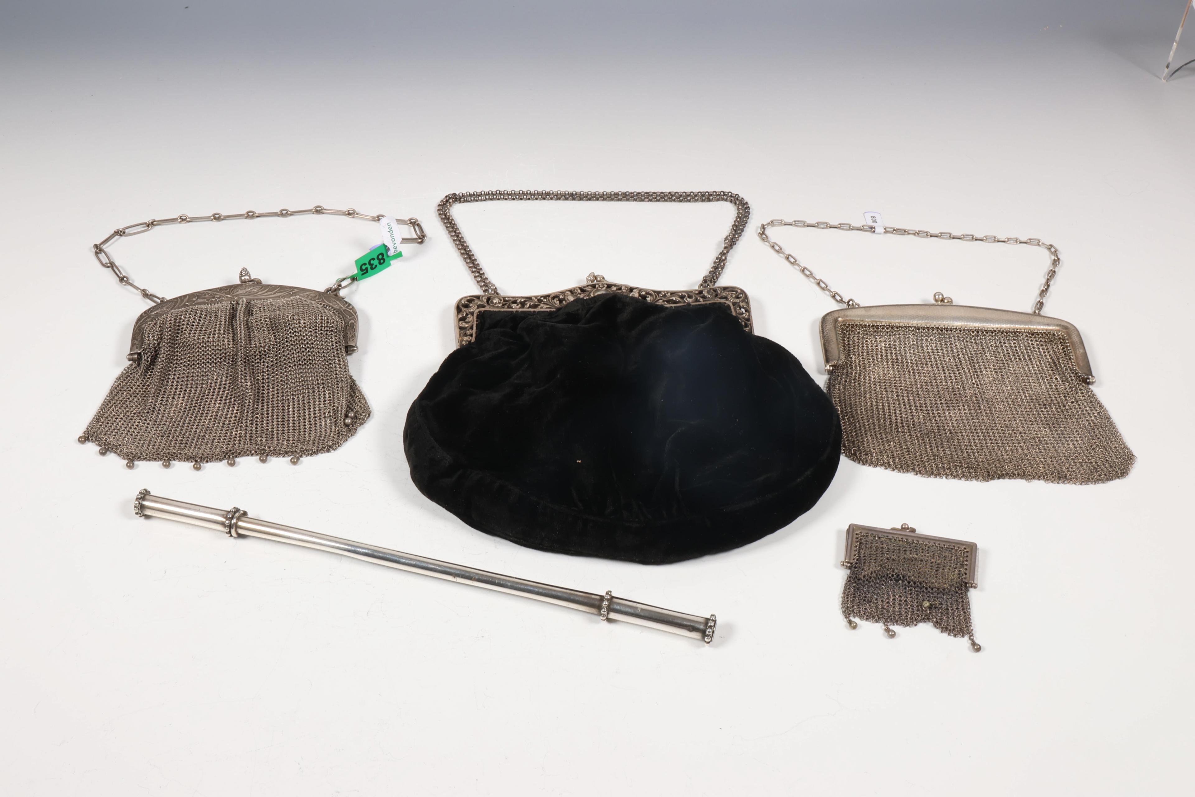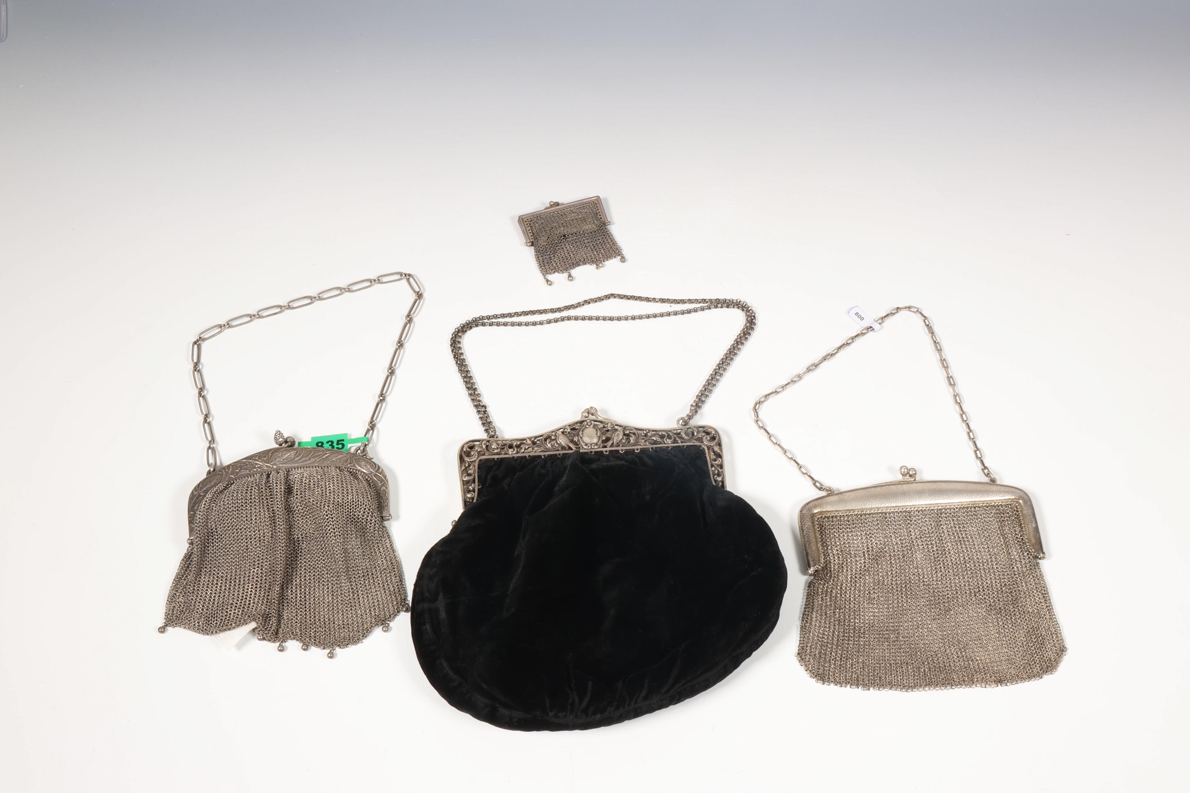 Ajour tasbeugel met fluwelen tas, 19e eeuw en Duitsland twee maliënkolder tasjes, Jugendstil en Art Deco,